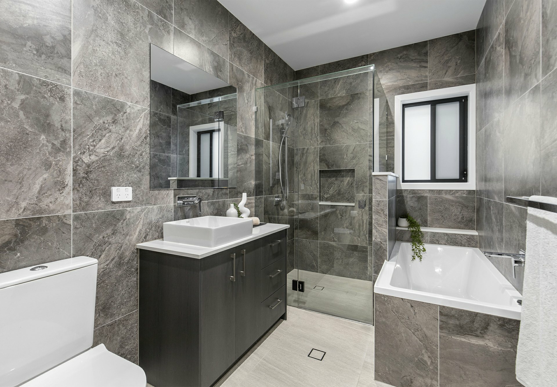 Downstairs, hybrid flooring spans an open study area and 4 beds - 3 with BIRs, the master equipped with a WIR and a divine ensuite with floor-to-ceiling tiles, a twin vanity, and craftily concealed shower and toilet. The second bathroom down here is equally elegant, adding a tub to the mix.
