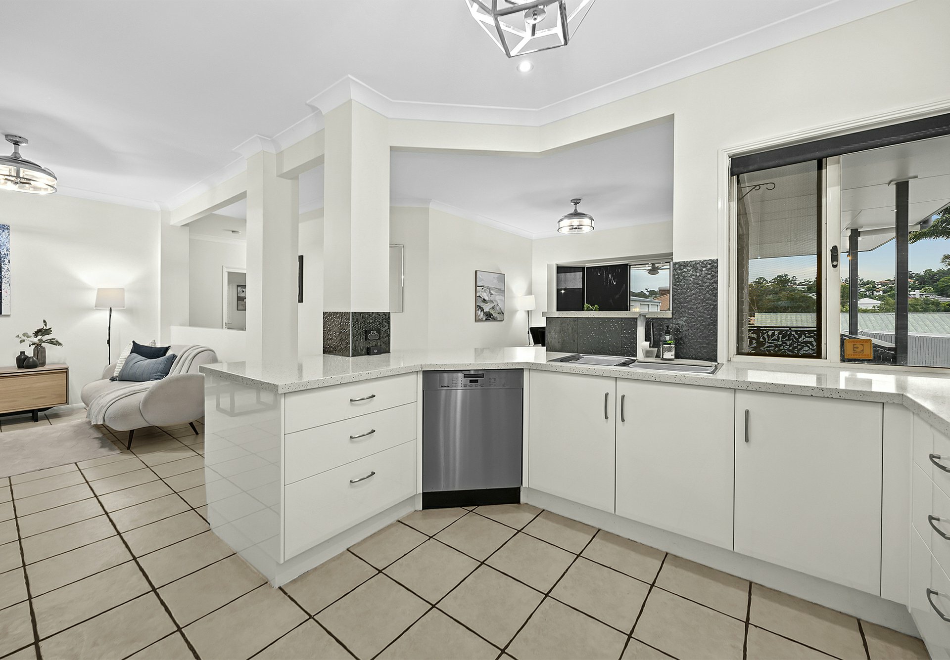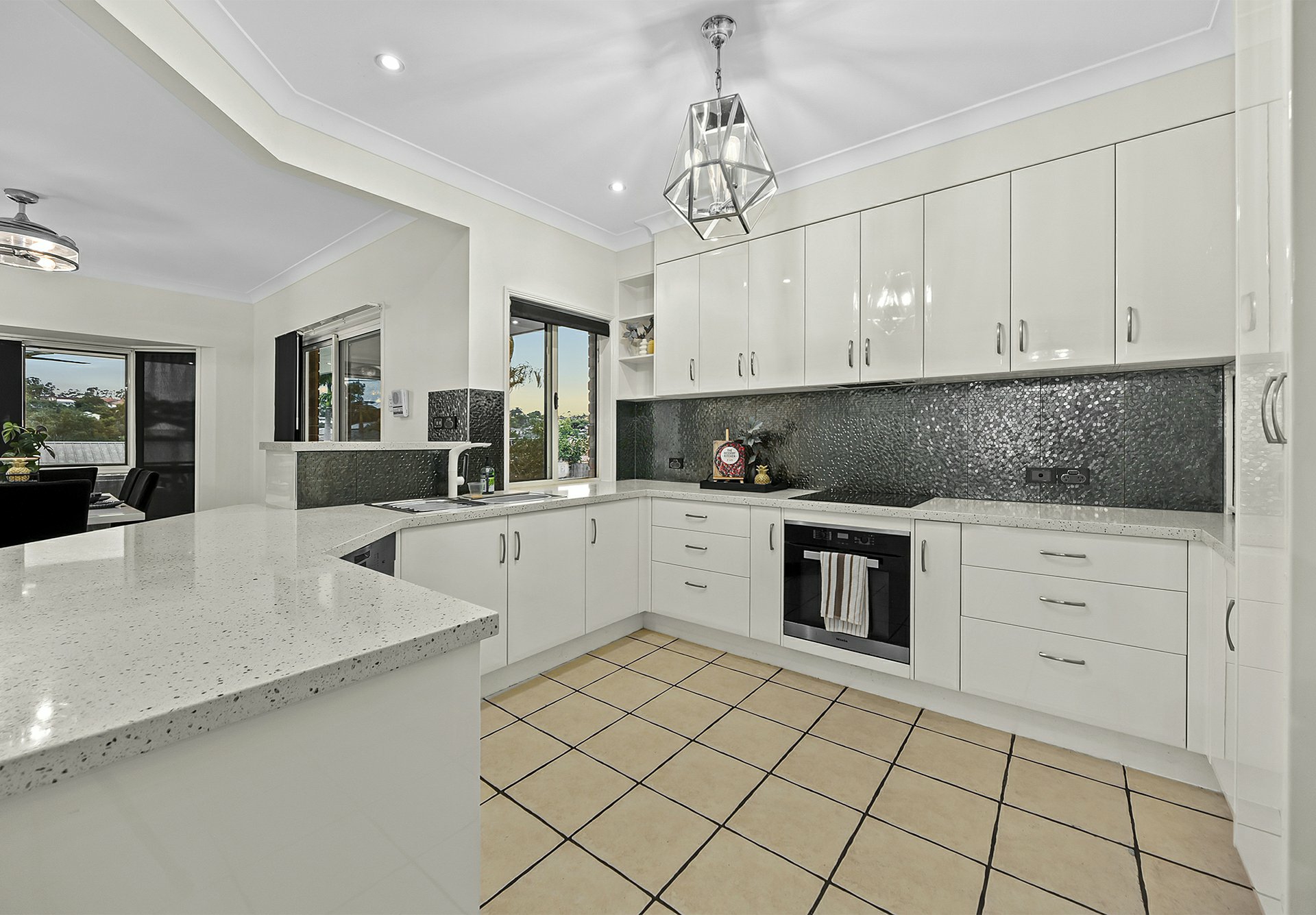 The kitchen serves as the bright, social heart of the home, flowing naturally into the dining area for easy family meals, featuring a practical wrap-around breakfast bar, sleek white cabinetry, and quality stainless steel appliances.