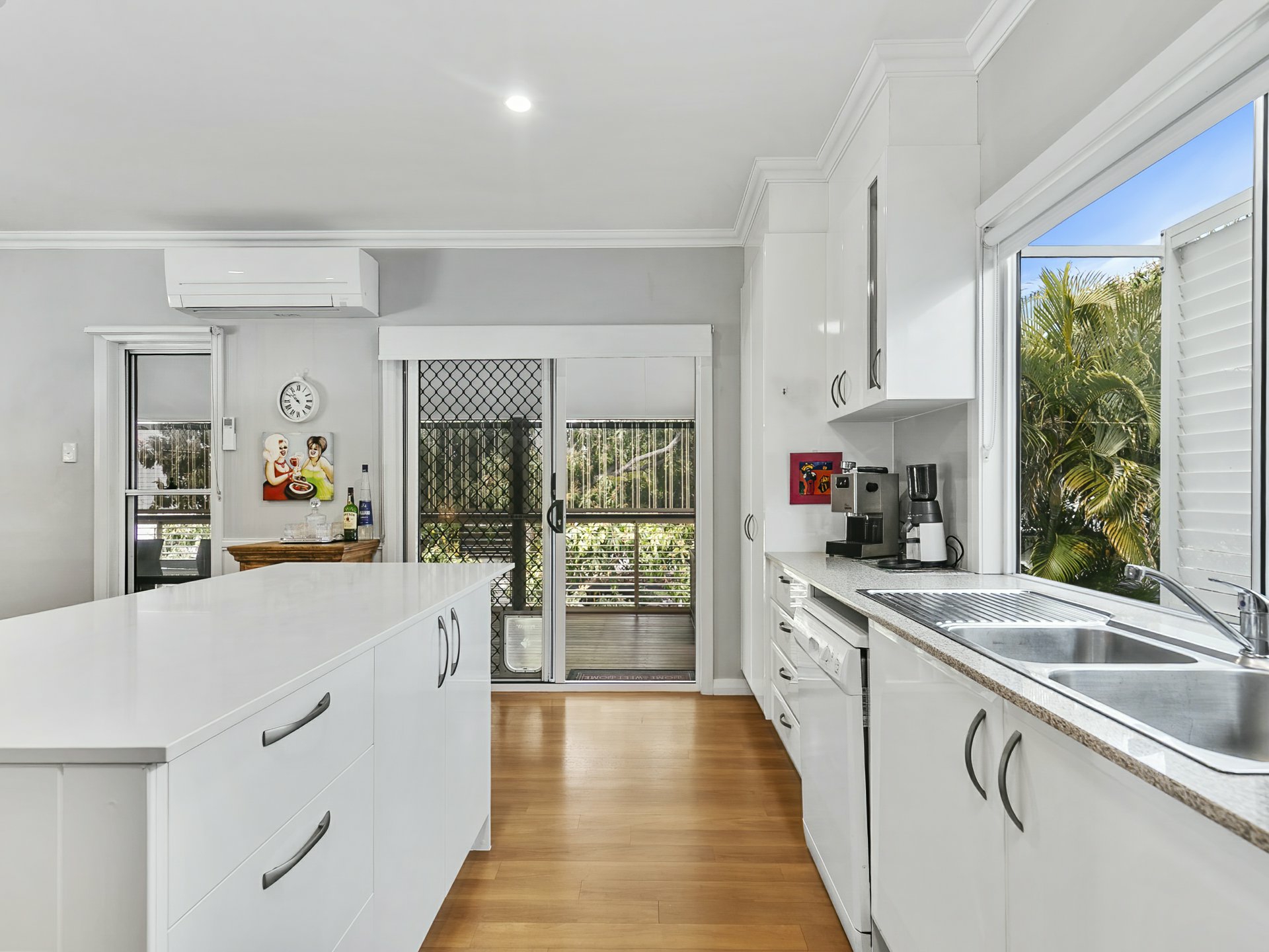 Open plan kitchen and living - Air con and ceiling fans with access to wrap around upper deck