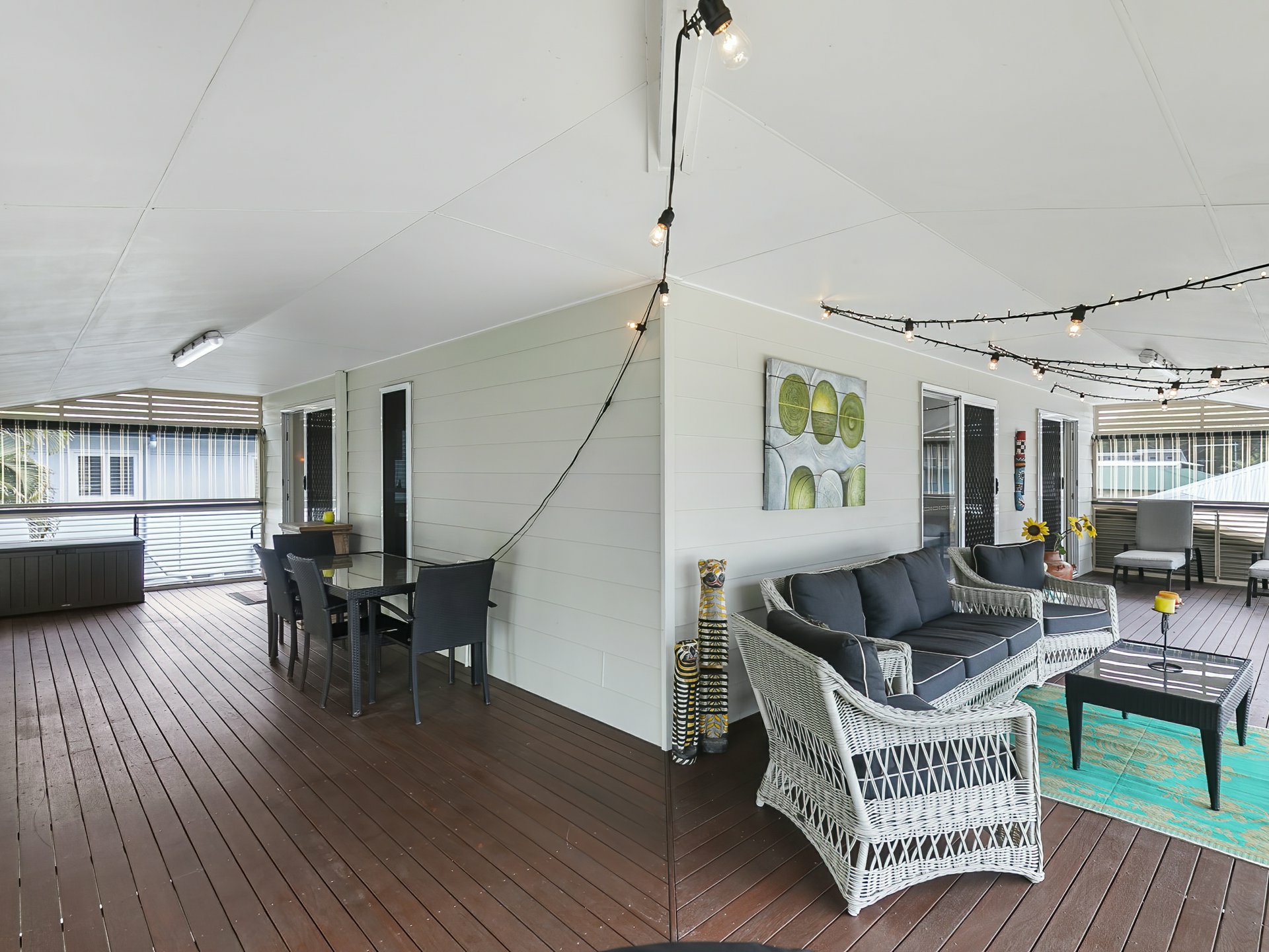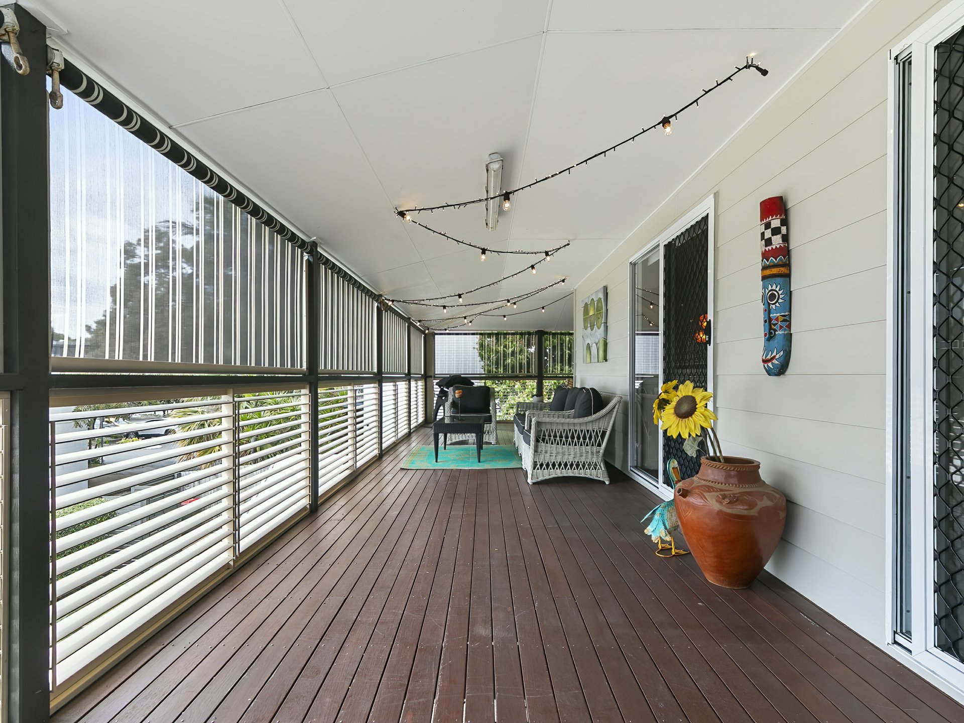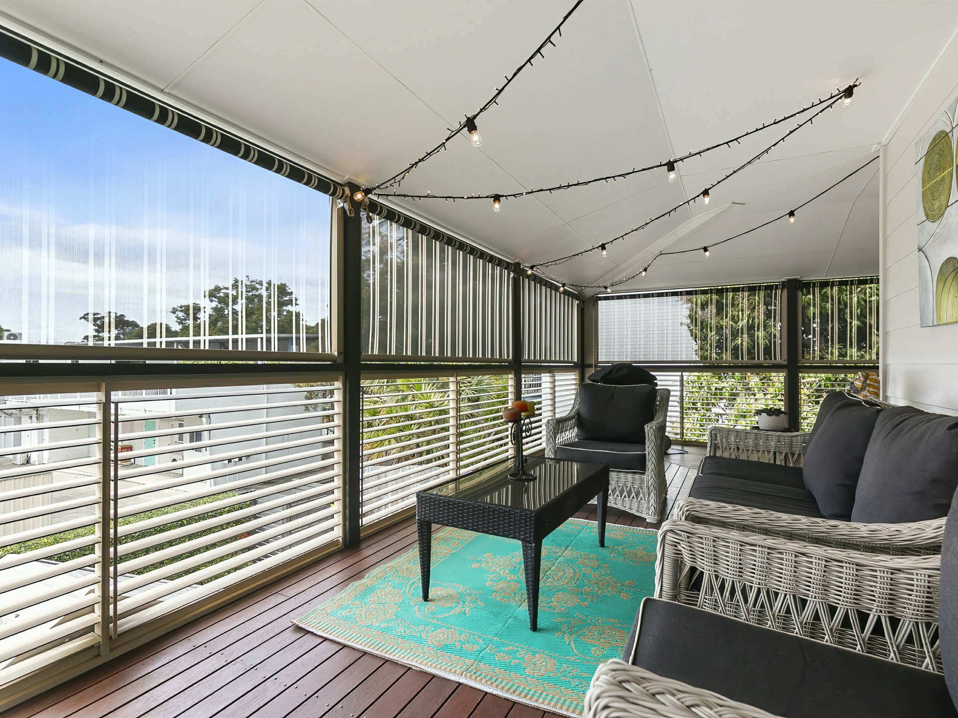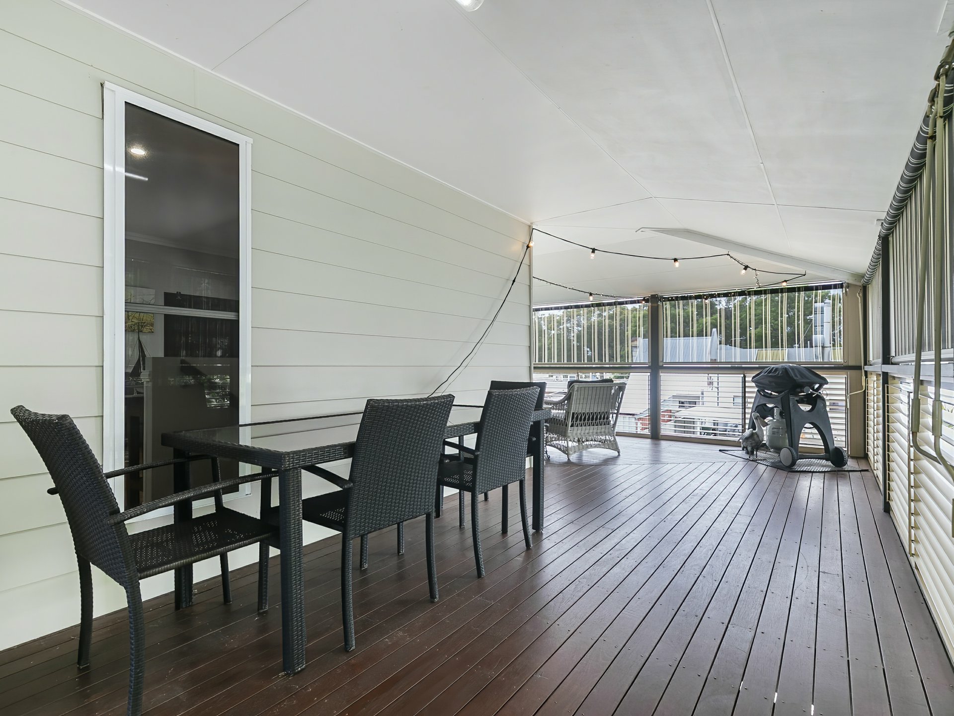 Timber deck - Large, plantation shutters, privacy wind down shades, power, lighting, festoon lights