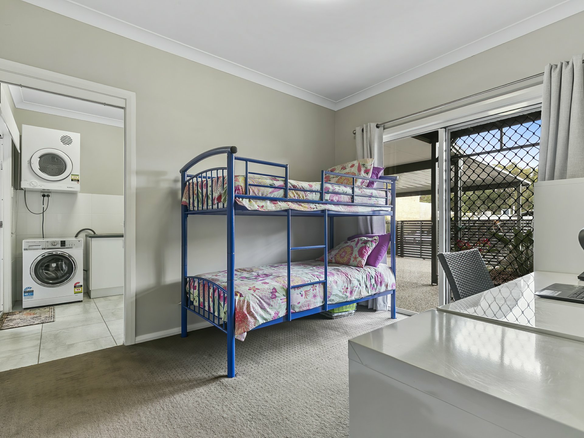 Bed 3 - Access to side patio - built in robes, ceiling fan, carpet, blinds on windows and sliding doors