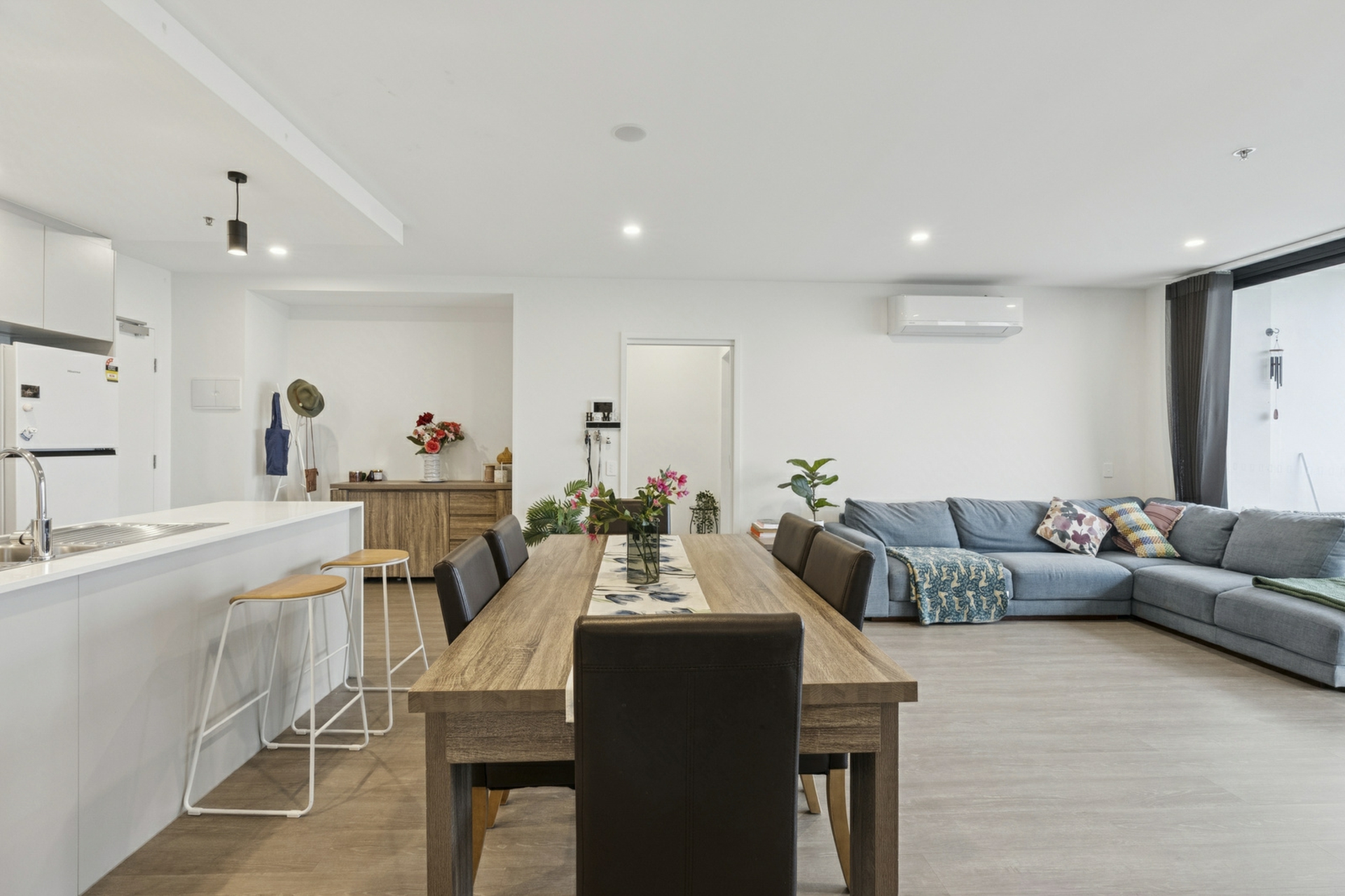 At the center of the home, the modern kitchen impresses with premium SMEG appliances, a stone waterfall island bench, soft close cabinetry, and ample storage, perfect for everyday living and entertaining alike. The living area flows effortlessly onto a generous private balcony, creating the perfect setting to relax, host guests, and enjoy elevated district views.