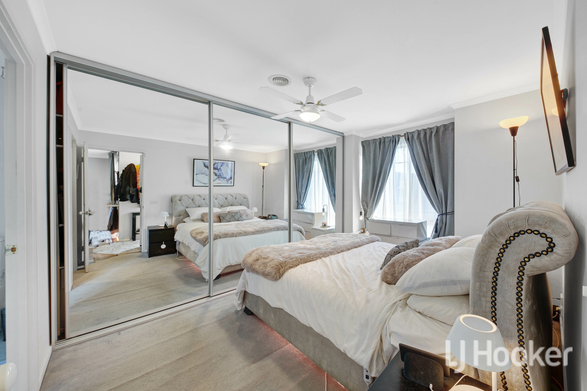 The master bedroom offers substantial storage, featuring full-width sliding mirrored wardrobes in addition to a walk-in wardrobe, providing exceptional convenience and functionality.