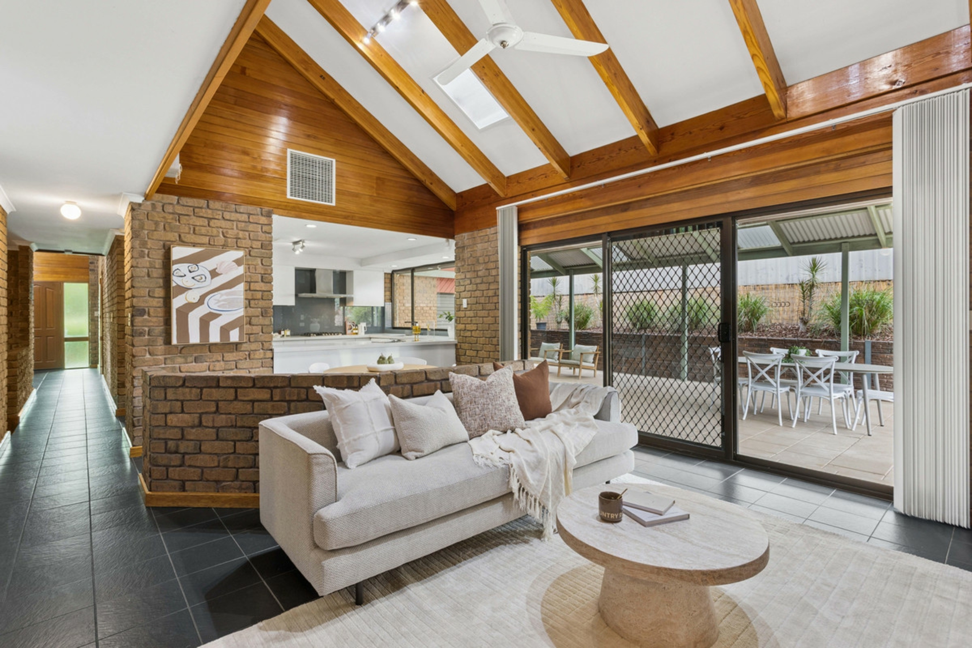 Flowing seamlessly from the kitchen, the family room opens out to a generous outdoor entertaining area beneath a pitched pergola. This inviting space is ideal for year-round entertaining, from relaxed weekend barbecues to hosting family and friends in comfort and style.