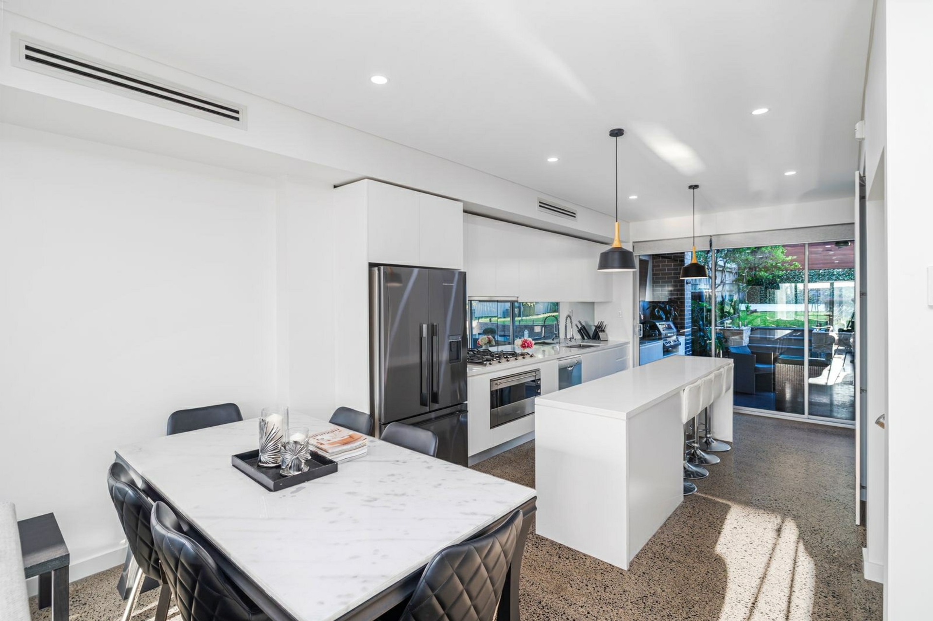Downstairs features polished concrete flooring, a spacious lounge and dining area, and a designer kitchen equipped with gas cooktop, oven, dishwasher and premium SMEG appliances. The home is enhanced by downlights throughout, ducted air conditioning, blinds, alarm system, a separate laundry, and the convenience of a powder room with toilet on the ground floor.