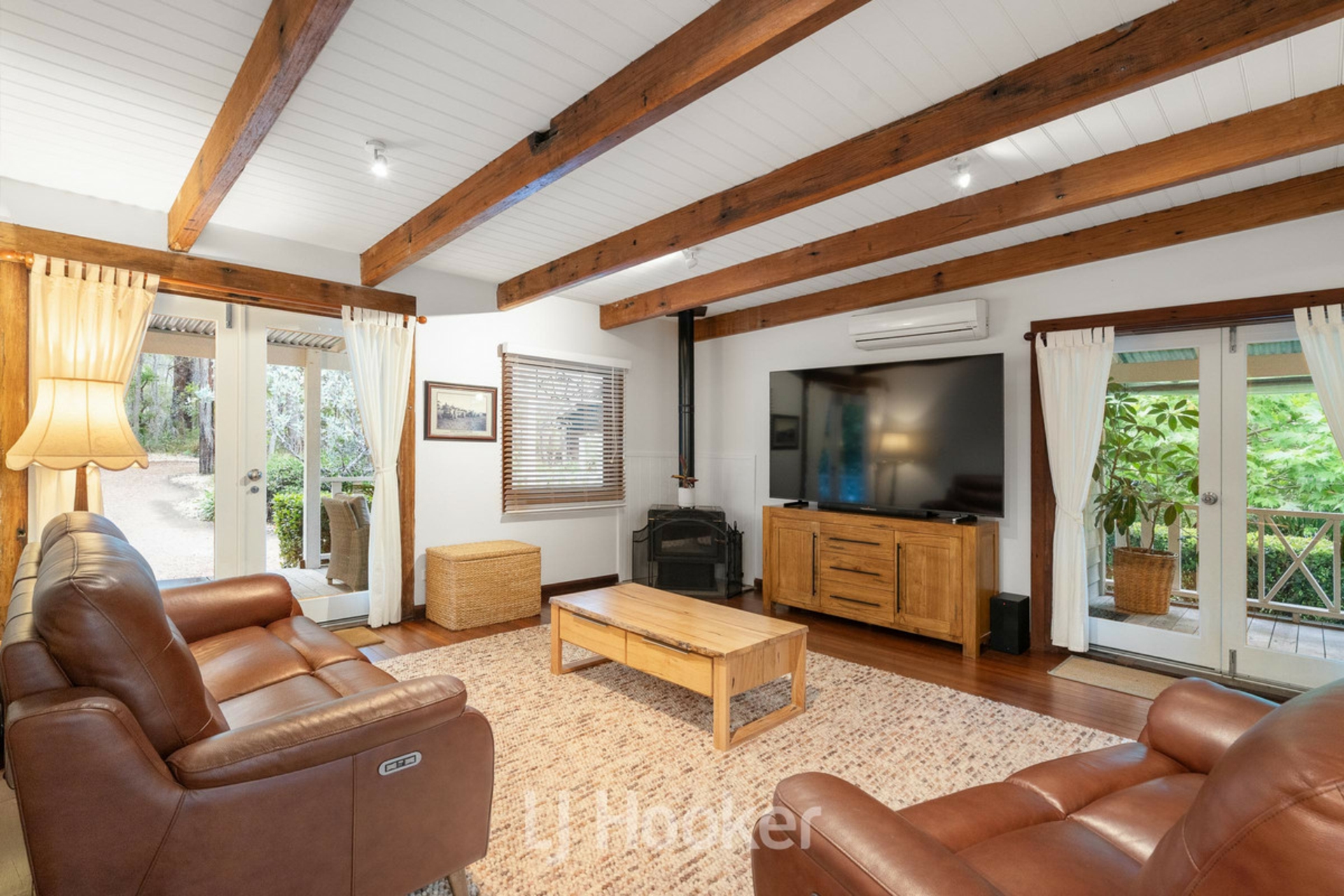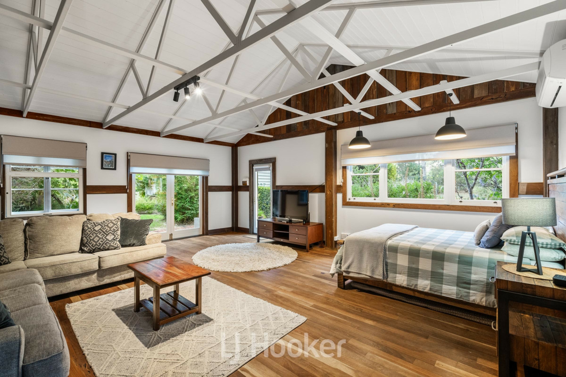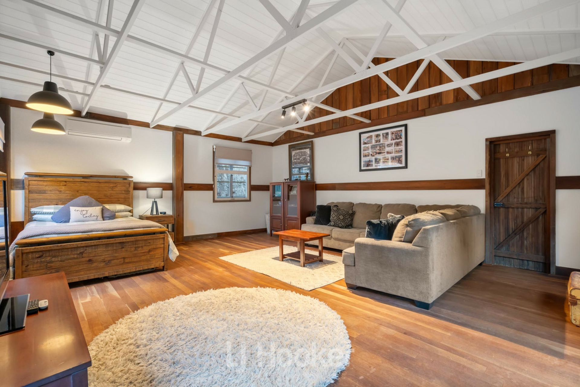 Separate from the home is a fully insulated 42sqm studio, currently set up as a guest retreat. With high pitched cathedral ceilings, jarrah floors, beautiful timber-framed windows, french doors that open up to lush green lawns and huge maple tree. A split system air conditioning completes this room.