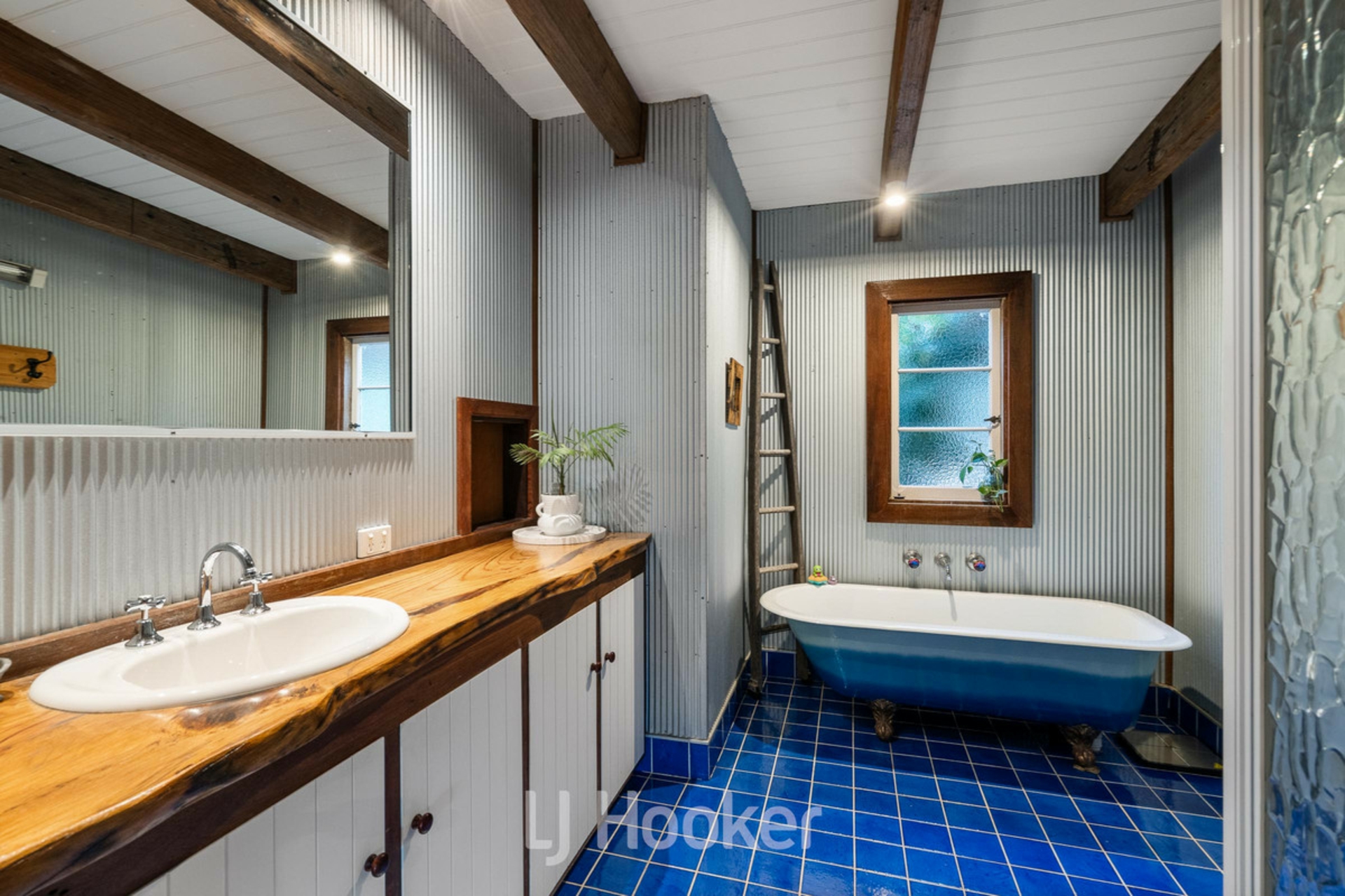 The bathroom continues the home's character charm with a marri benchtop, freestanding claw foot bath and large shower, with exposed timber ceiling beams and mini orb walls.