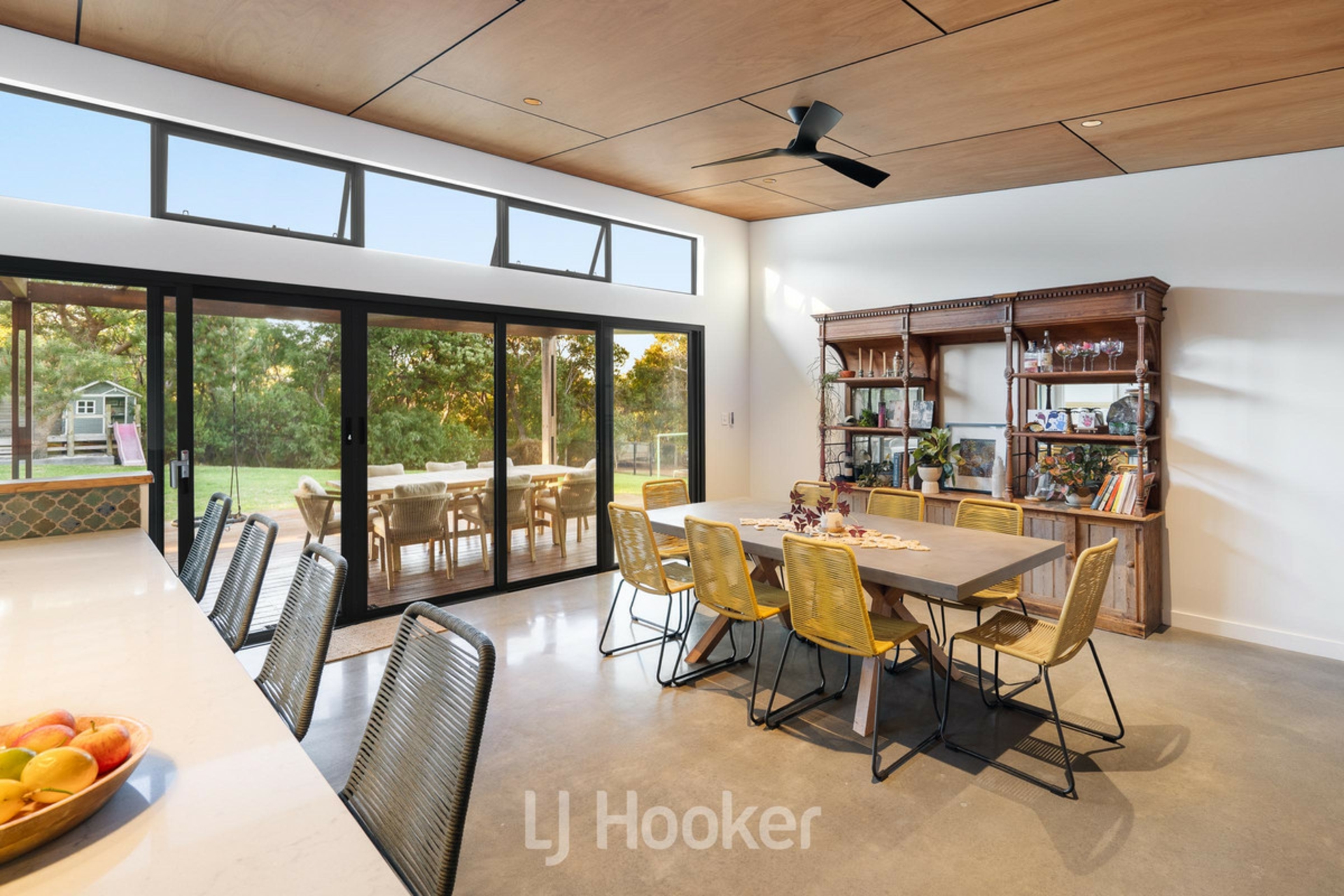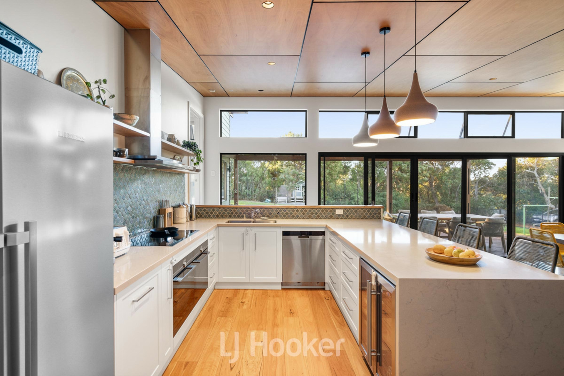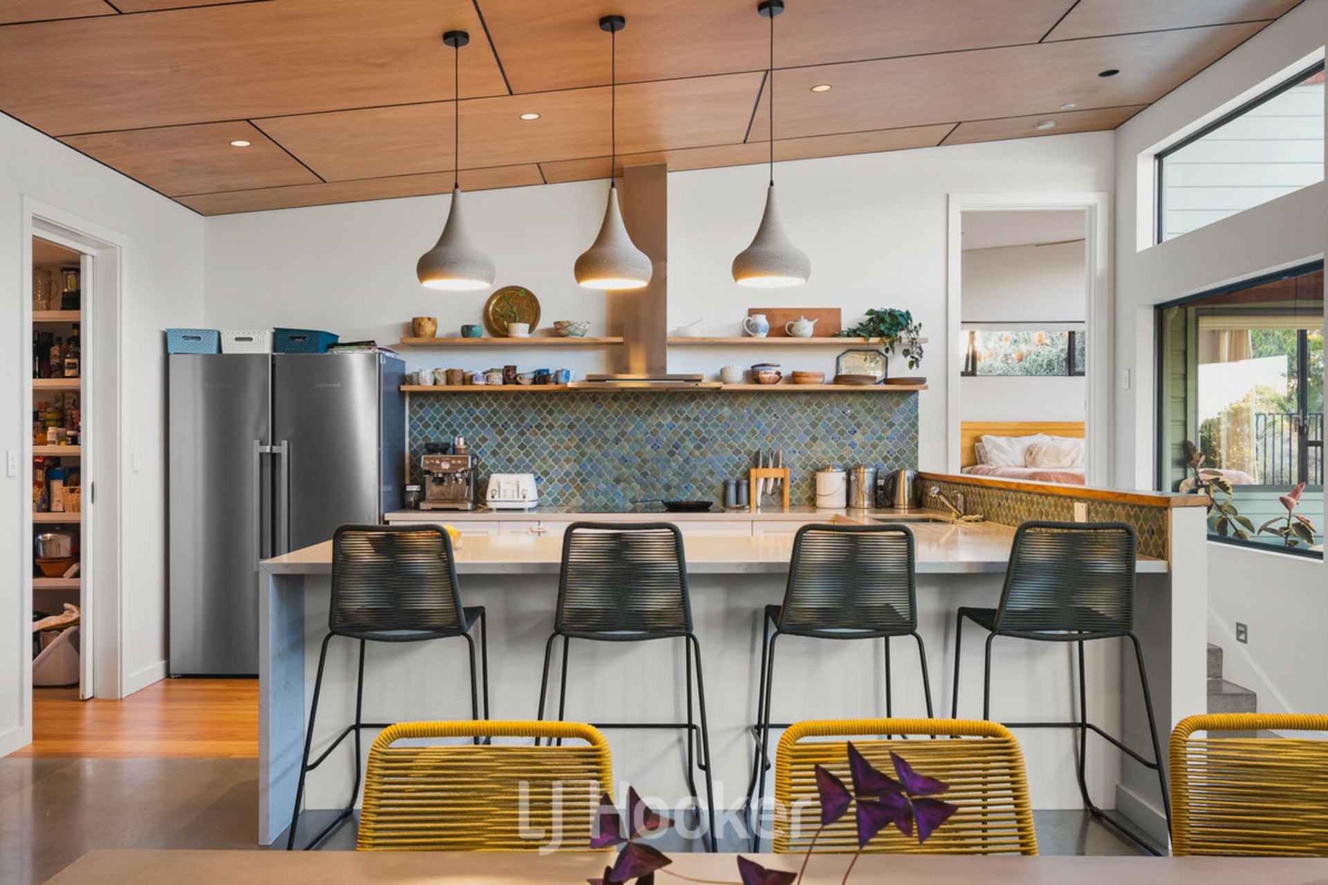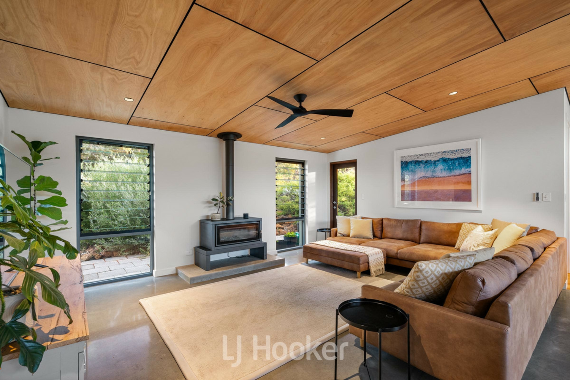 The split level design showcases polished concrete flooring and a cozy slow combustion fireplace for winter. At the heart of the home, a stunning kitchen features one of a kind handmade tiles - an artistic focal point that anchors the open plan living and dining zone. This is a space intentionally designed for connection, where family gatherings feel both intimate and effortless.