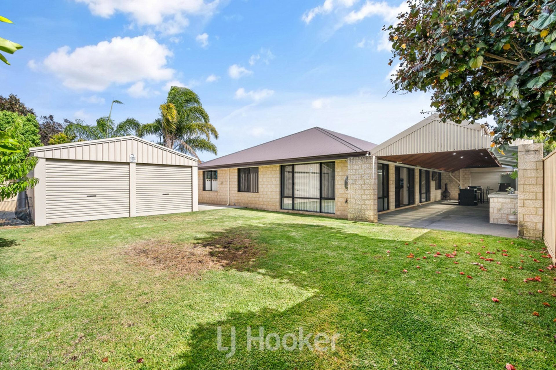 The double garage provides convenient through access, while the expansive outdoor area features a large patio ideal for entertaining, plus a substantial 5.6m x 5.6m shed for additional storage or workshop use.
