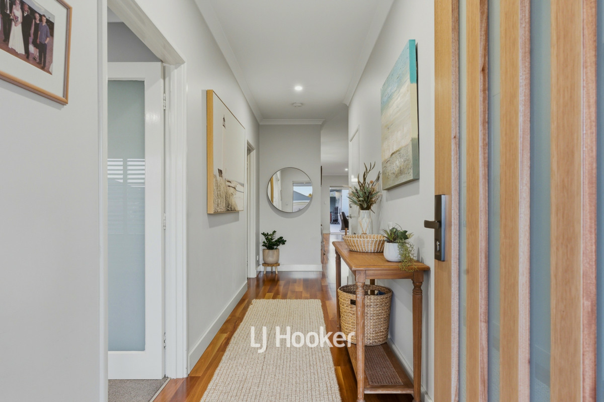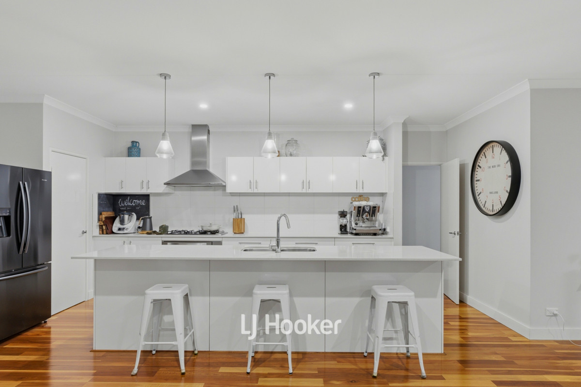 Step inside to discover a warm and inviting interior where natural light and quality materials create an immediate sense of home. The heart of the property is a well-appointed chef's kitchen featuring 900mm appliances, stone benchtops, walk-in pantry, double fridge recess, and breakfast bar, all overlooking the open-plan living and dining area enhanced by rich spotted gum flooring.
