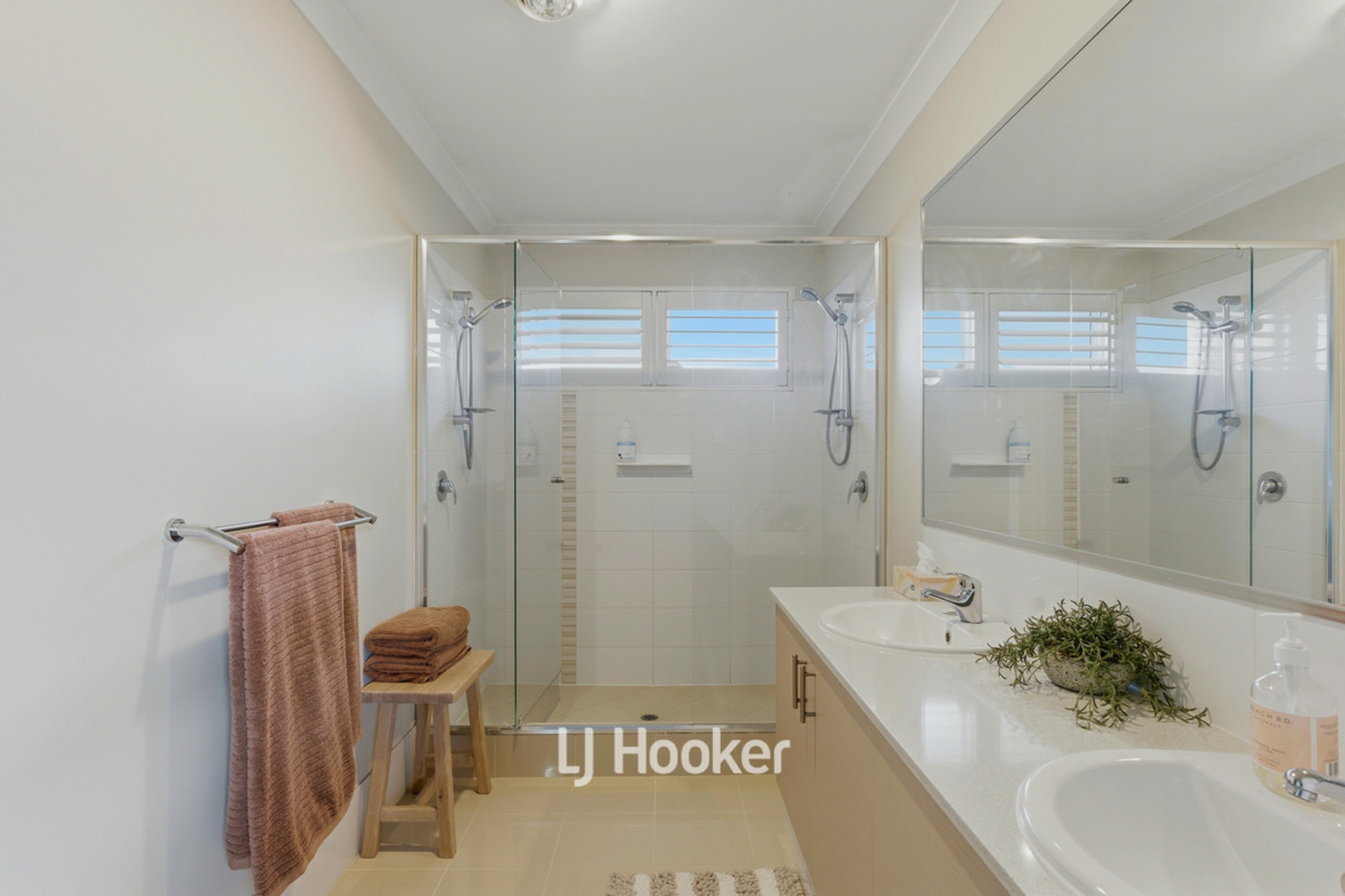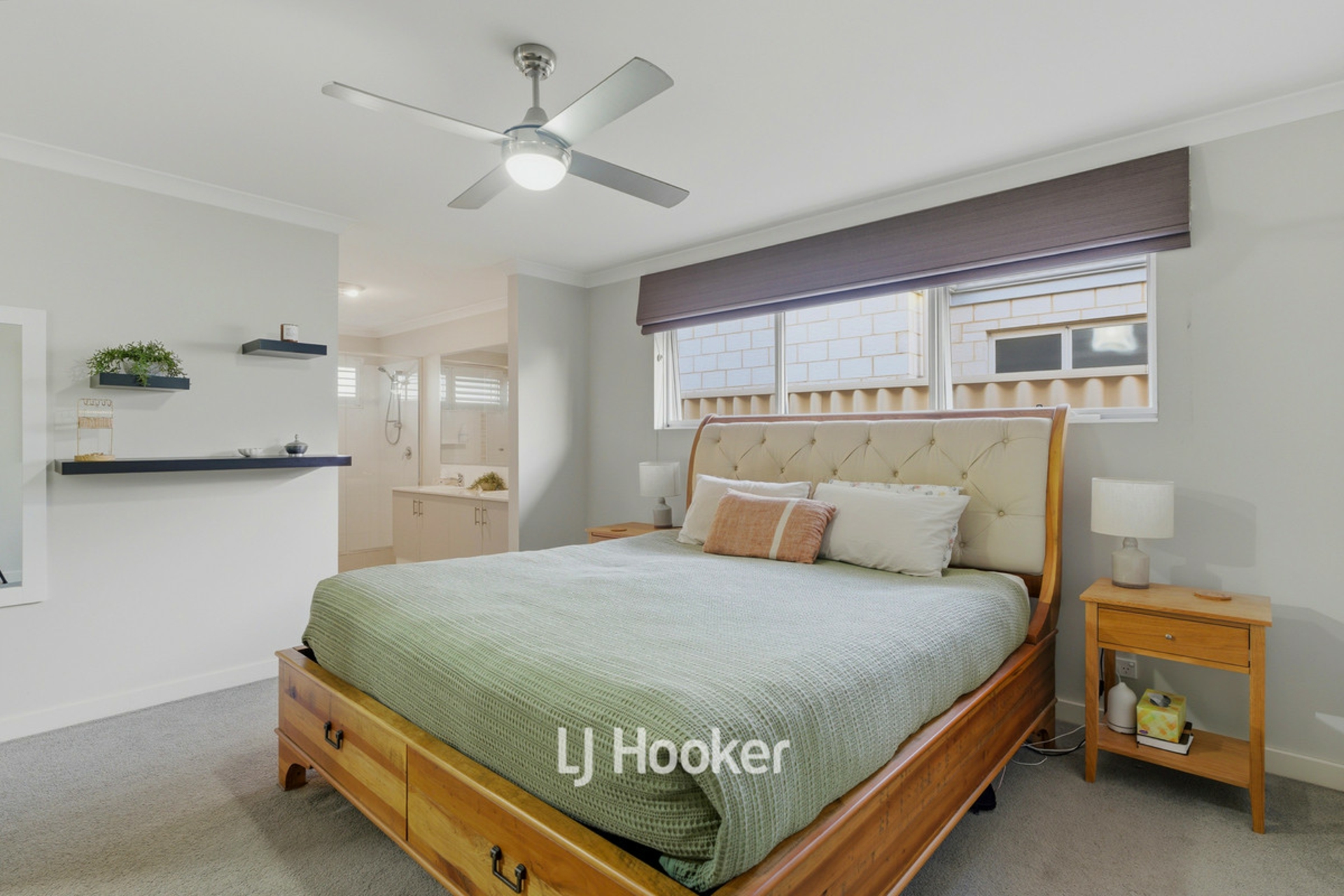 The king-sized master suite offers a private retreat, complete with walk-in robe, ceiling fan, and a stylish ensuite showcasing stone benchtops, double vanity, and double shower. Three additional queen-sized bedrooms are thoughtfully positioned, each with built-in robes, ceiling fans, and soft carpet underfoot, making them ideal for growing families.