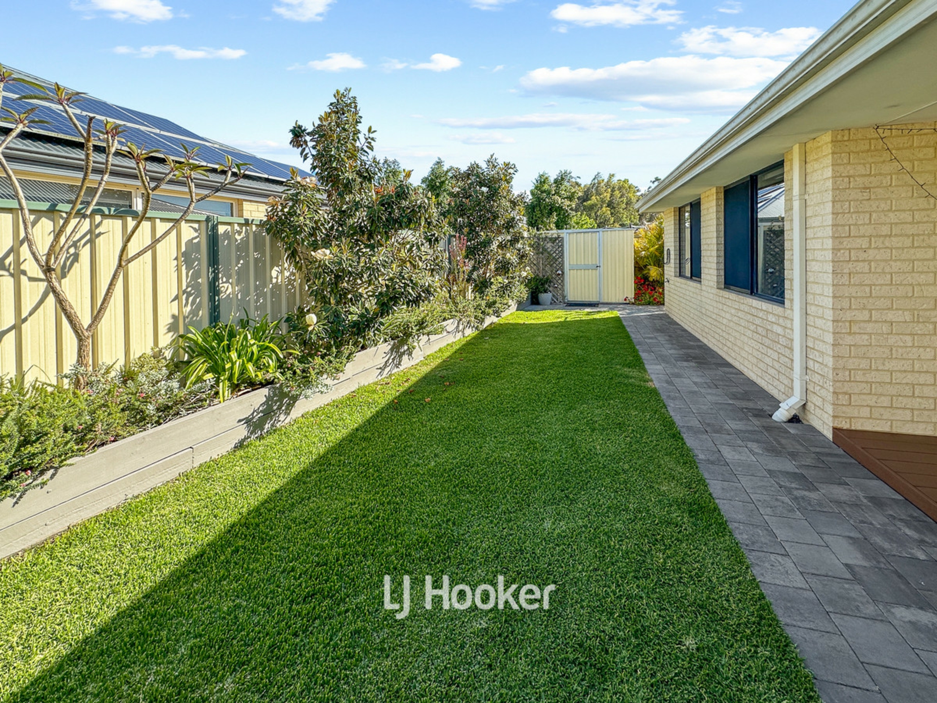 Outdoors, the alfresco area (3 x 4m) looks onto a neatly maintained yard with reticulation, perfect for kids and pets to play, while the decking alongside the home extends your entertaining options with a handy retractable blind for shade. The garden shed provides extra storage or hobby space, enhancing the practical appeal of this home.