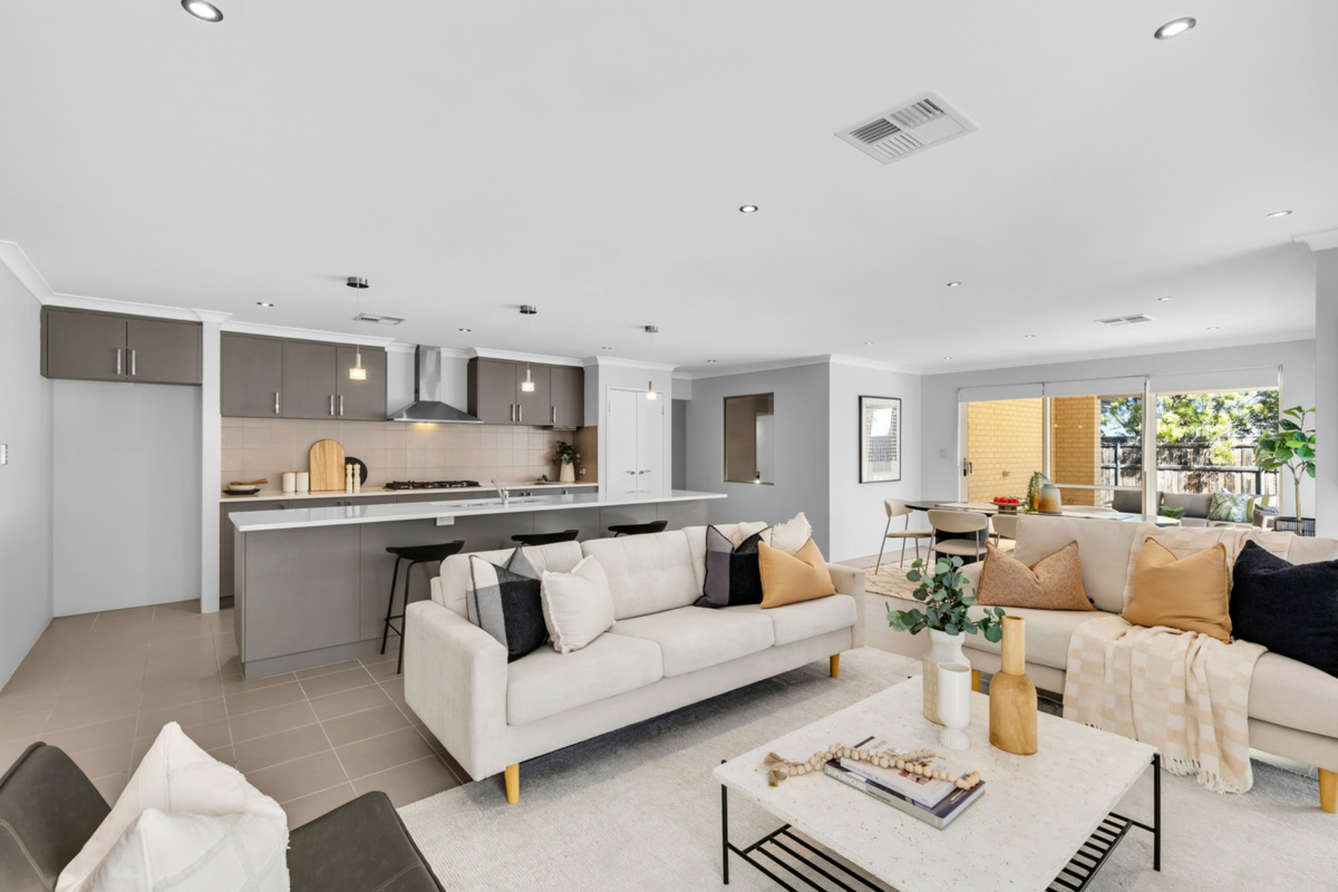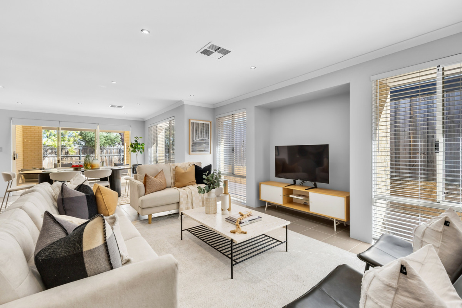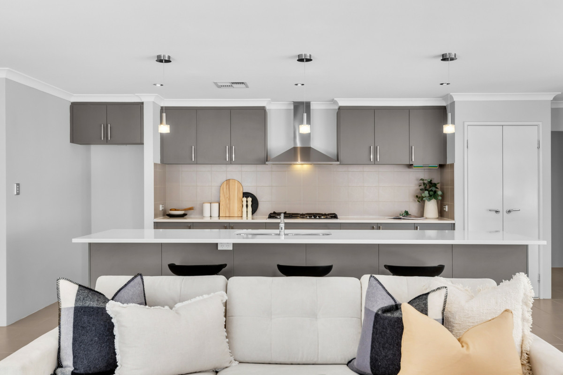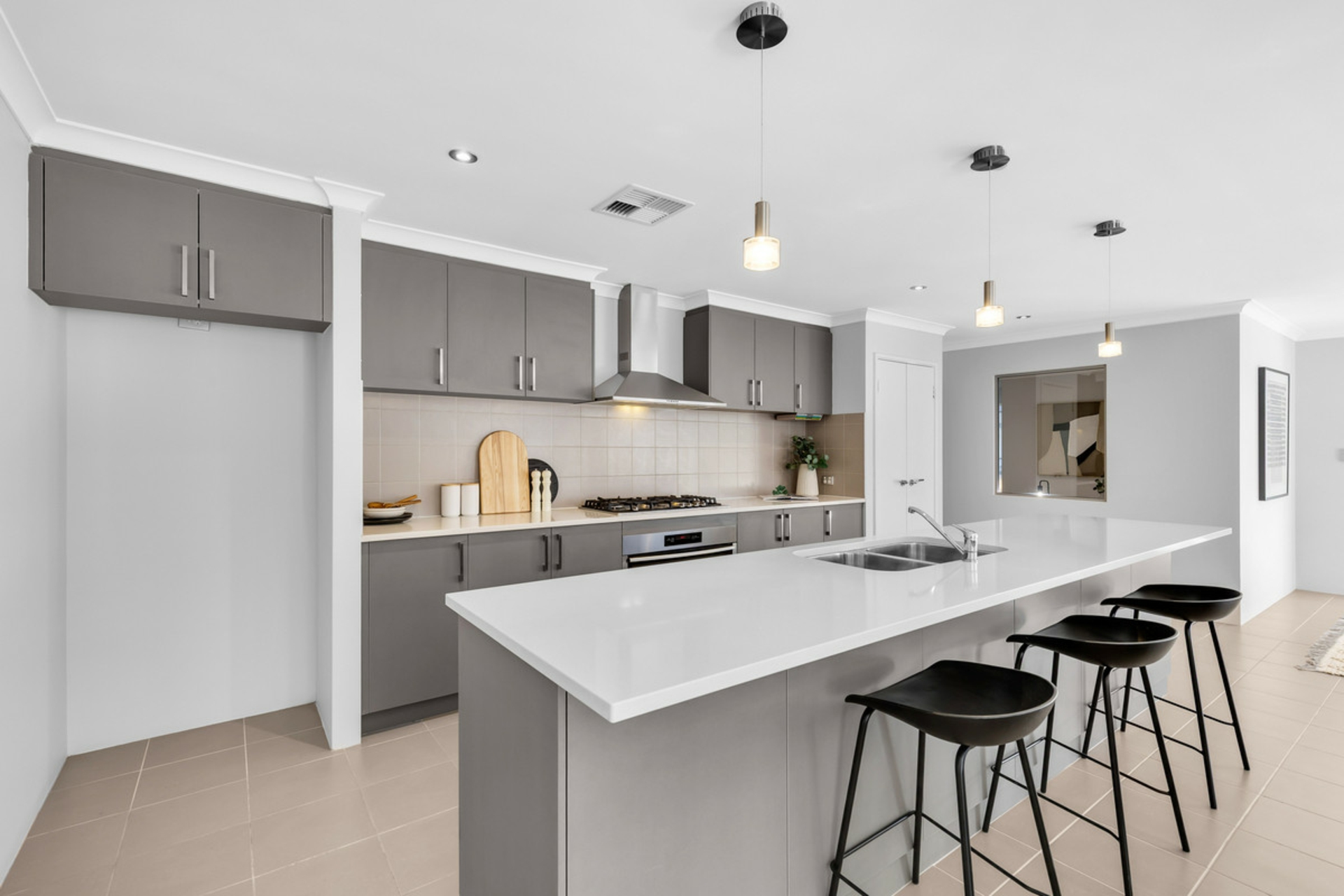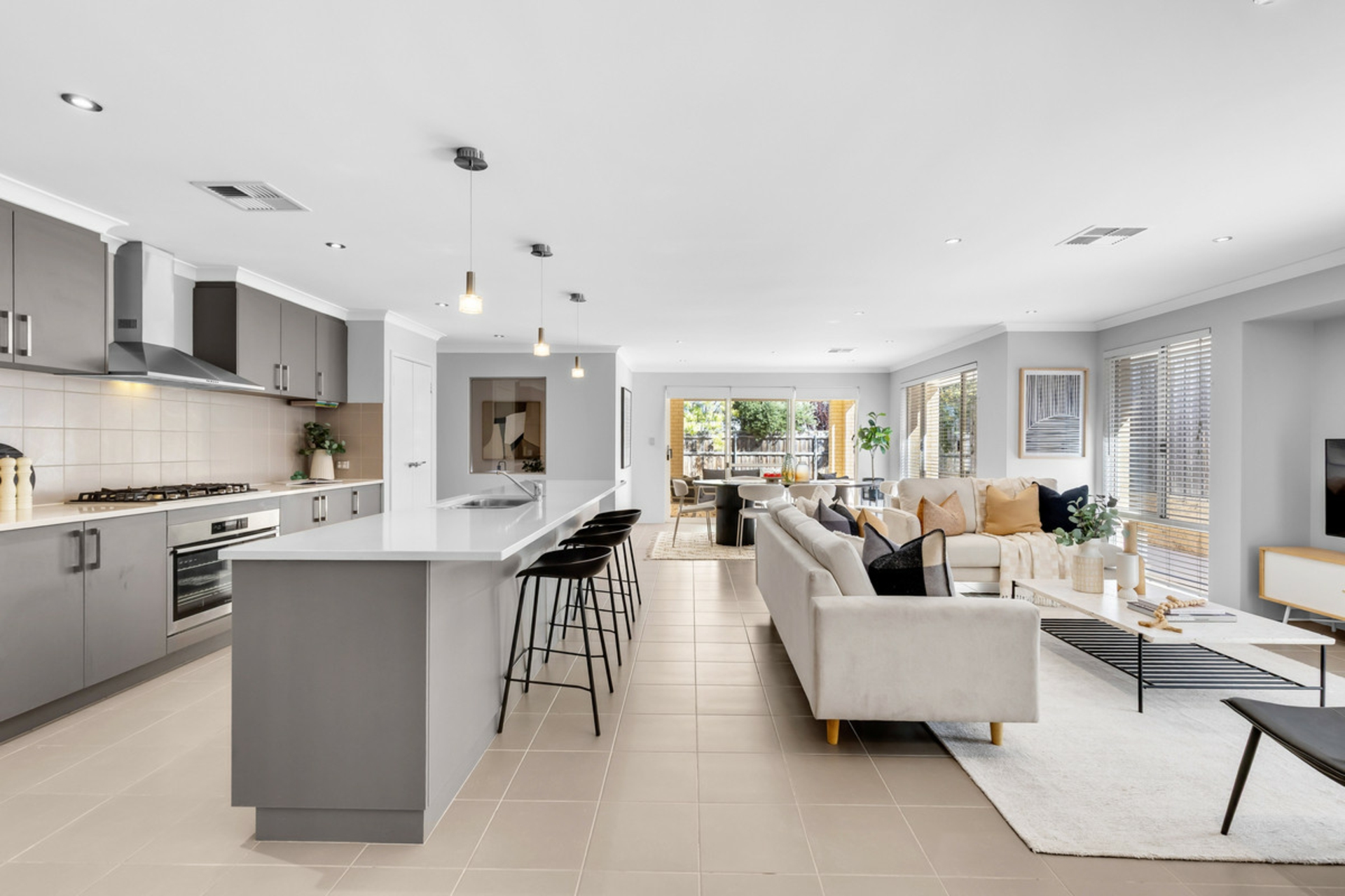 At the centre of the home is a large open-plan kitchen, family and meals area. The kitchen features 30mm stone benchtops, flick mixer tapware, an undermount sink, 900mm appliances, overhead cupboards and a long bench with plenty of preparation space. LED downlights run throughout the home, while reverse-cycle ducted air conditioning and a large solar system add year-round comfort and efficiency.
