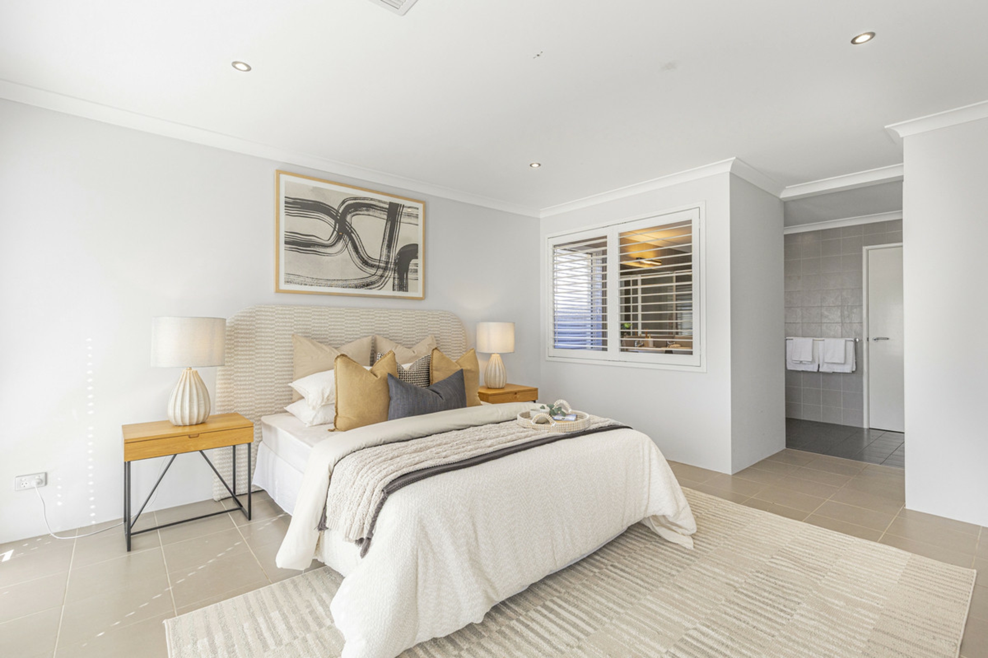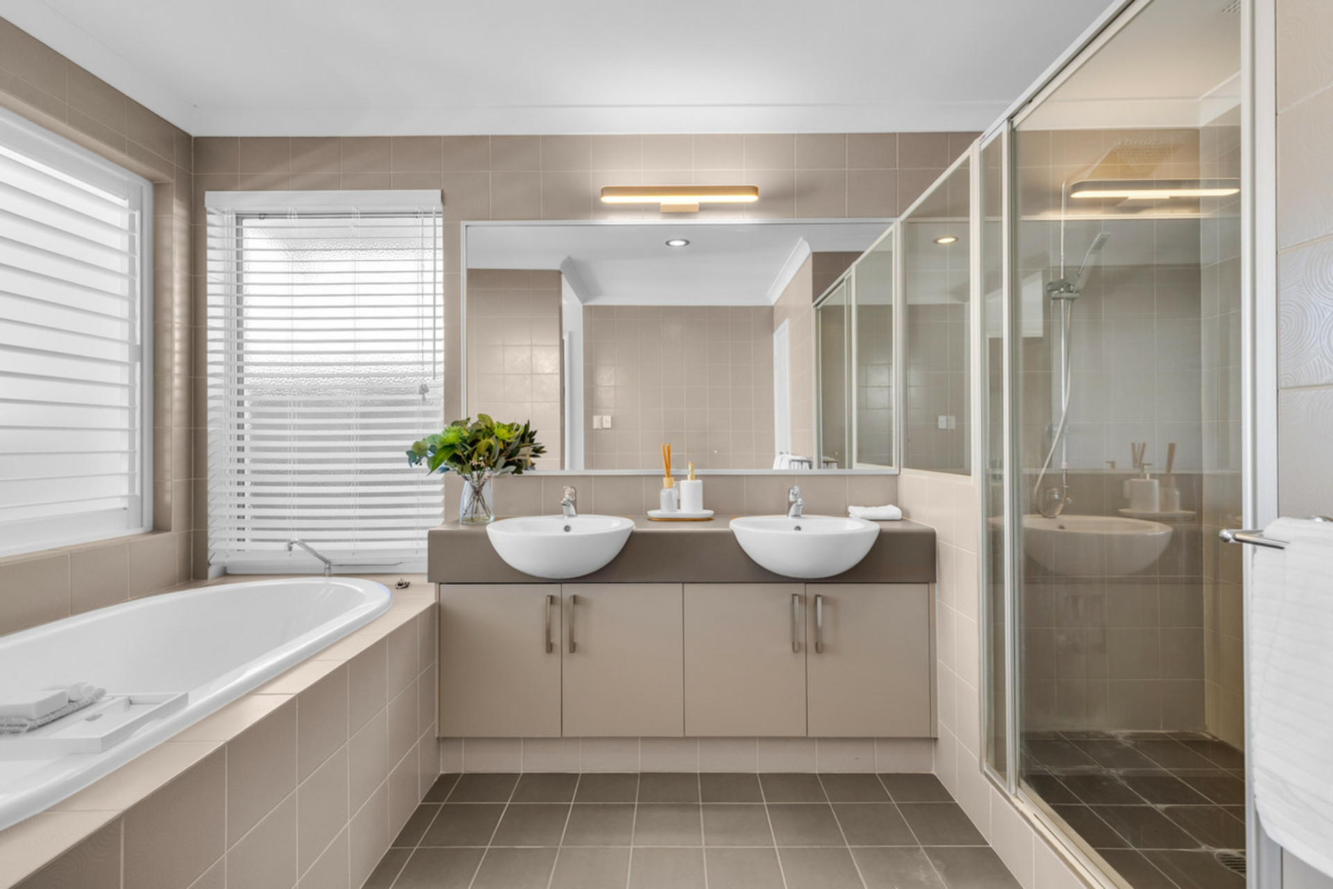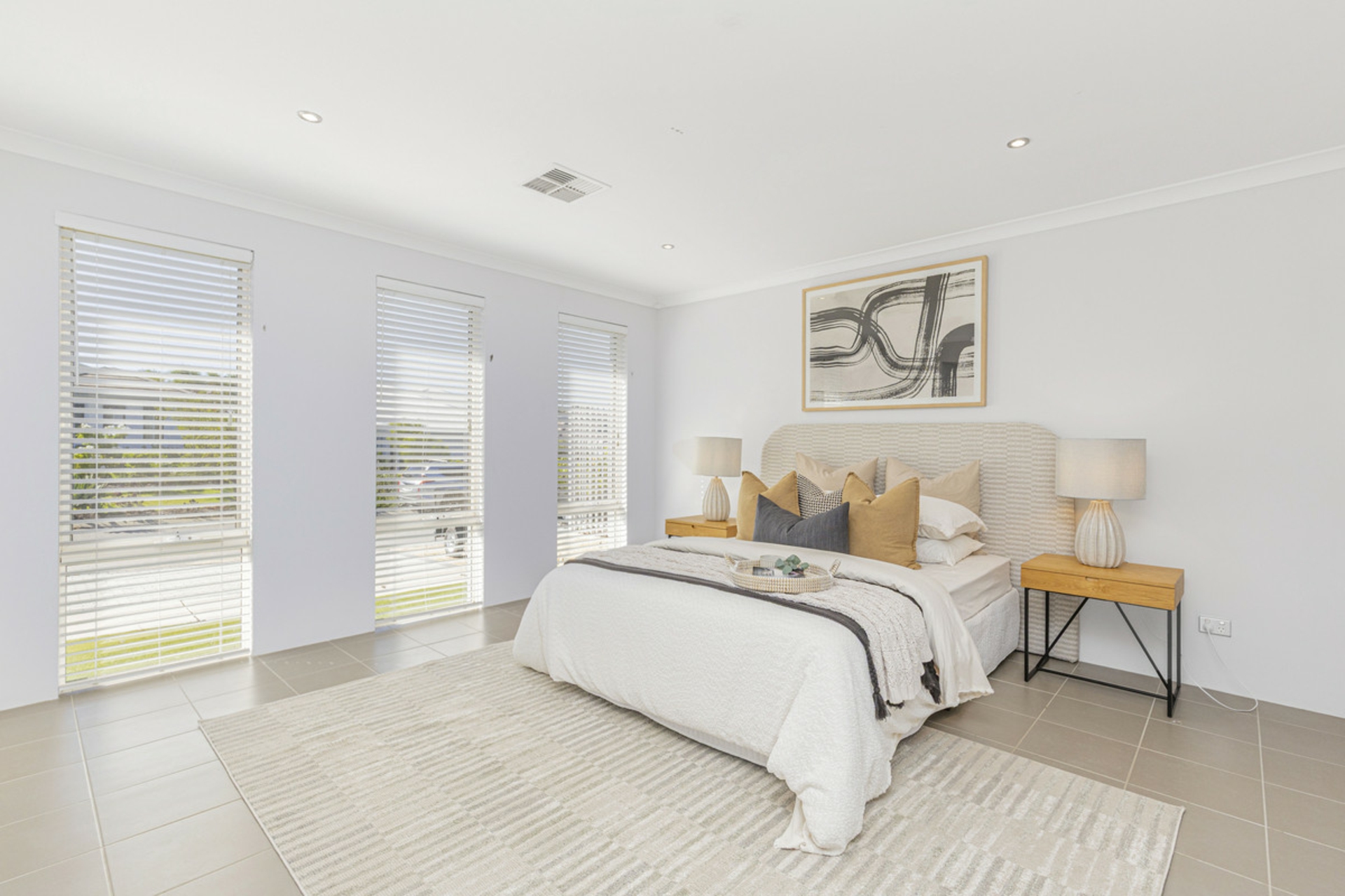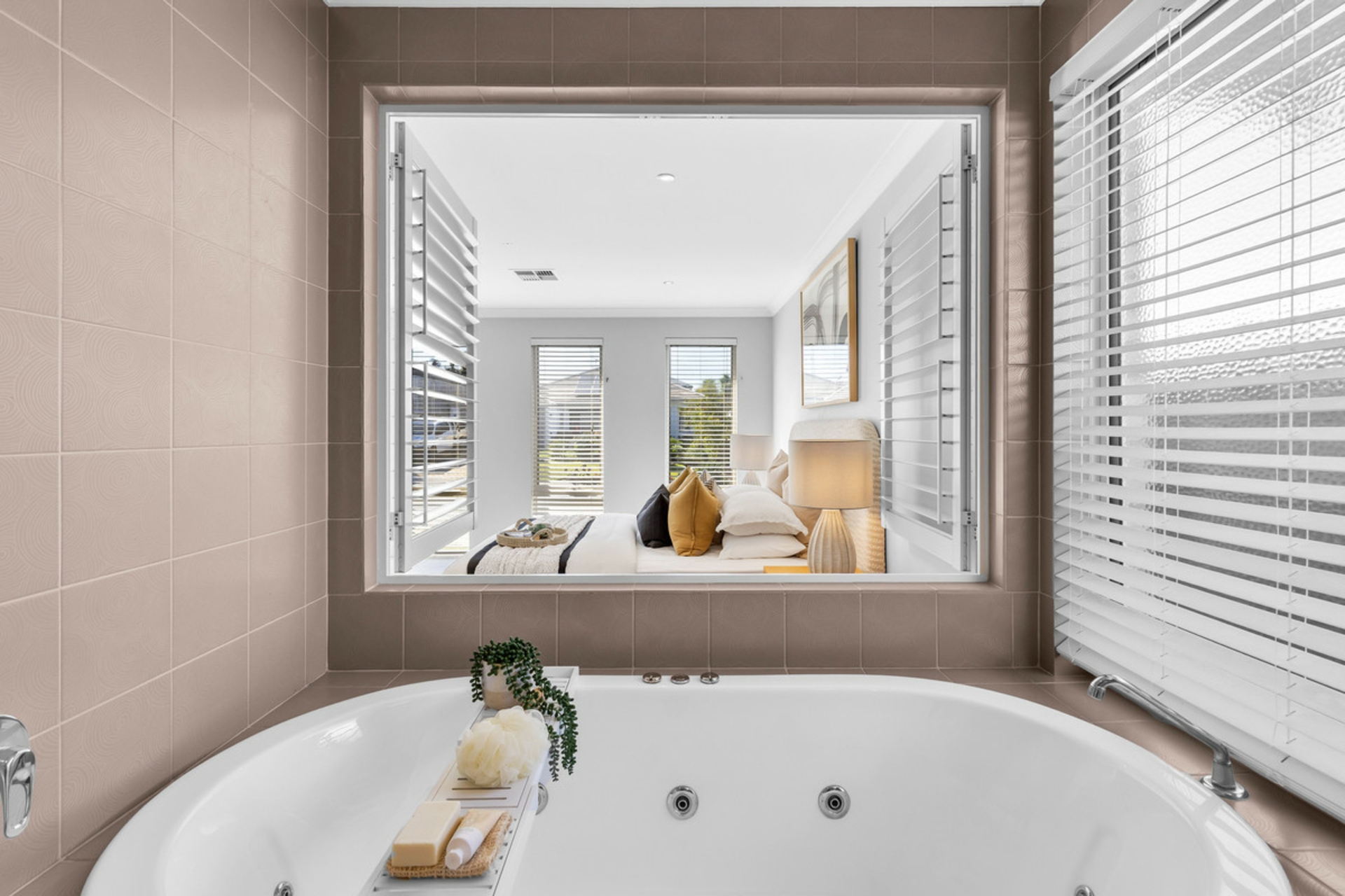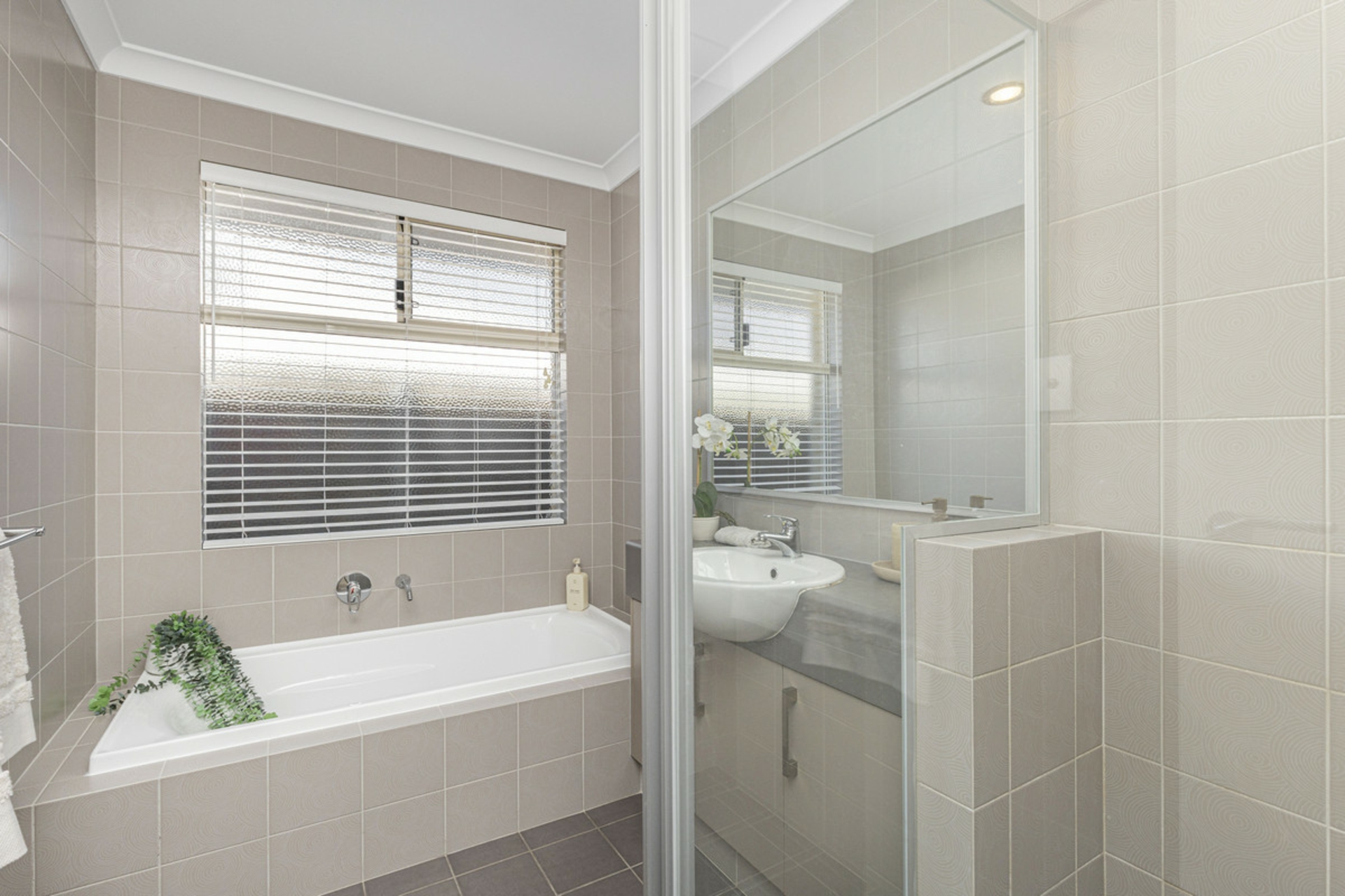 The master bedroom is positioned toward the front of the home and includes a spacious, fully tiled ensuite with a bath that can be opened to the room or screened off with plantation shutters. The ensuite is arranged in a semi-ensuite style, allowing convenient access for guests if needed. The garage also offers high clearance, suitable for larger vehicles including lifted 4WDs.
