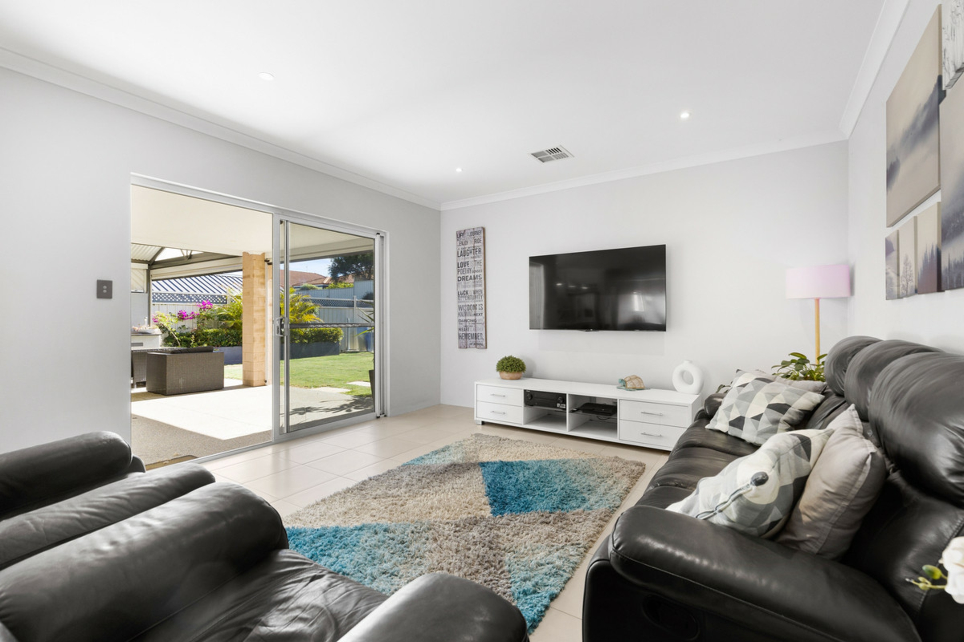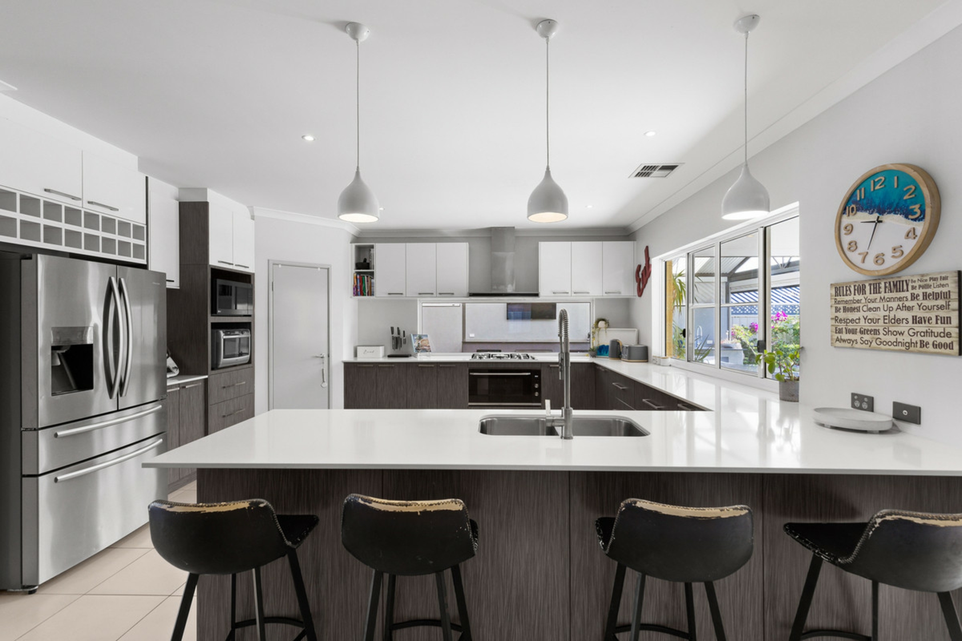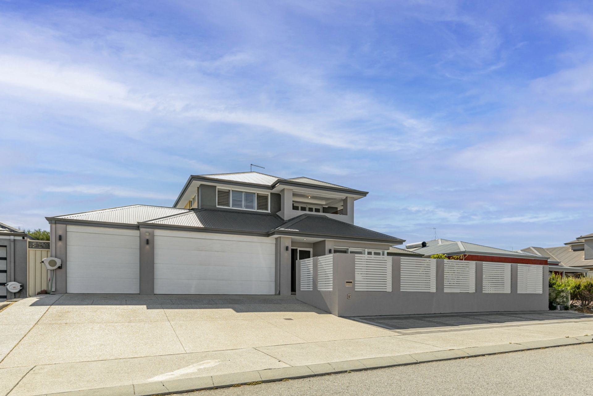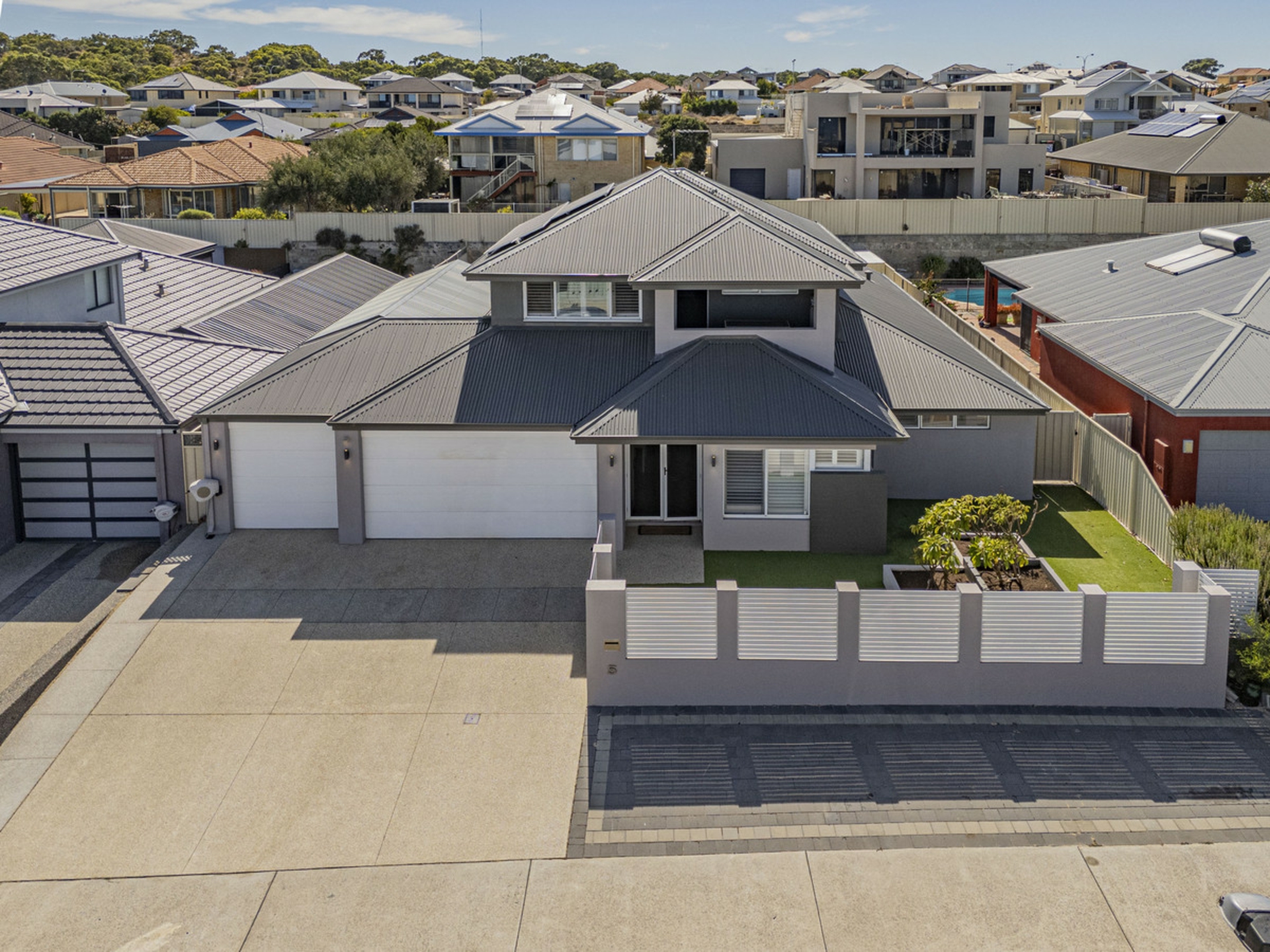 Built by Ventura in 2016 and set on a block of more than 700sqm, this five-bedroom, two-bathroom home offers space, separation and a layout that works well for family living. From the street, the home has a strong presence with its wide frontage, rendered elevation, gated front courtyard and triple garage with drive-through access to the rear.