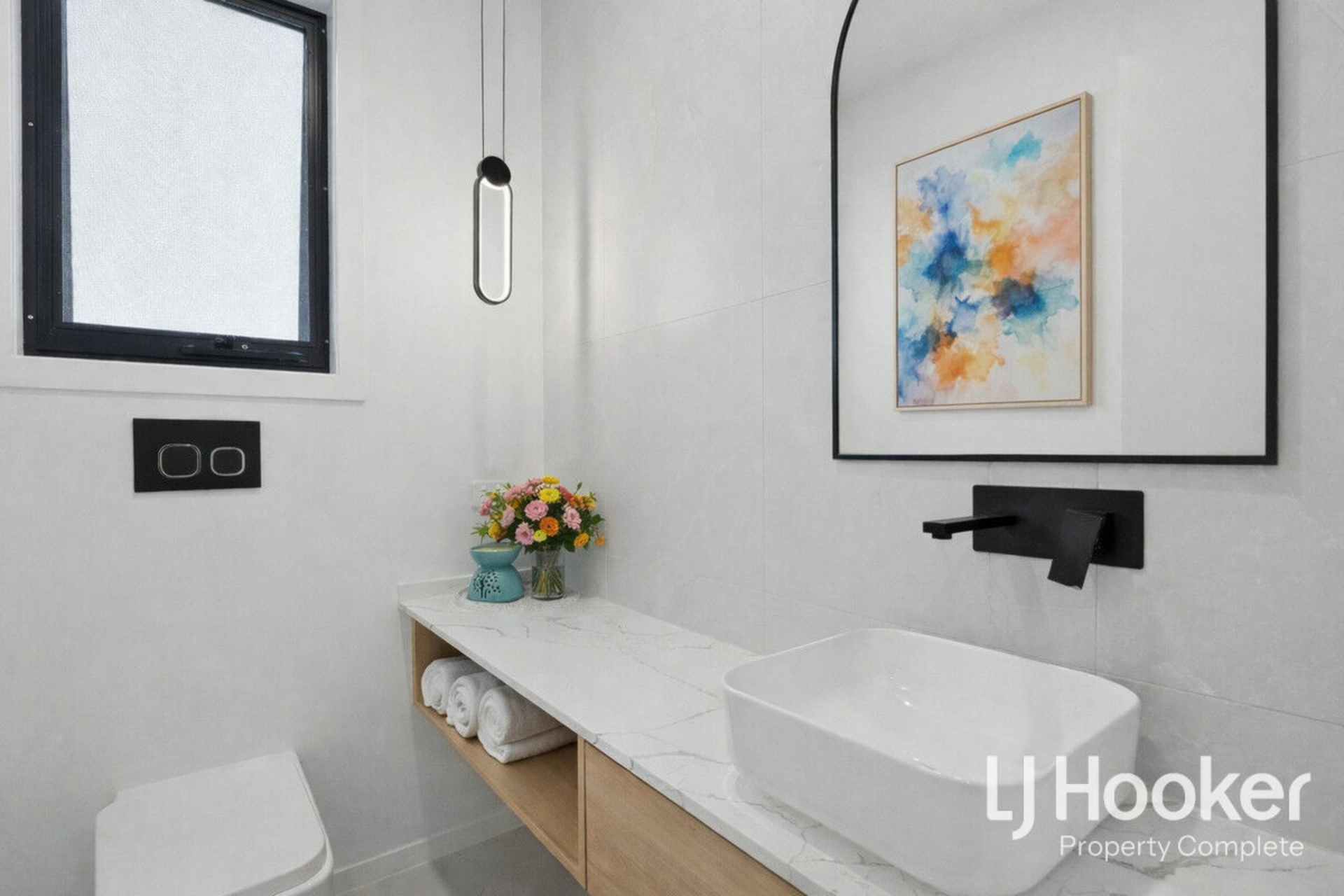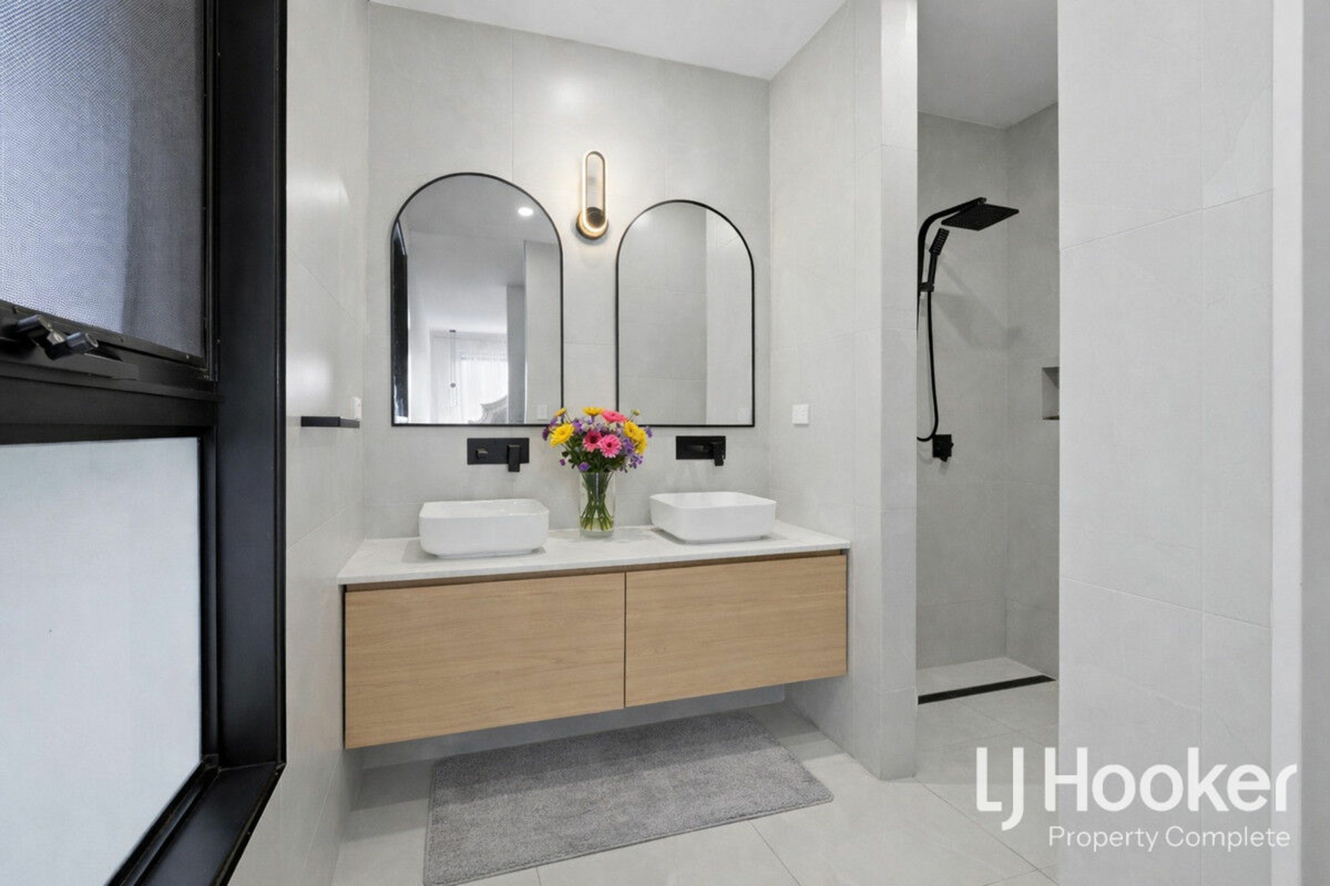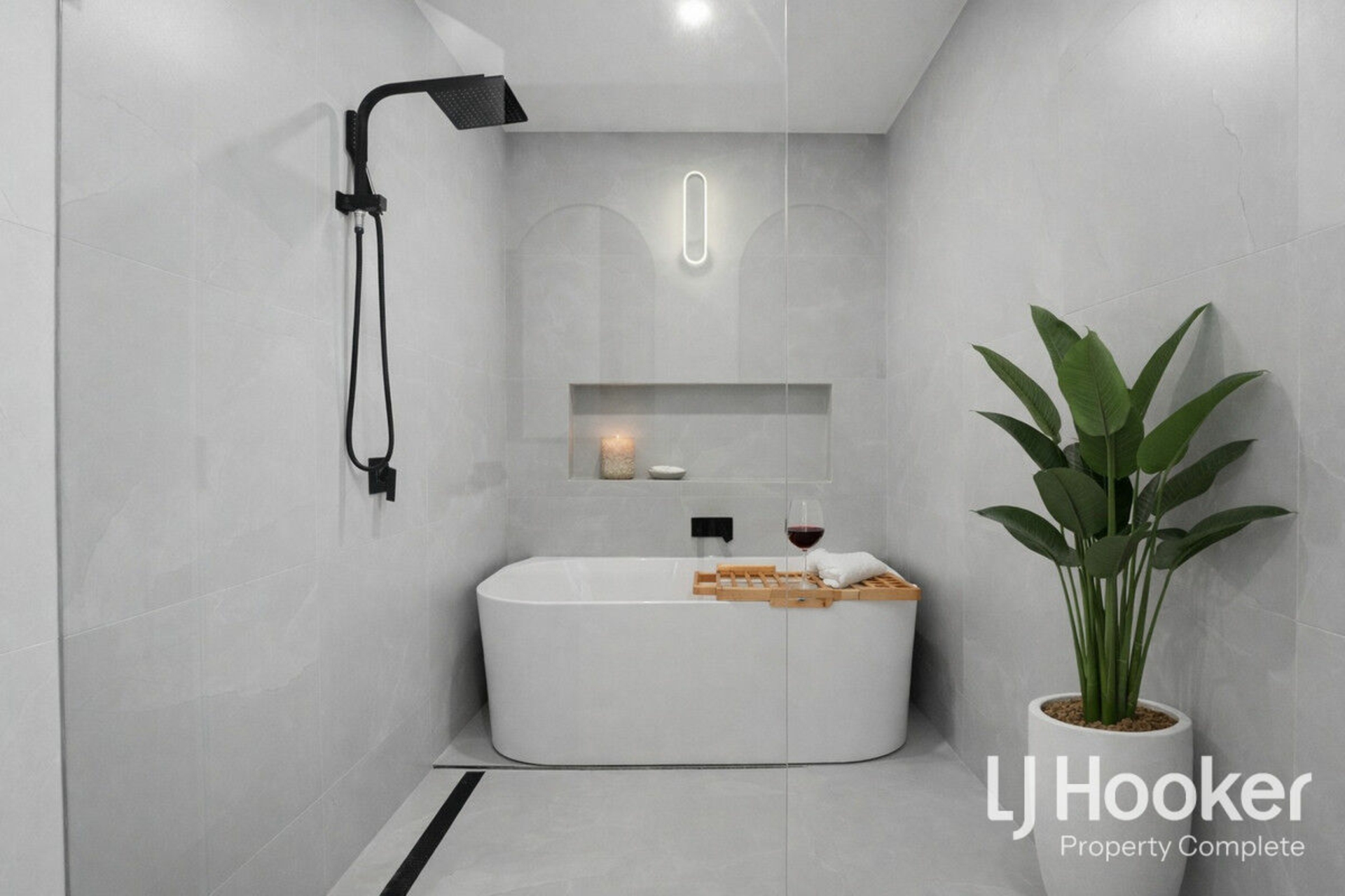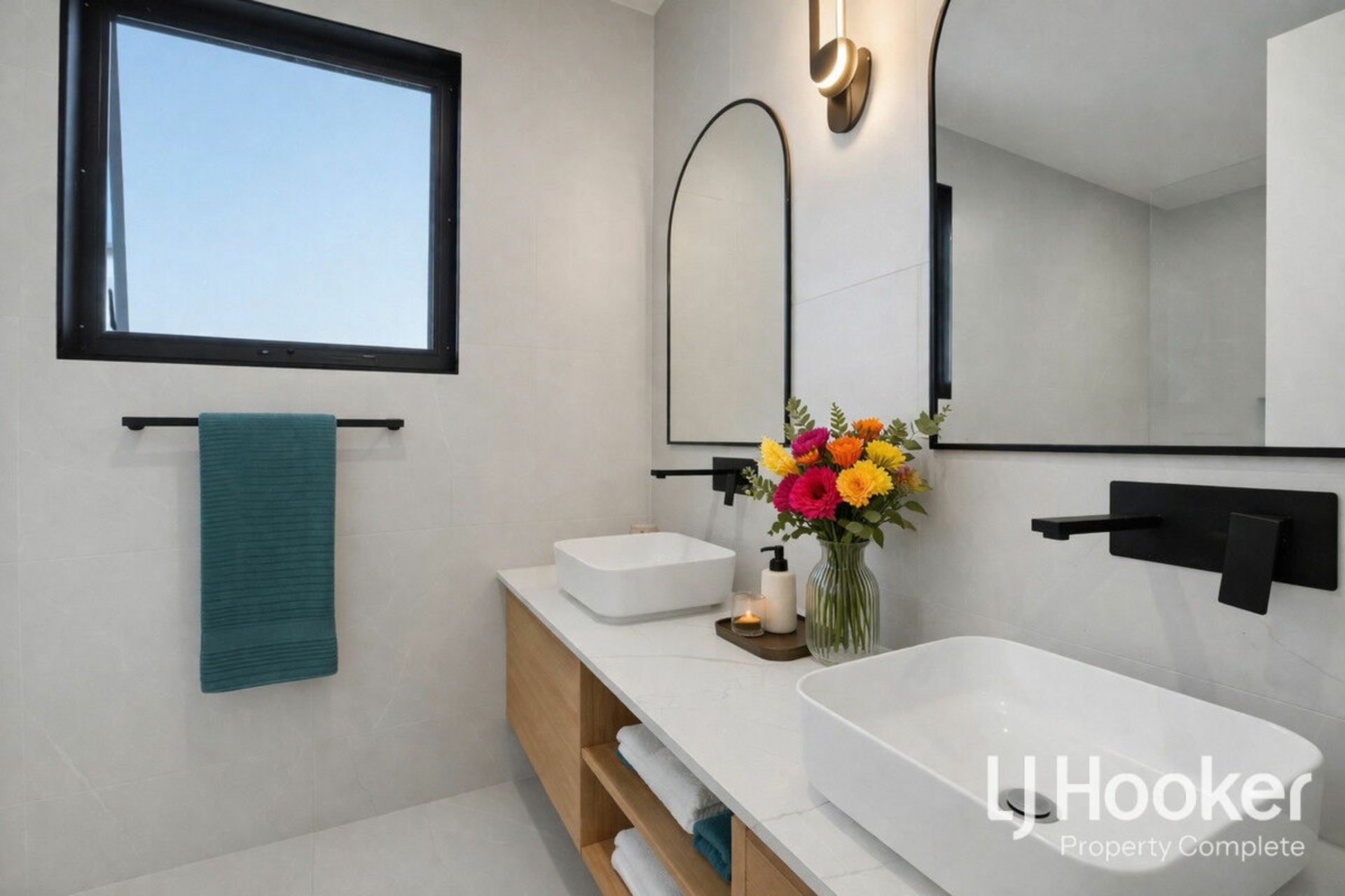 Additional premium inclusions include solar power for improved energy efficiency, ceiling fans throughout and ducted air conditioning for year-round comfort. The home also features striking black tapware and a luxurious back-to-wall freestanding bath, adding a sophisticated touch to the bathrooms.