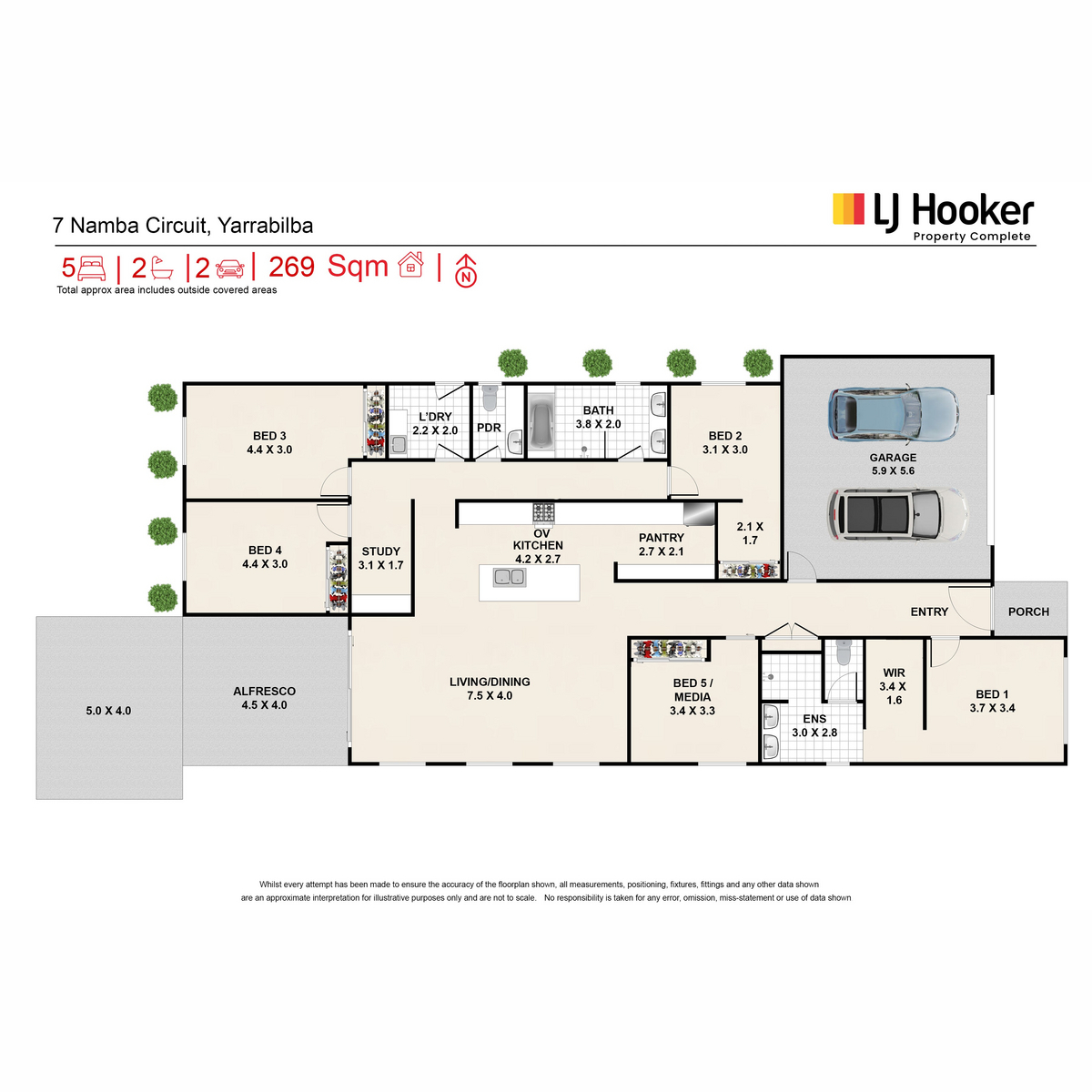 • Five spacious bedrooms with built-in mirrored robes or four bedrooms with a Media Room.