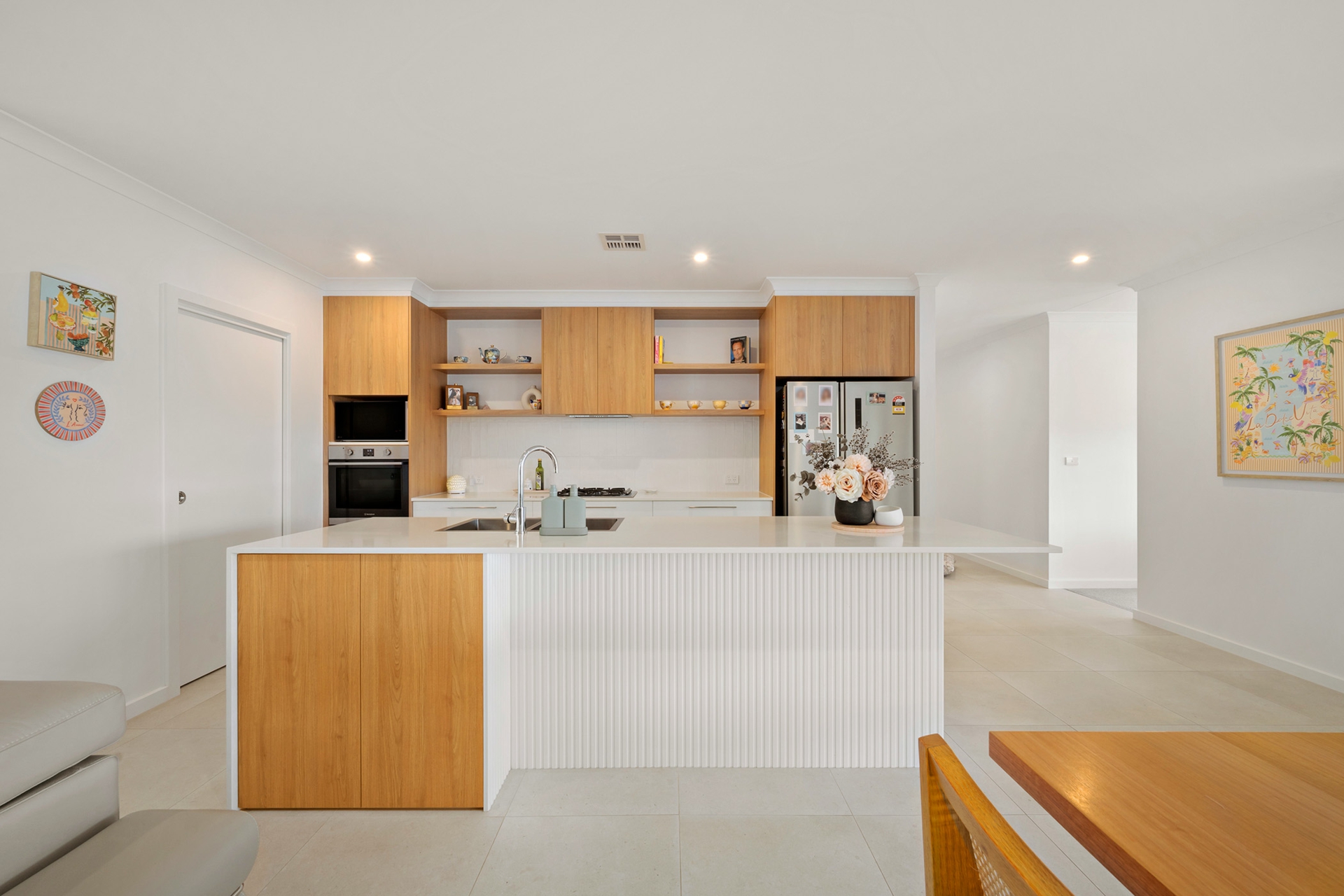 Step inside and you're greeted by light-filled, open-plan living where warm finishes and thoughtful design create a calm, welcoming atmosphere. The kitchen is a real centrepiece with its timber cabinetry, stone benchtops, quality appliances and clear connection to the dining and living spaces.