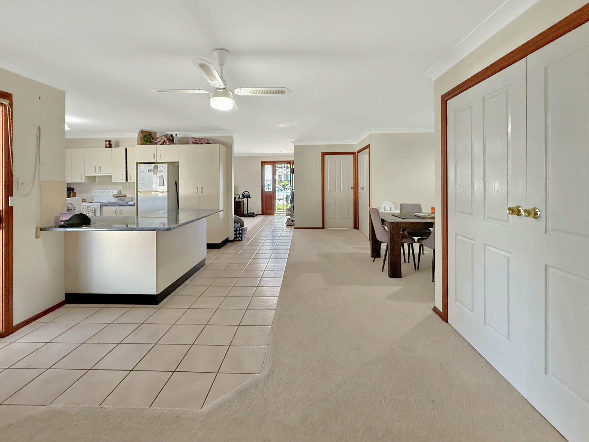 - Large lounge room with gas heater, carpet and adjacent to the kitchen