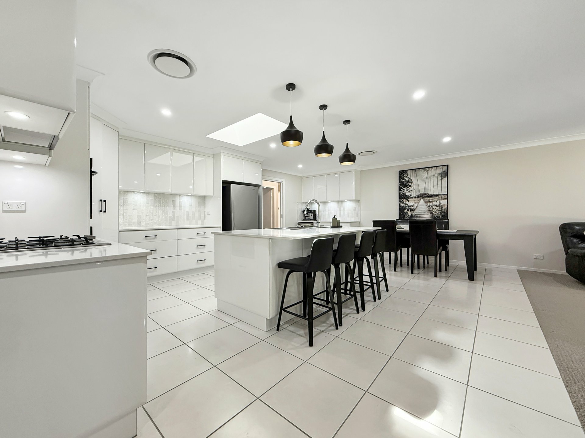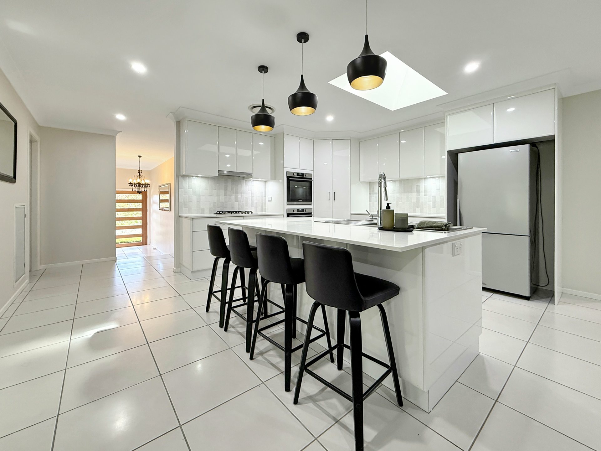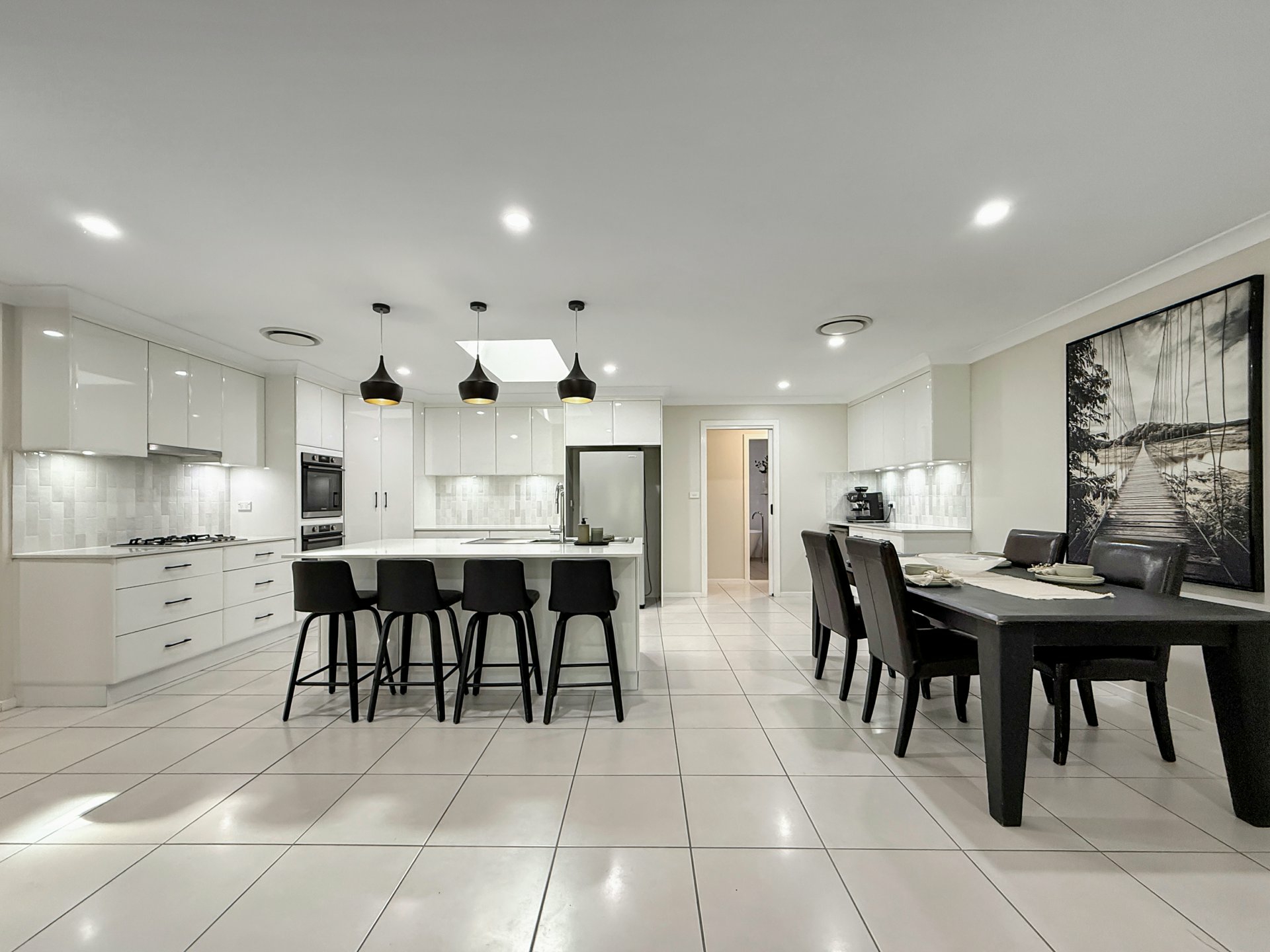 Set on a generous 874m² block, the home has been thoughtfully designed for both everyday comfort and effortless entertaining. A stylish kitchen sits at the heart of the home, featuring stone benchtops, double ovens, a Miele dishwasher, and a dedicated bar or coffee station. Flowing from here are spacious open-plan dining and family areas, complemented by a large formal living room, offering flexibility for growing families.