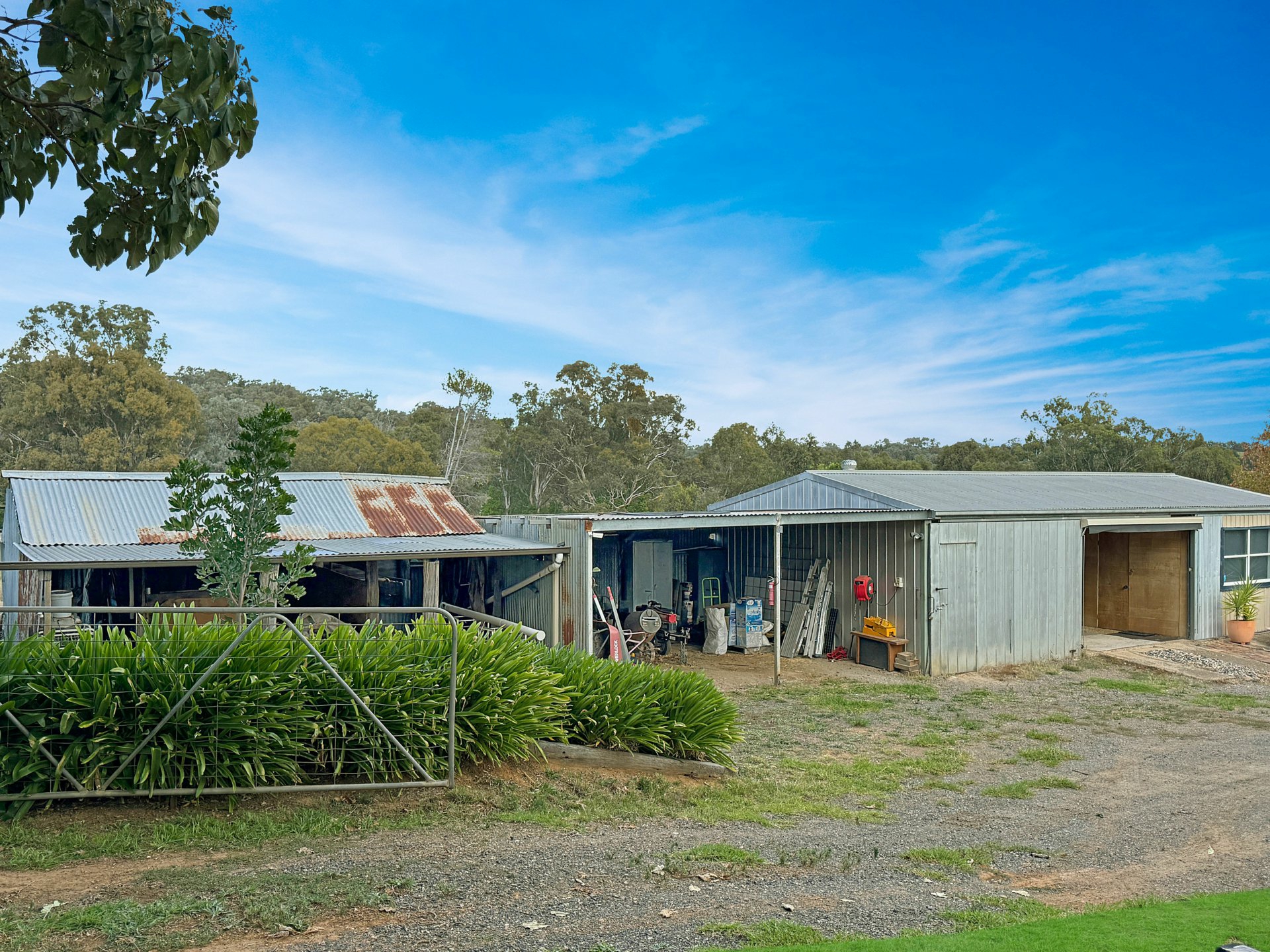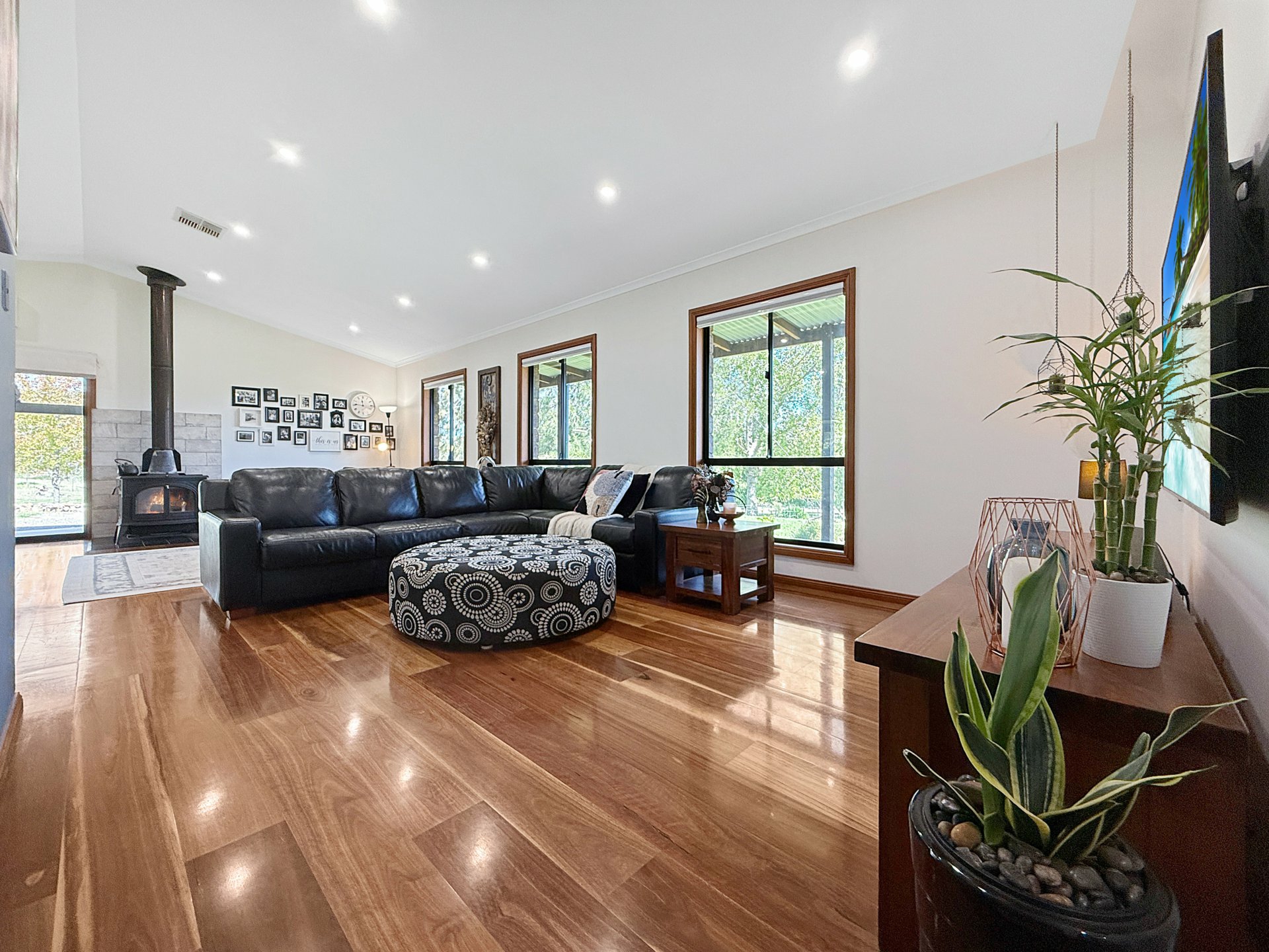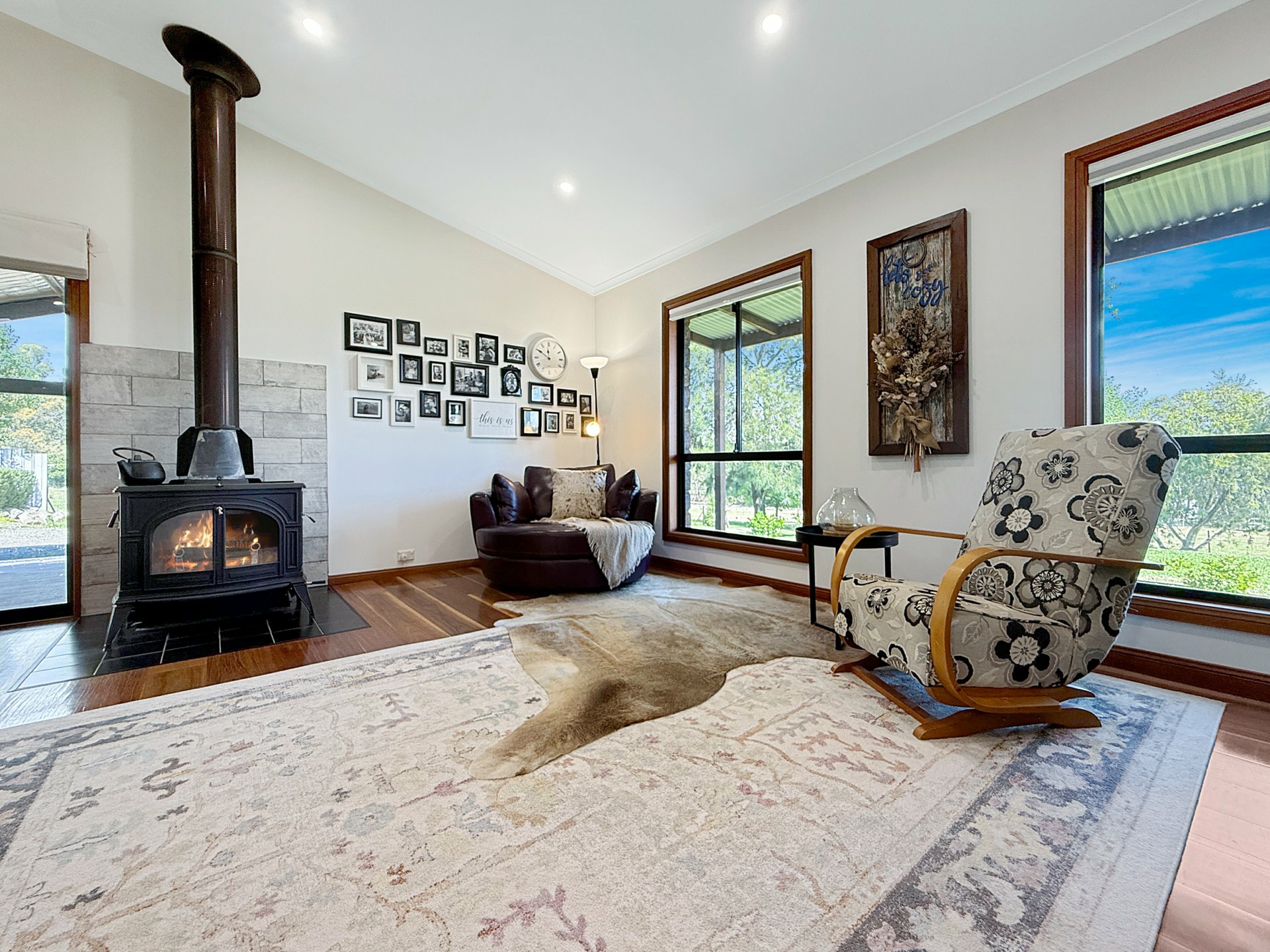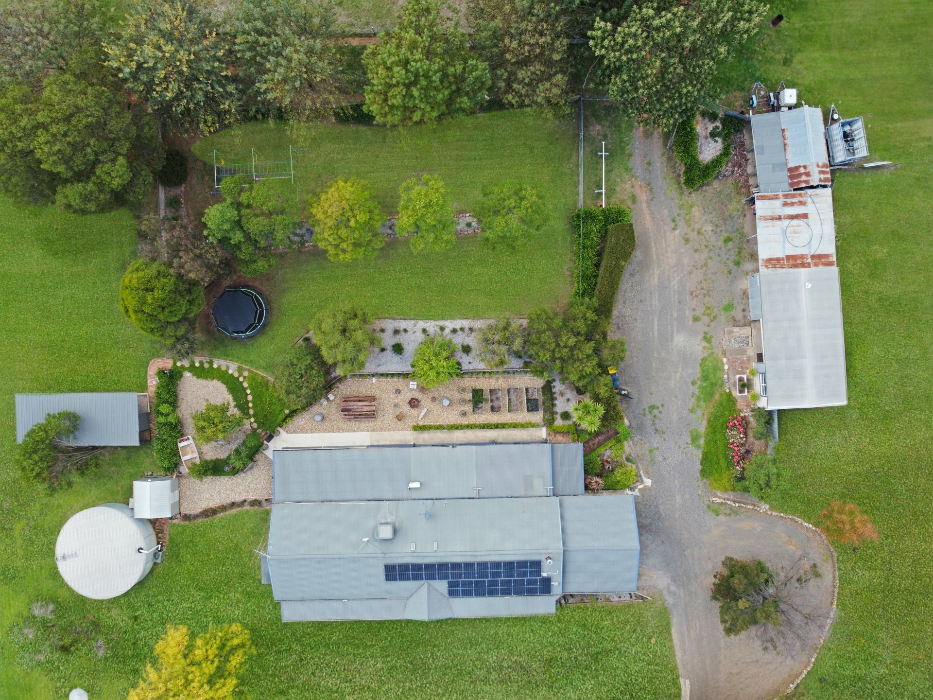 The property is well set up for lifestyle or small-scale farming, with nine paddocks, a main shed offering car accommodation, gym or studio, workshop, machinery storage and wood shed, plus a double bay shed with stables and additional animal enclosures including an aviary & chook run. A 7x7.5m carport adjoins the home, and a 6.6kW solar system adds efficiency. Mail and school bus service are conveniently at the front gate.