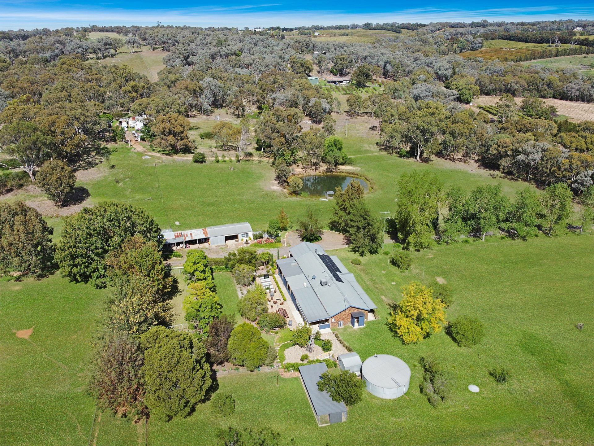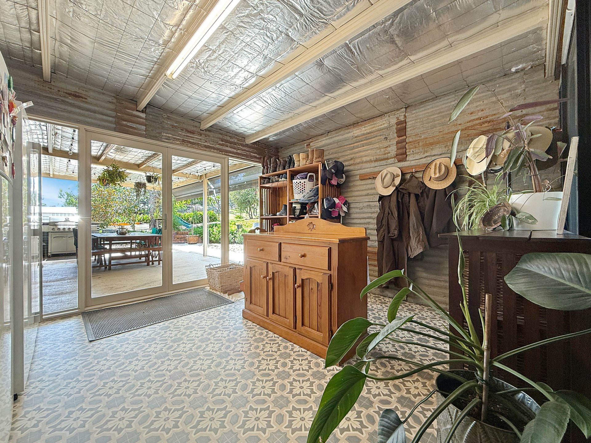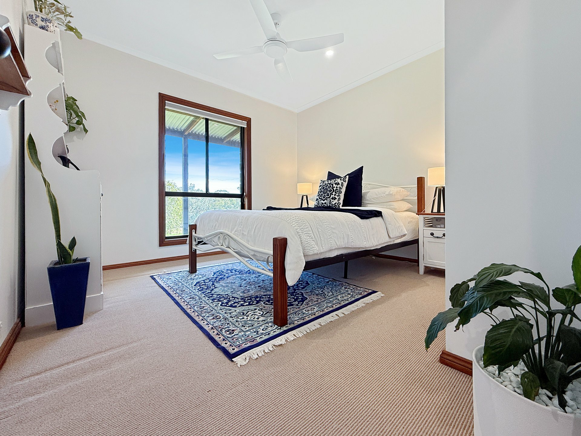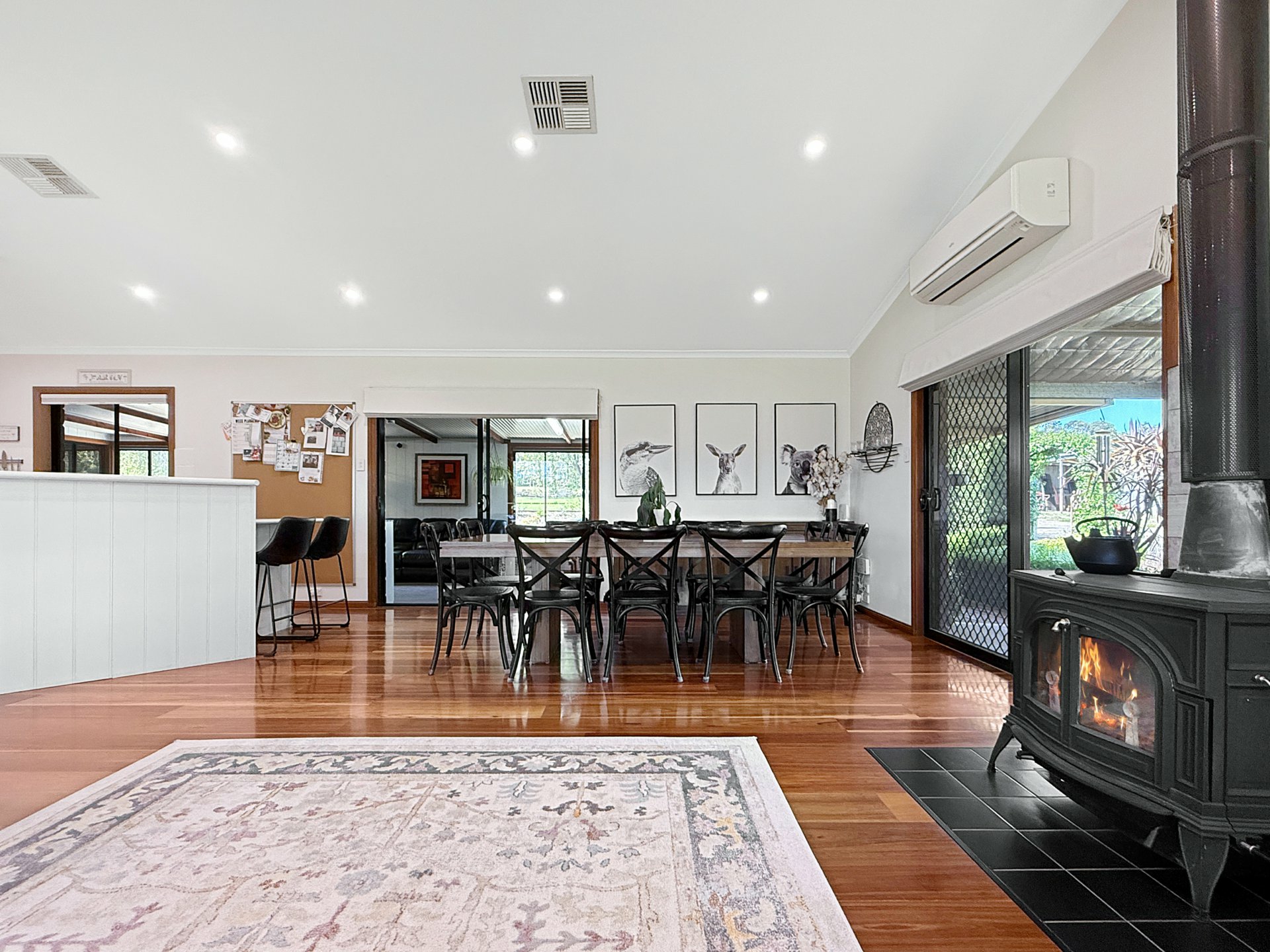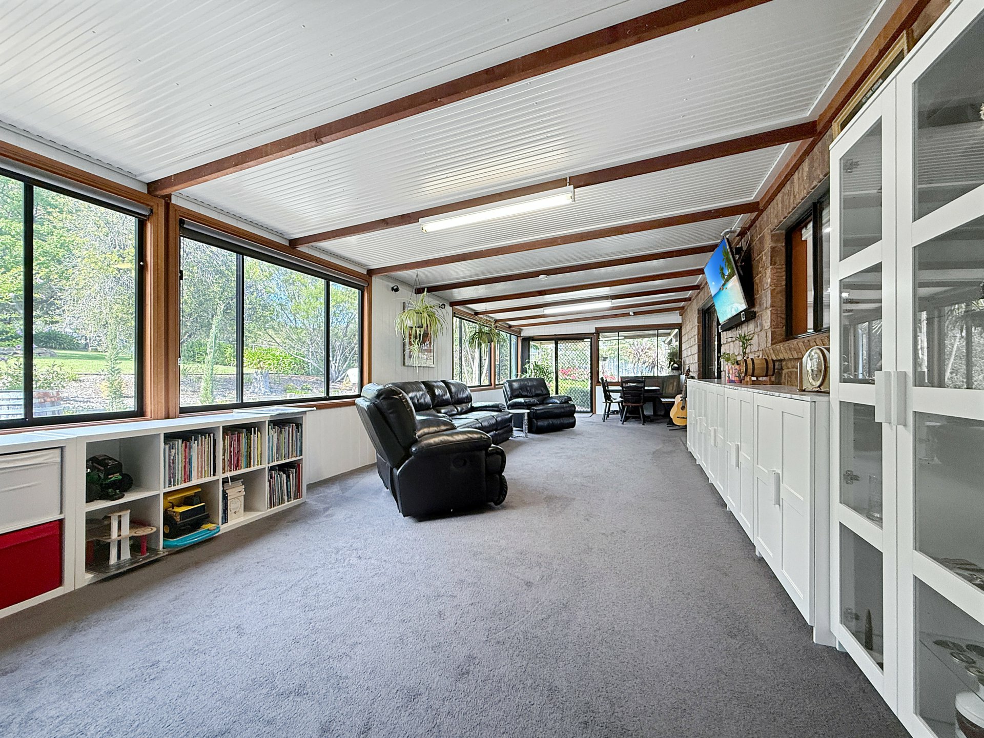 The property is well set up for lifestyle or small-scale farming, with nine paddocks, a main shed offering car accommodation, gym or studio, workshop, machinery storage and wood shed, plus a double bay shed with stables and additional animal enclosures including an aviary & chook run. A 7x7.5m carport adjoins the home, and a 6.6kW solar system adds efficiency. Mail and school bus service are conveniently at the front gate.