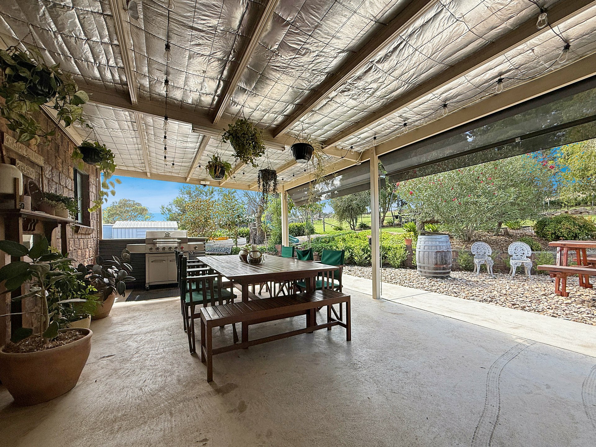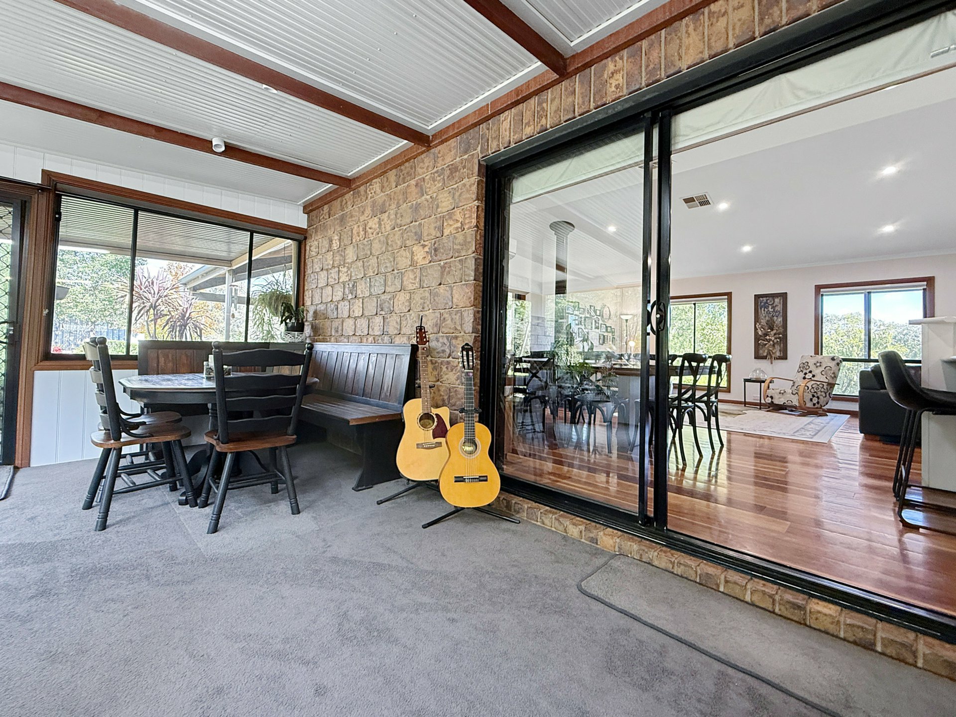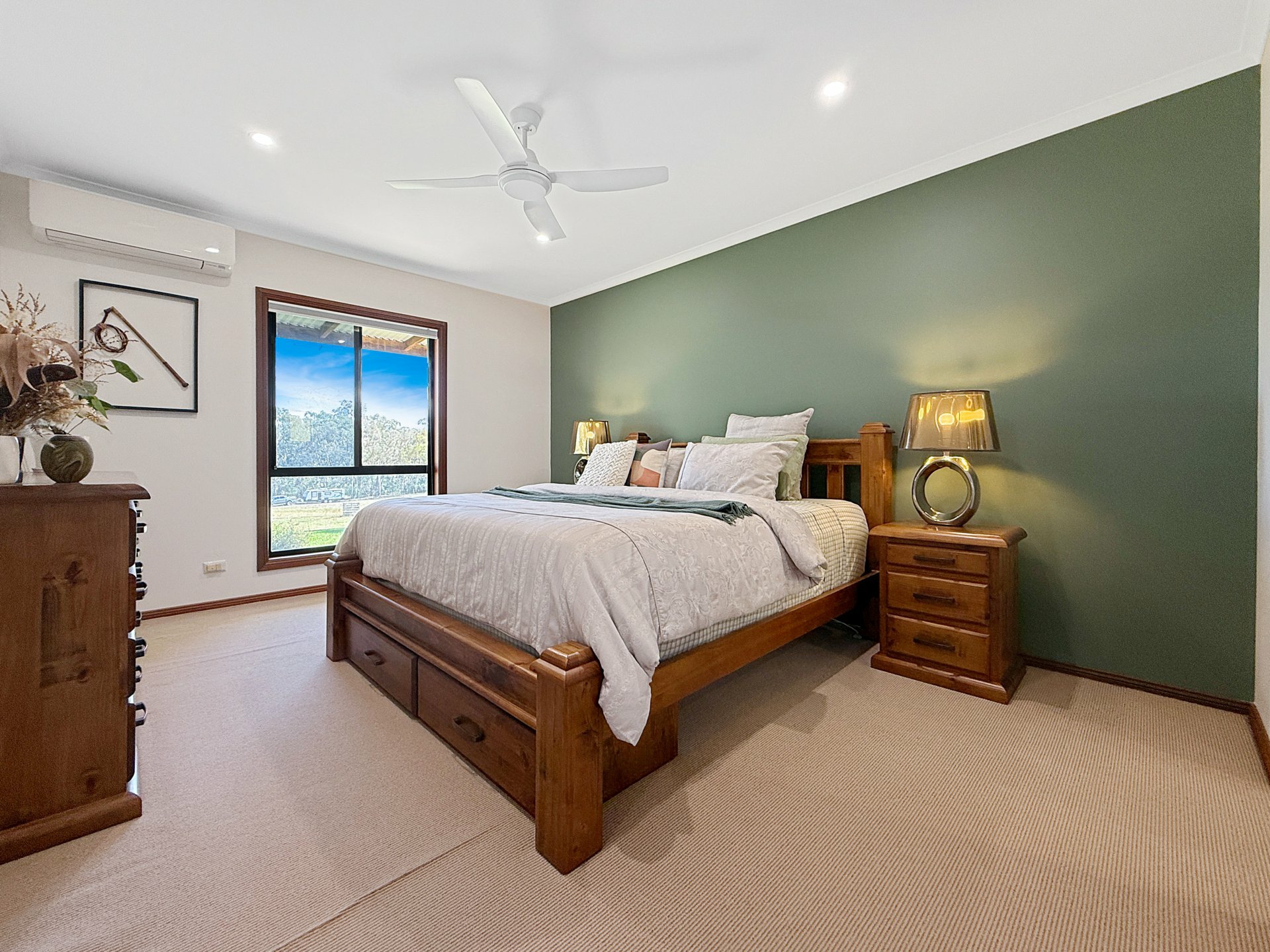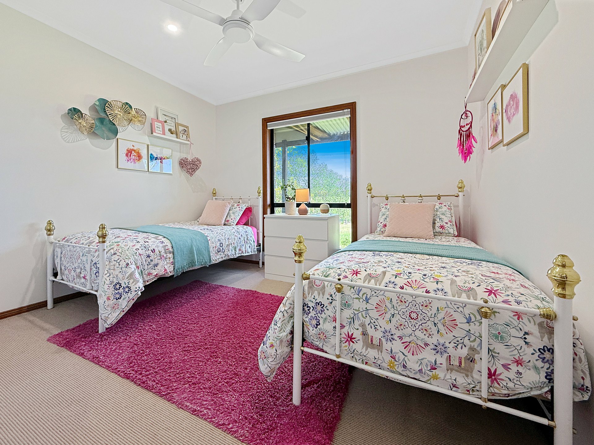 The property is well set up for lifestyle or small-scale farming, with nine paddocks, a main shed offering car accommodation, gym or studio, workshop, machinery storage and wood shed, plus a double bay shed with stables and additional animal enclosures including an aviary & chook run. A 7x7.5m carport adjoins the home, and a 6.6kW solar system adds efficiency. Mail and school bus service are conveniently at the front gate.