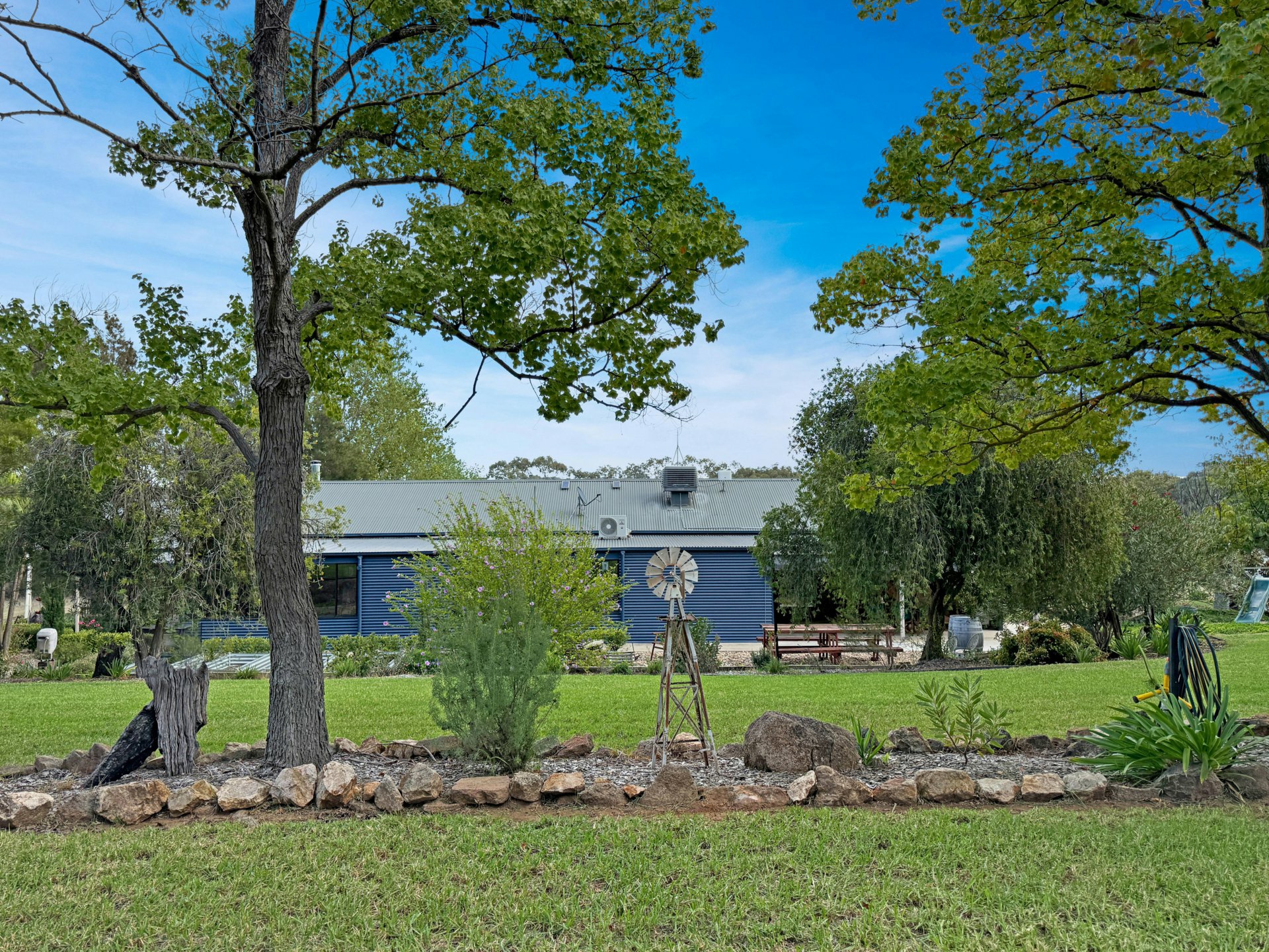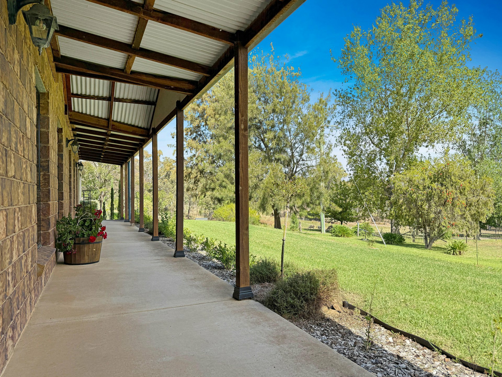 Water is a standout feature, with a bore feeding an 8,000L header tank reticulated to gardens and dam, a 110,000L freshwater tank servicing the home, three dams, and multiple troughs.