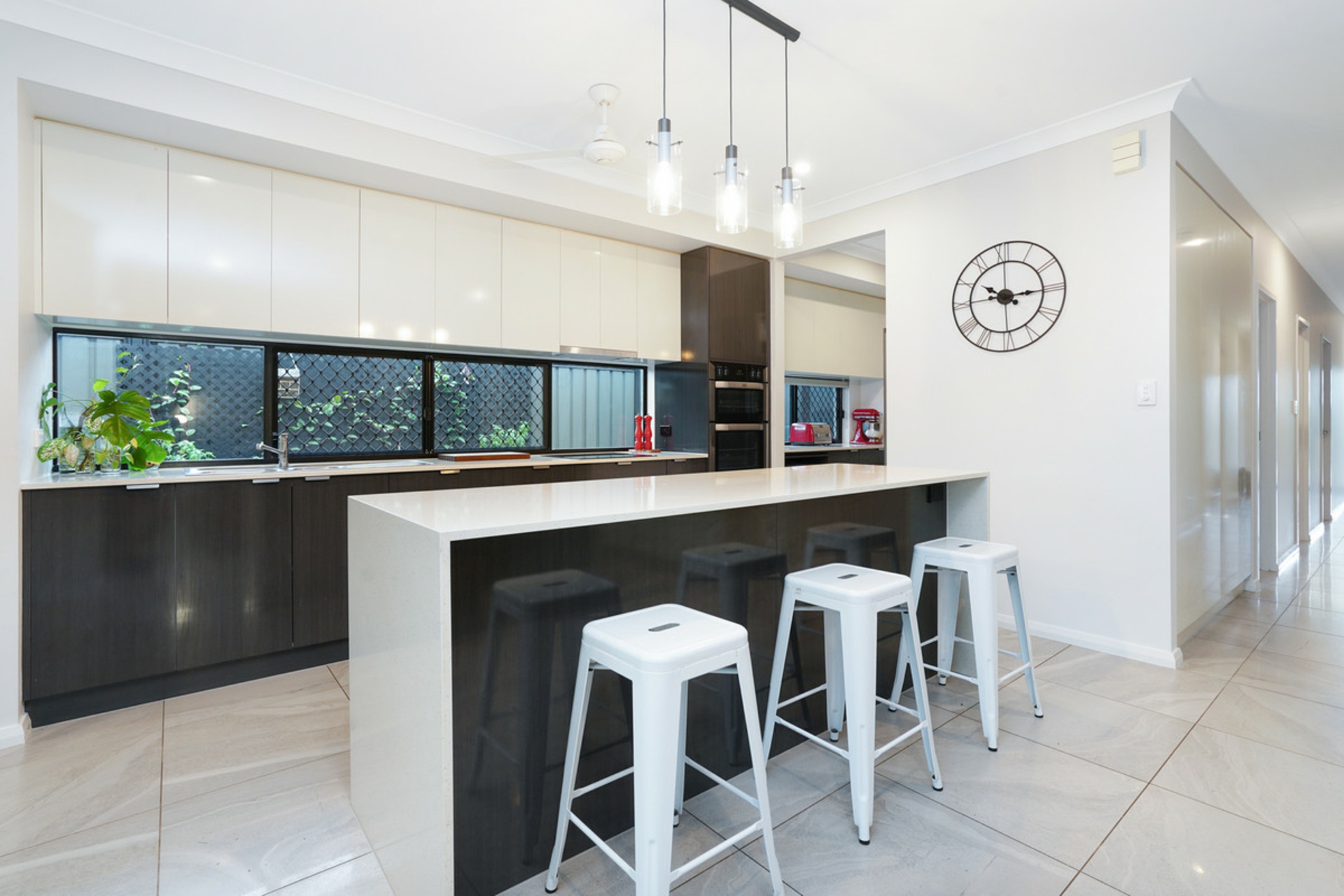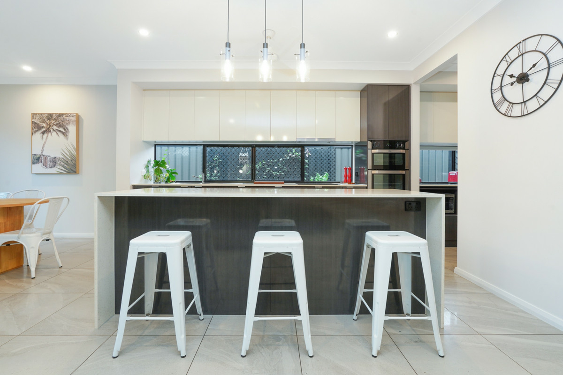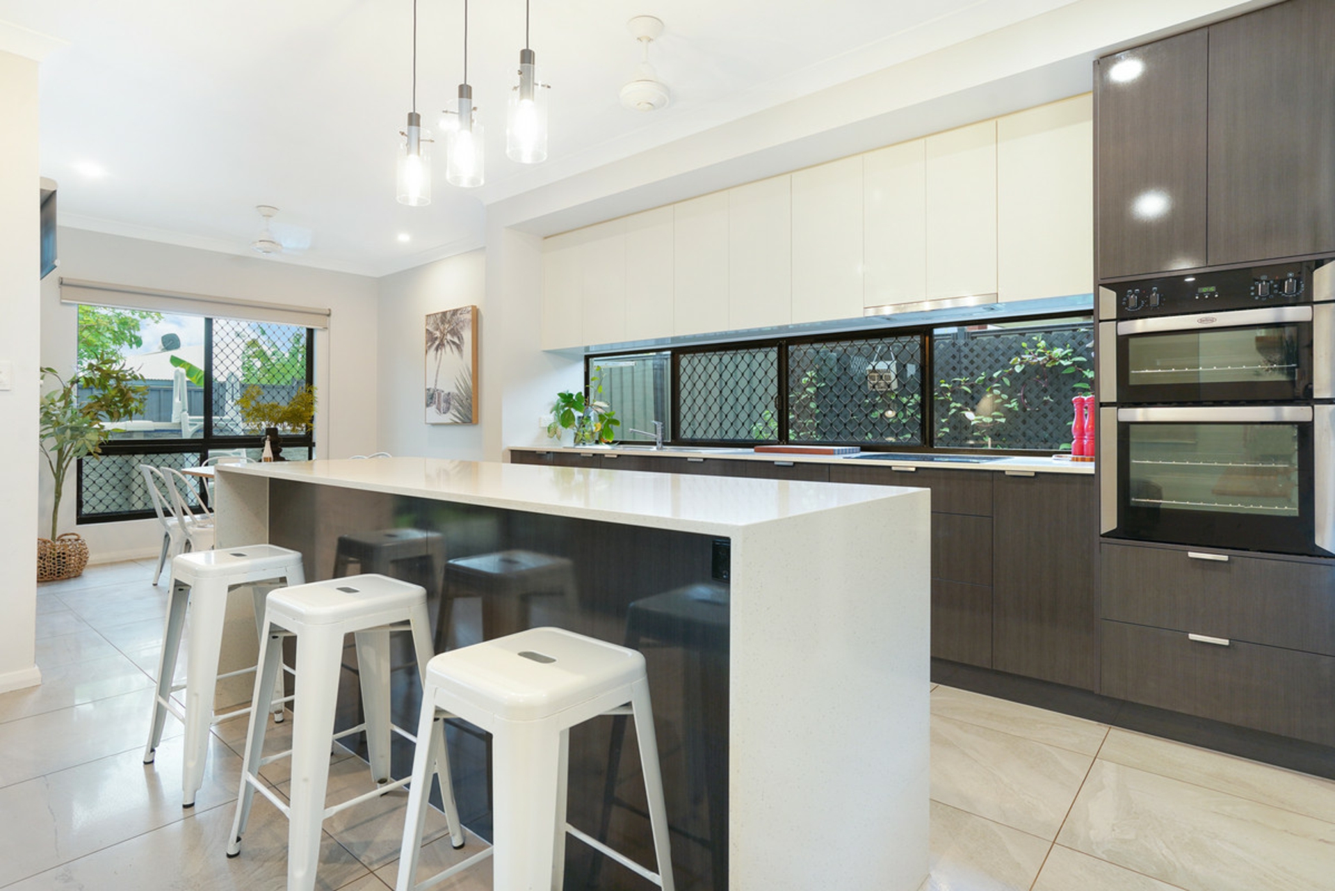 The surprises don't stop there with a stunning kitchen you would expect to see in a much more expensive home. A large island bench with dual waterfall ends and a large breakfast bar is the first thing you notice when stepping into this space. But where is the fridge you ask? This kitchen comes complete with a large butler's pantry with enough room for a fridge, microwave, heaps of prep space and storage. The long horizontal windows in the kitchen and the pantry allow both for natural to stream into the home as well as leaving room for plenty of overhead storage.