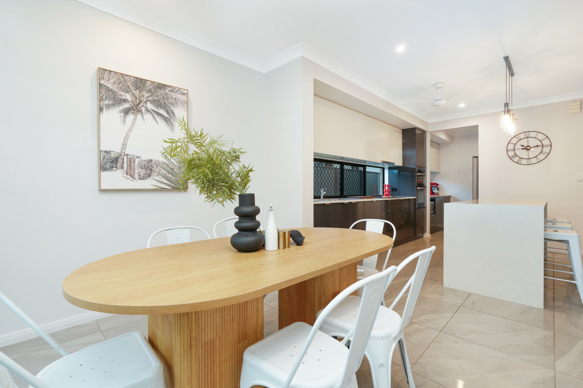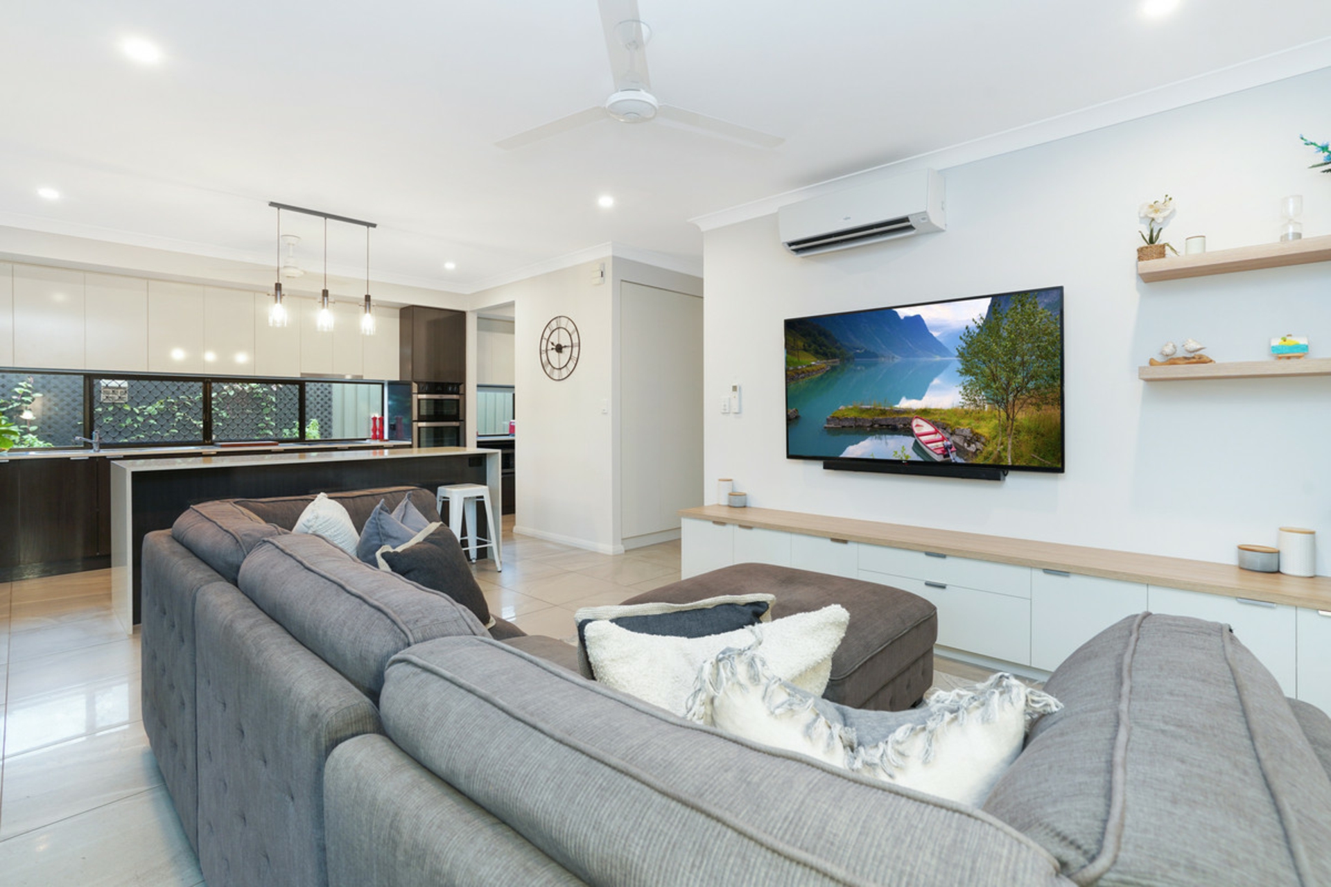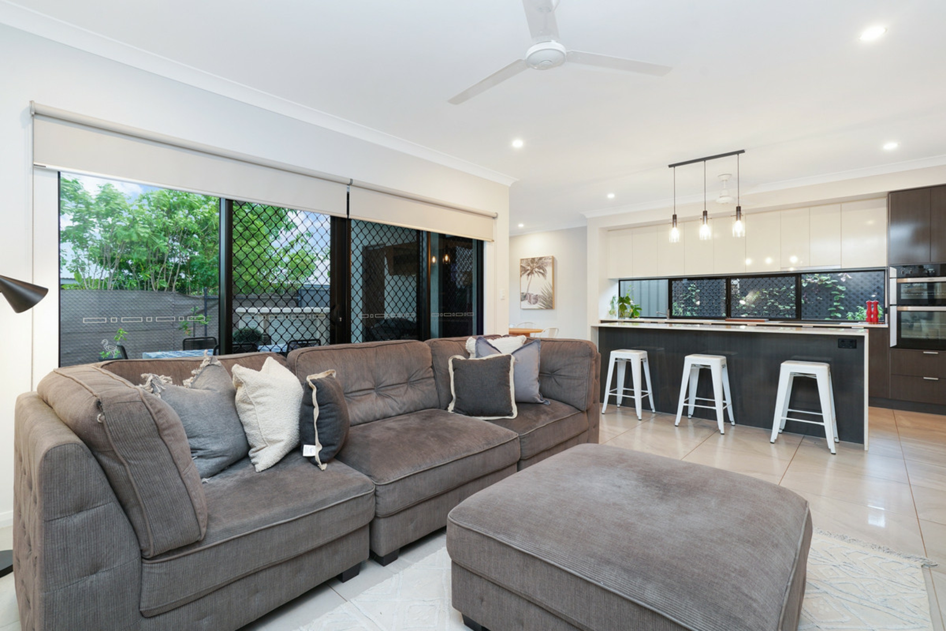 The surprises don't stop there with a stunning kitchen you would expect to see in a much more expensive home. A large island bench with dual waterfall ends and a large breakfast bar is the first thing you notice when stepping into this space. But where is the fridge you ask? This kitchen comes complete with a large butler's pantry with enough room for a fridge, microwave, heaps of prep space and storage. The long horizontal windows in the kitchen and the pantry allow both for natural to stream into the home as well as leaving room for plenty of overhead storage.
