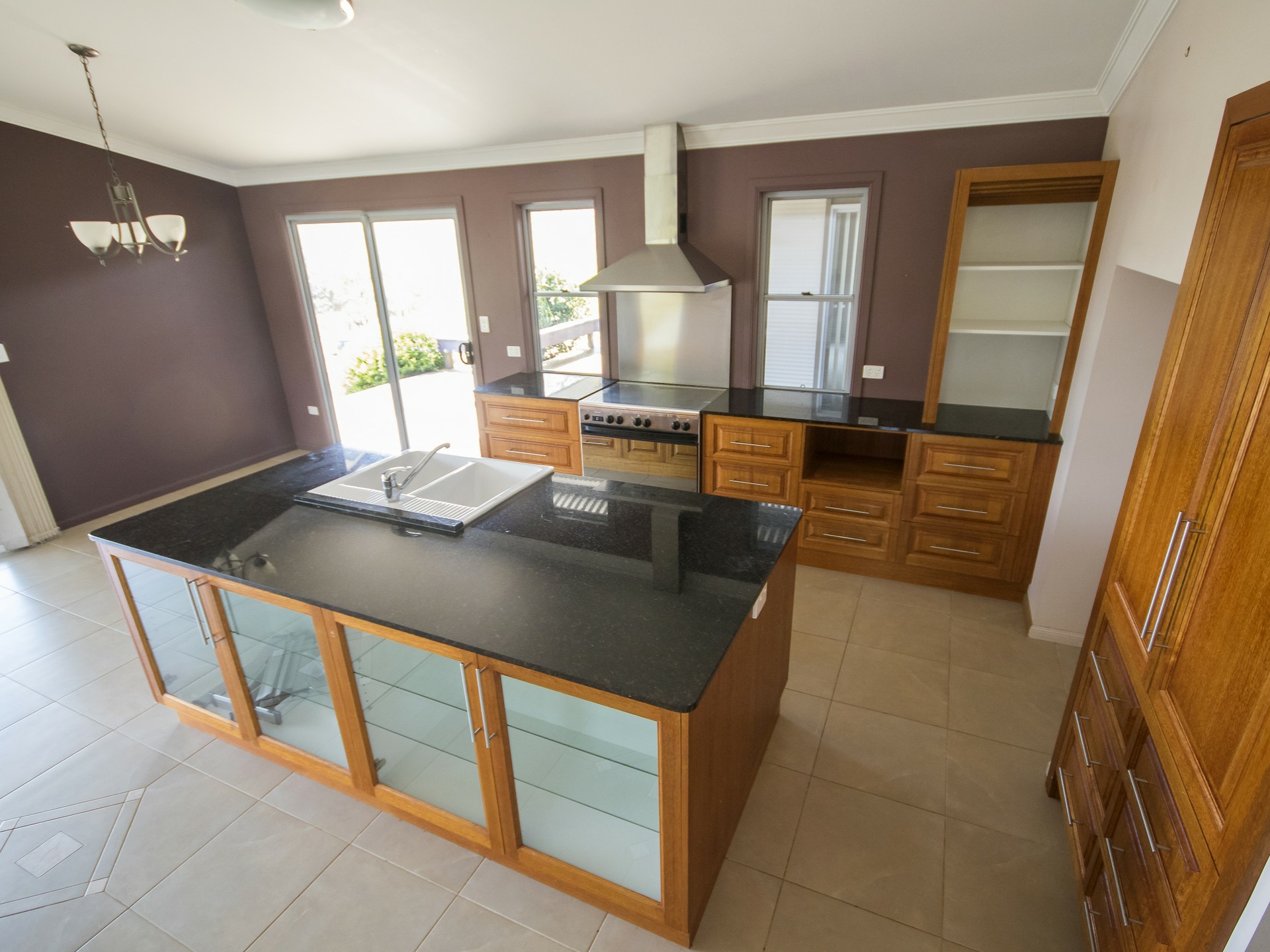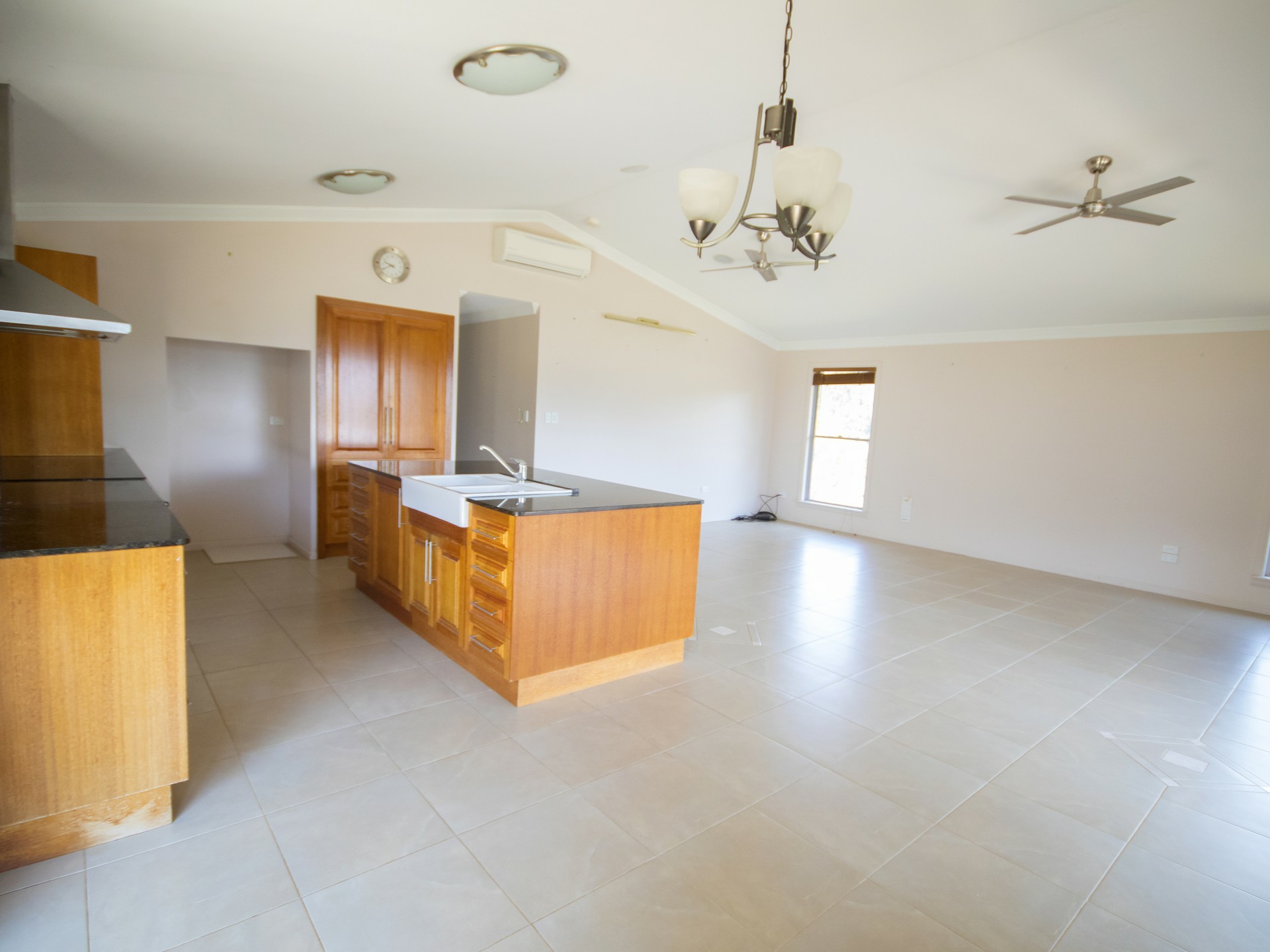 Open plan living / Kitchen area featuring raked ceilings, sound system and reserves cycle air-conditioning unit. The kitchen features storage, gas cooking appliances, and double sink the laundry is built in on the "breeze way" between the master bedroom and main home.