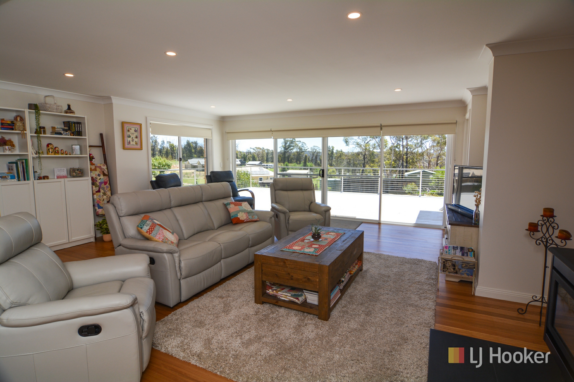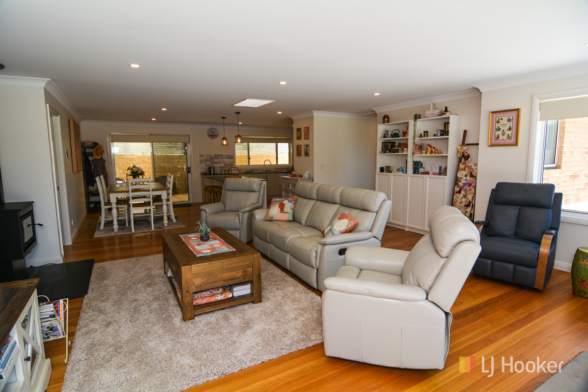 The floor plan offers 3 bedrooms including a large master suite with walk in robe and ensuite with free standing bath, quality kitchen with island bench, an open plan living and dining room with attractive polished timber floors and cosy log fire, and a modern main bathroom.