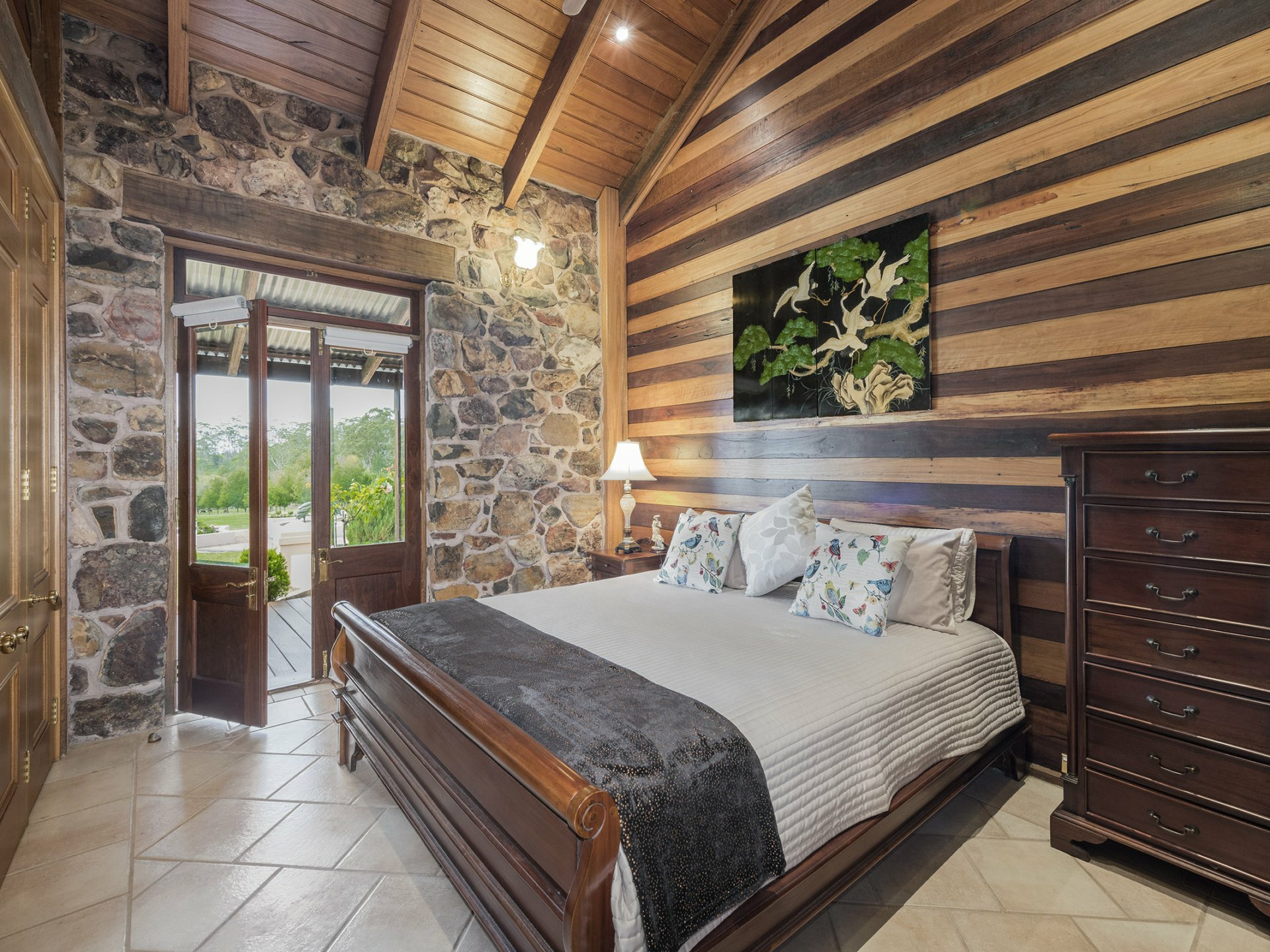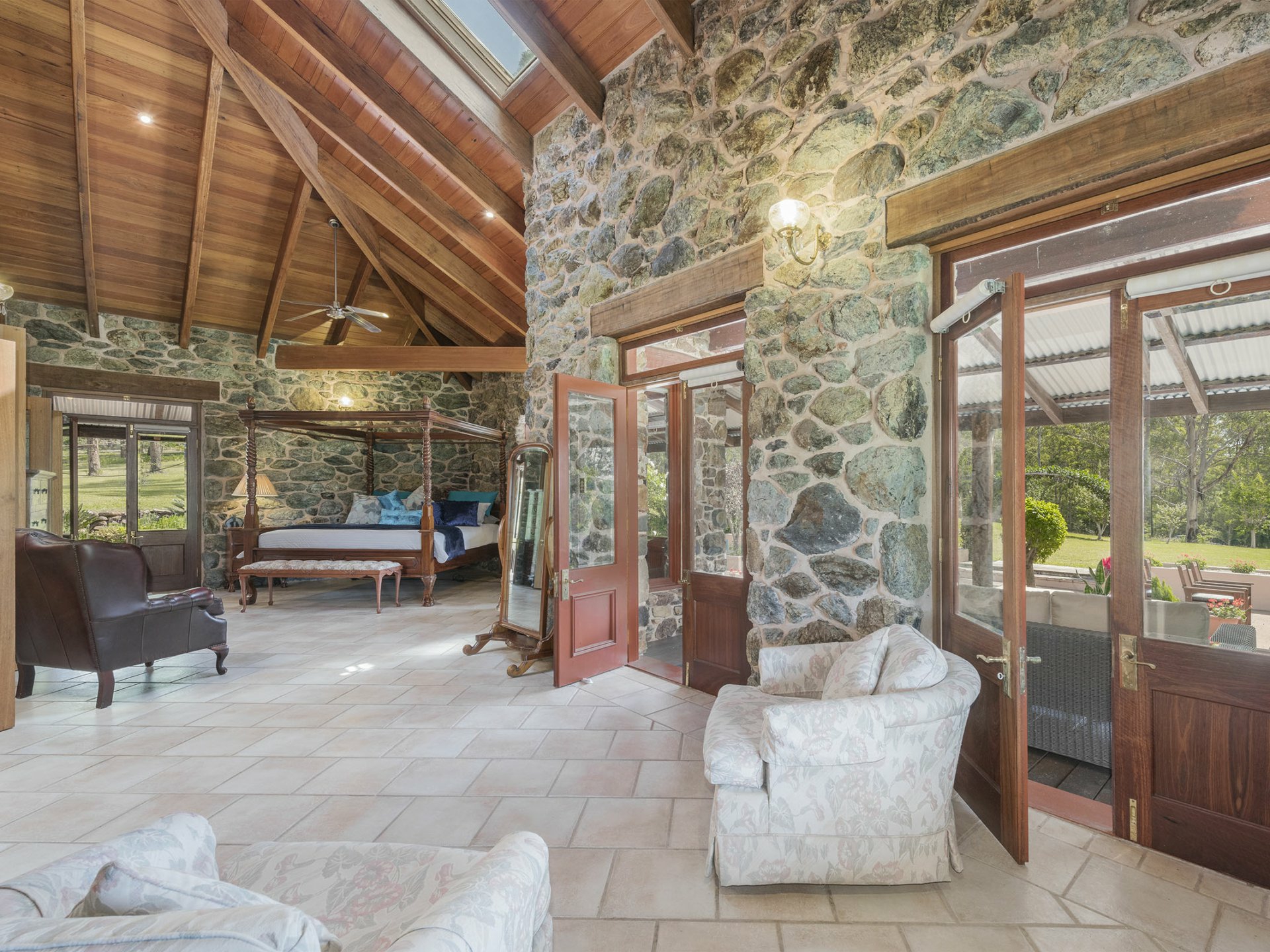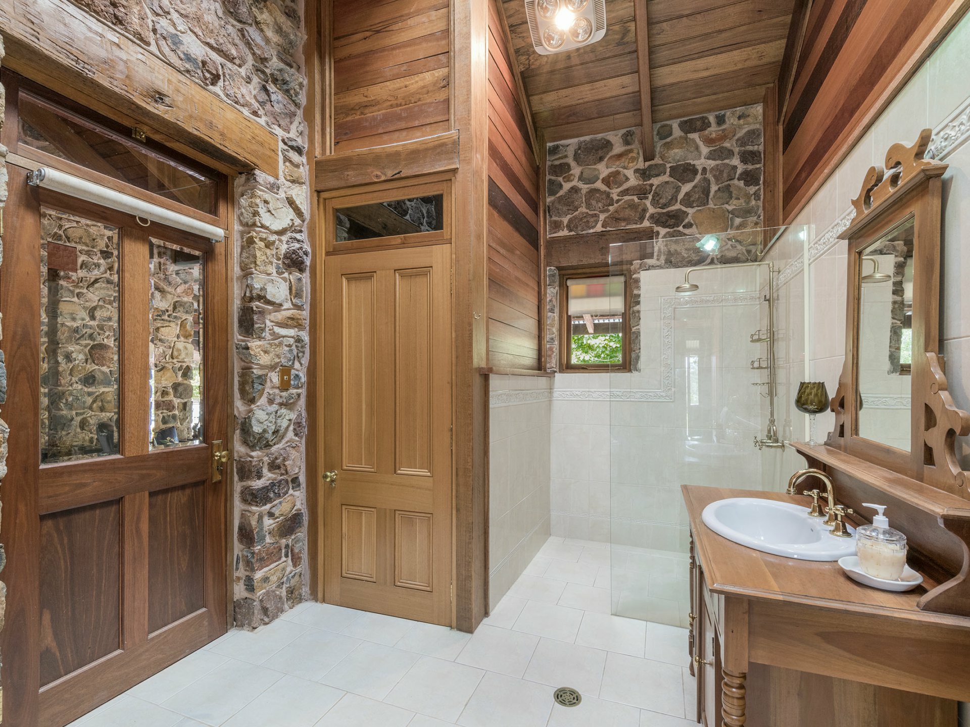 Exploring the East wing of the home you will notice the exquisite hardwood walls that have been designed to interlock for easy replacement or maintenance. Two king-size guest bedrooms both include a healthy amount of built in storage from the Tasmanian Oak robes and have easy access through to the main bathroom. Finished in a mix of timber, stone and tile to emanate visions of a lavish bed and breakfast you might find somewhere in the European countryside. It is important to note that all sleeping quarters, in fact all rooms in this home, have private passage through to the commanding 10 and 15ft wrap around hardwood verandah that hugs the exterior. A palatial master suite embodies natural Serpentine stone and includes a massive retreat or adjoining sitting room, veiled in ambient natural sunlight drawn in through the custom leadlight windows and many doors that lead outside. An enviable walk in robe accompanies this room, as well as an indulgent private ensuite bathroom complete with a huge walk in shower and classic clawfoot tub.