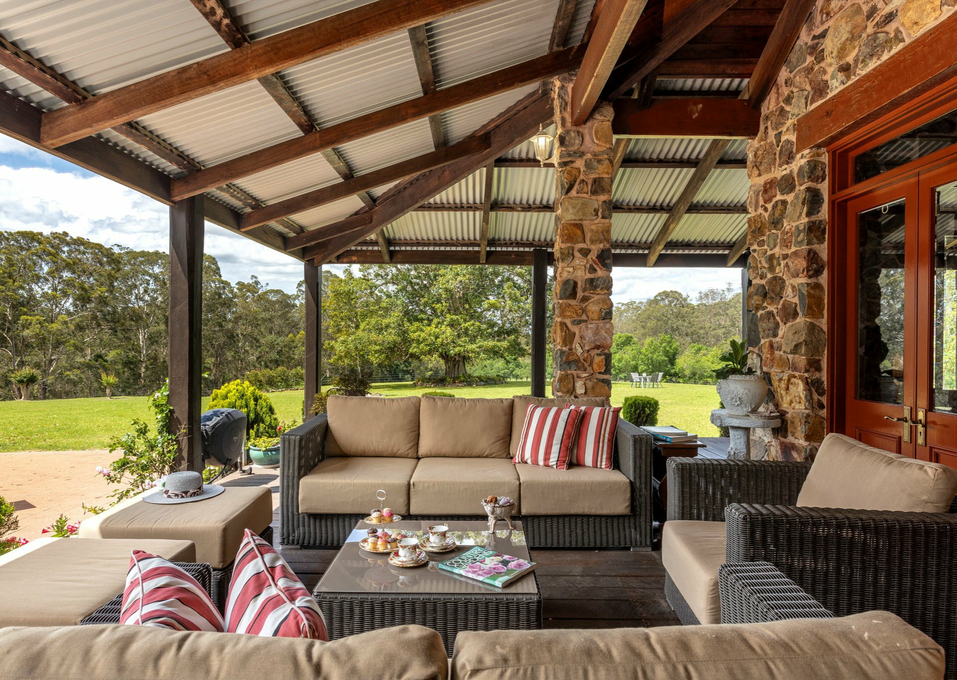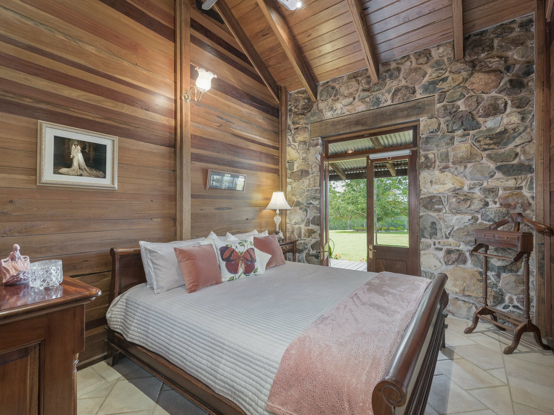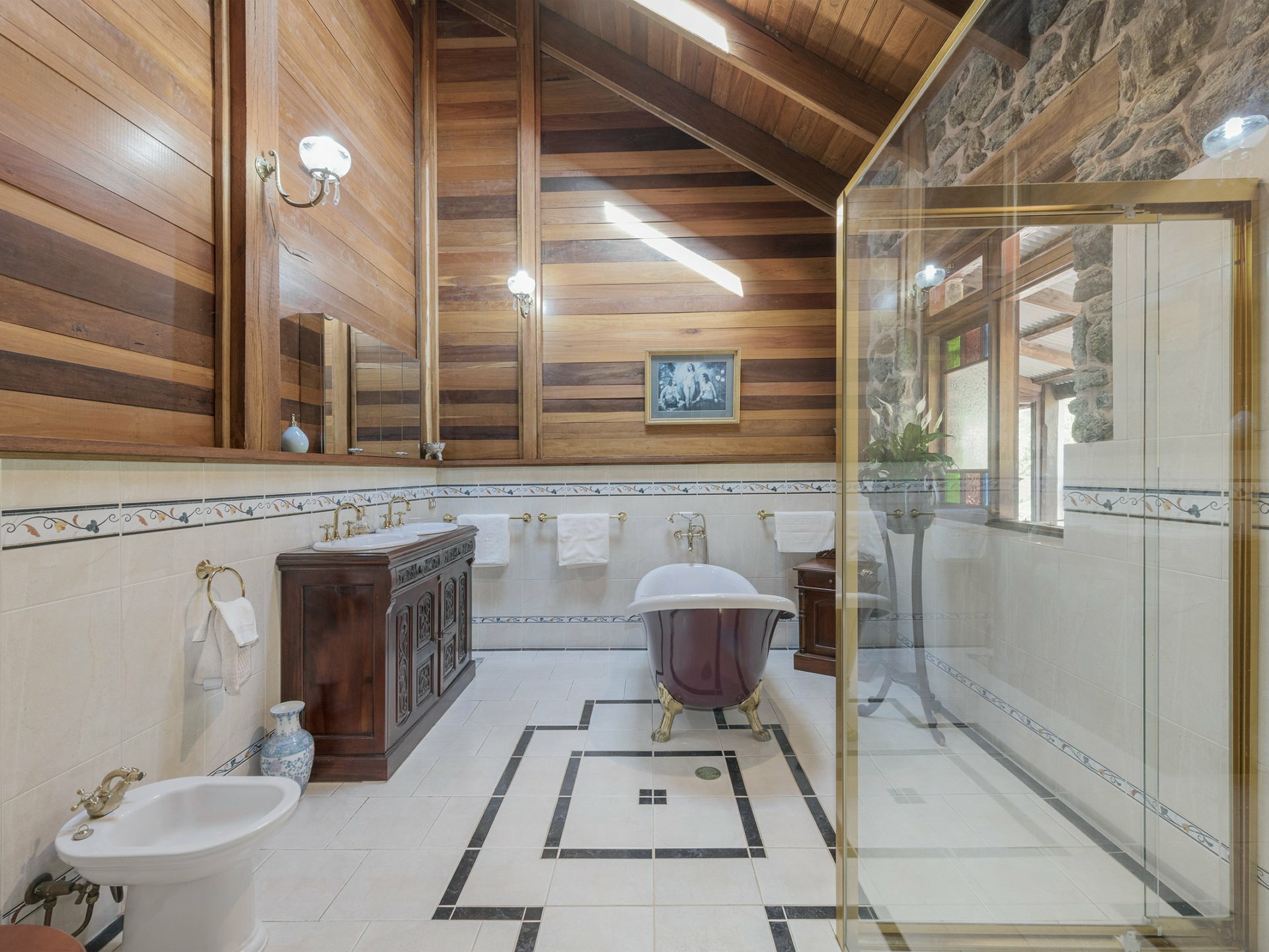 Exploring the East wing of the home you will notice the exquisite hardwood walls that have been designed to interlock for easy replacement or maintenance. Two king-size guest bedrooms both include a healthy amount of built in storage from the Tasmanian Oak robes and have easy access through to the main bathroom. Finished in a mix of timber, stone and tile to emanate visions of a lavish bed and breakfast you might find somewhere in the European countryside. It is important to note that all sleeping quarters, in fact all rooms in this home, have private passage through to the commanding 10 and 15ft wrap around hardwood verandah that hugs the exterior. A palatial master suite embodies natural Serpentine stone and includes a massive retreat or adjoining sitting room, veiled in ambient natural sunlight drawn in through the custom leadlight windows and many doors that lead outside. An enviable walk in robe accompanies this room, as well as an indulgent private ensuite bathroom complete with a huge walk in shower and classic clawfoot tub.
