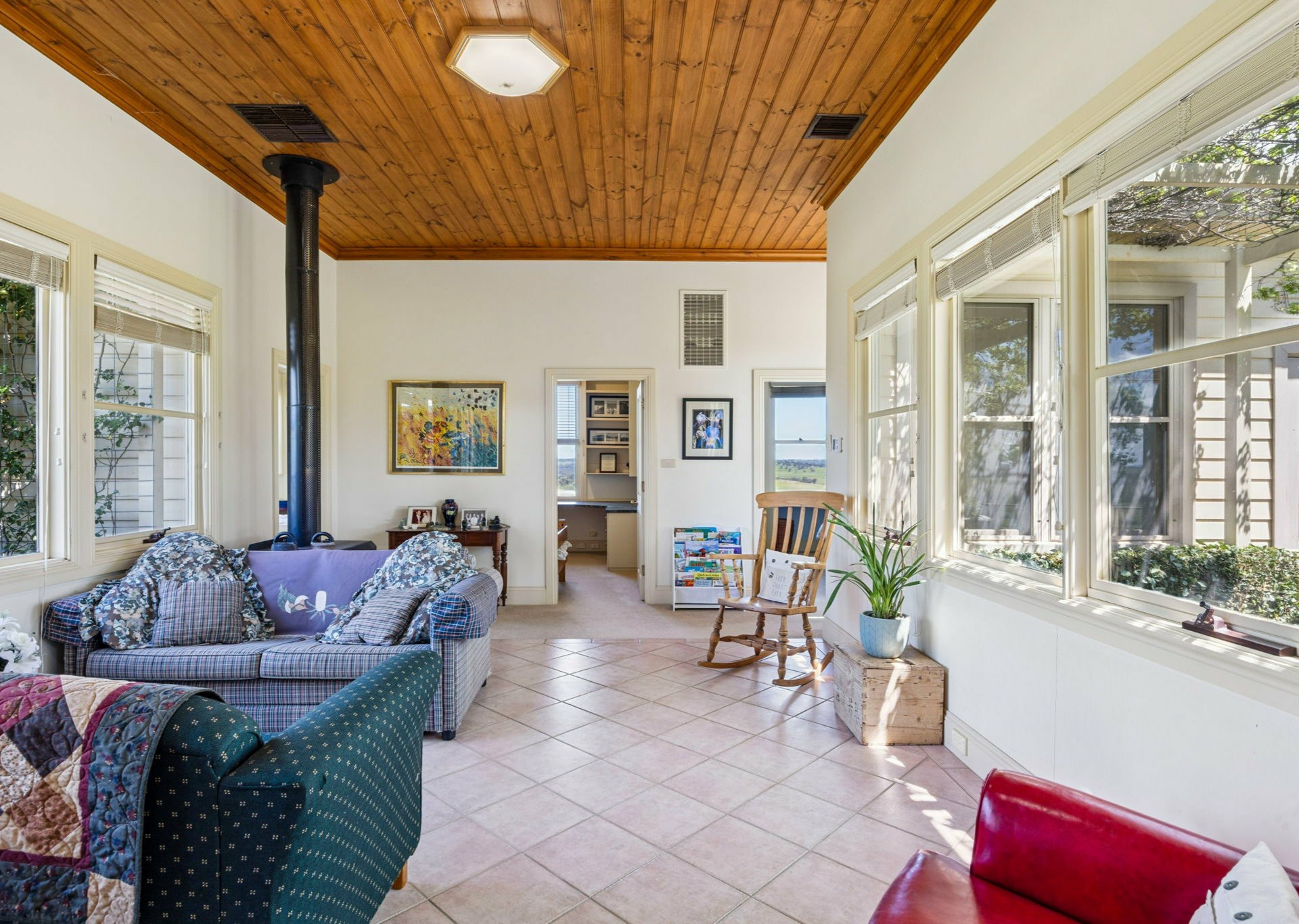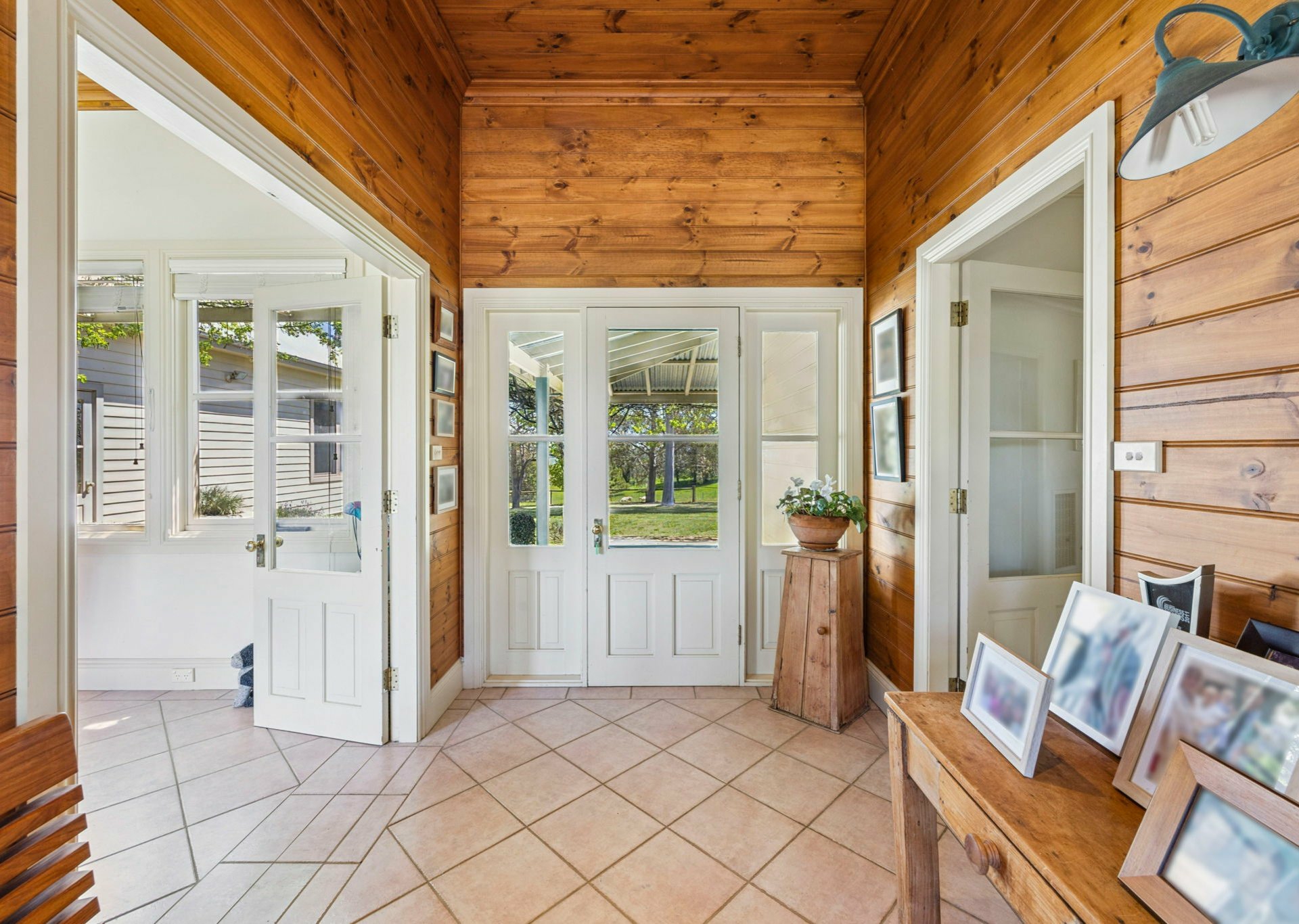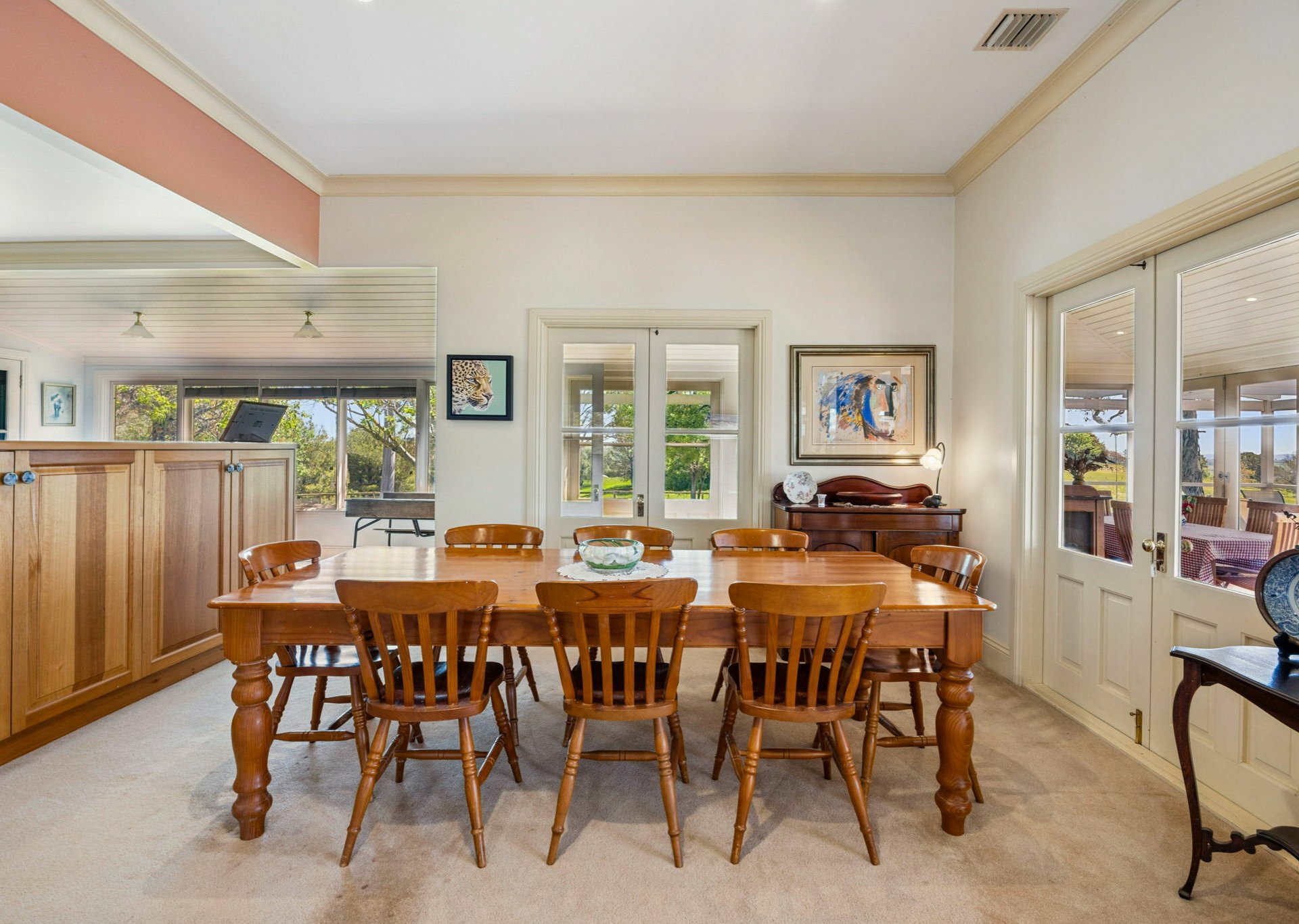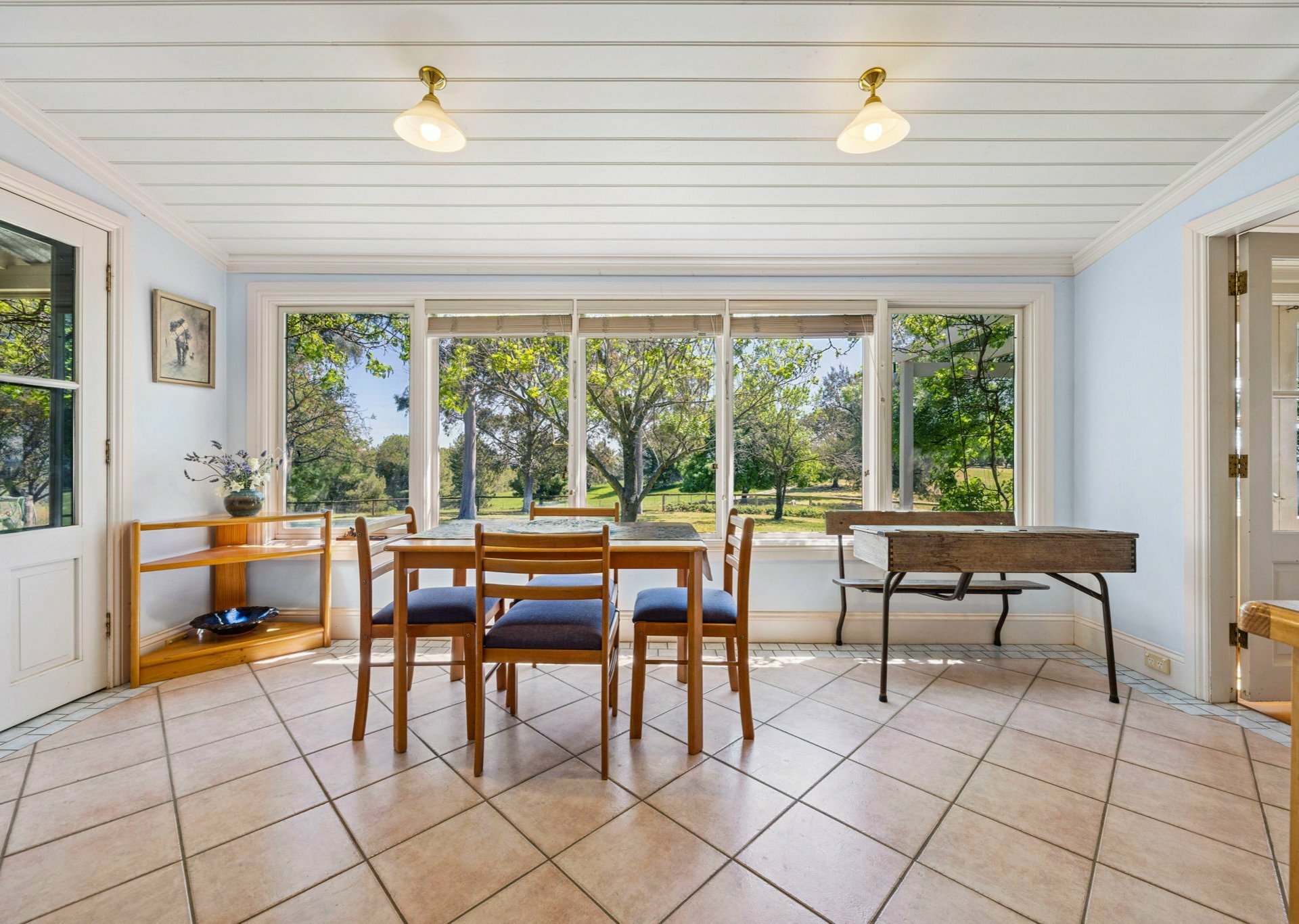 French doors connect the living area to a spacious sunroom with timber floor that runs along the whole of the northern side of the home.