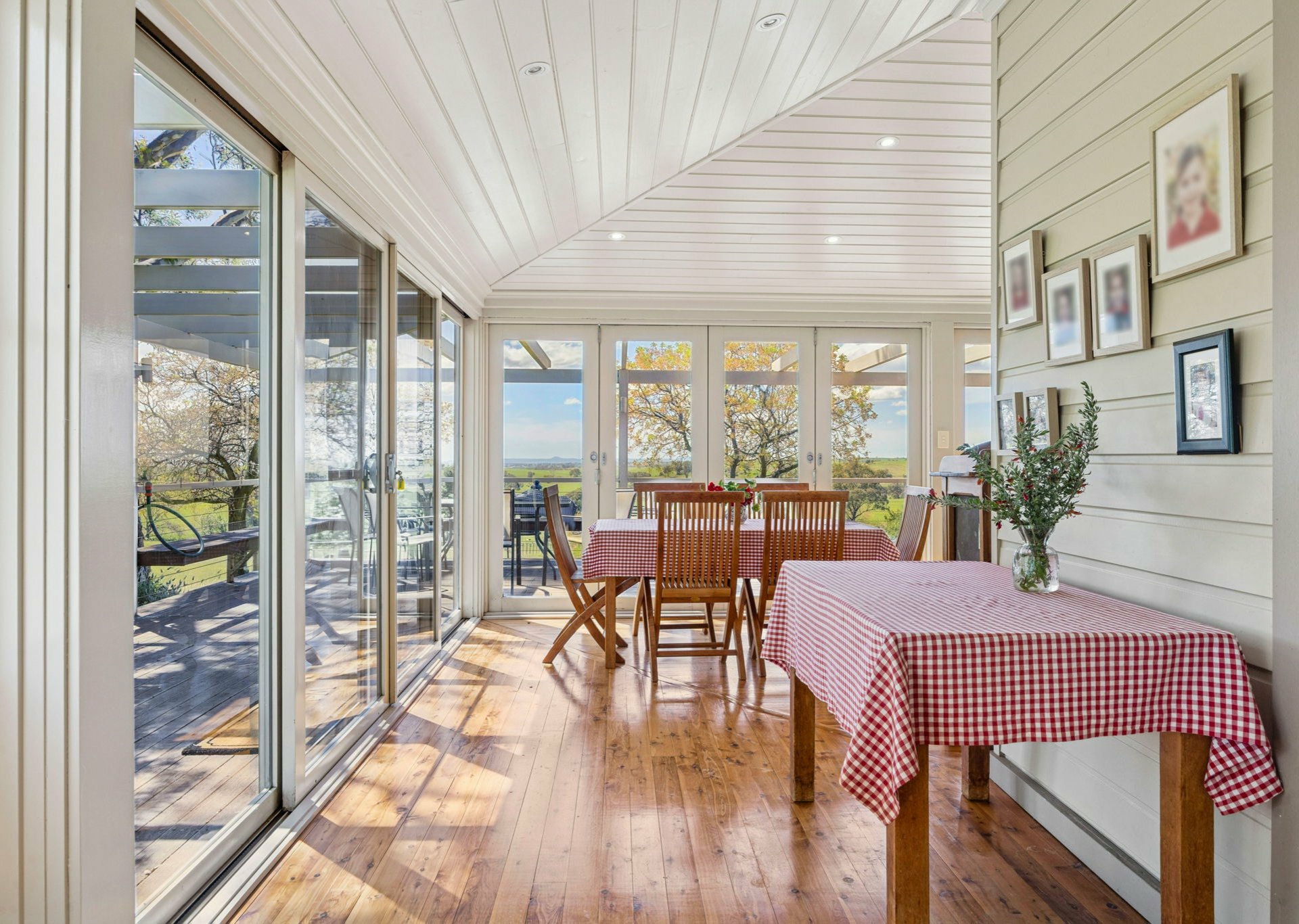 The sunroom has bifold Stegbar glass doors which open on to a large deck to incorporate the northern aspect and views.