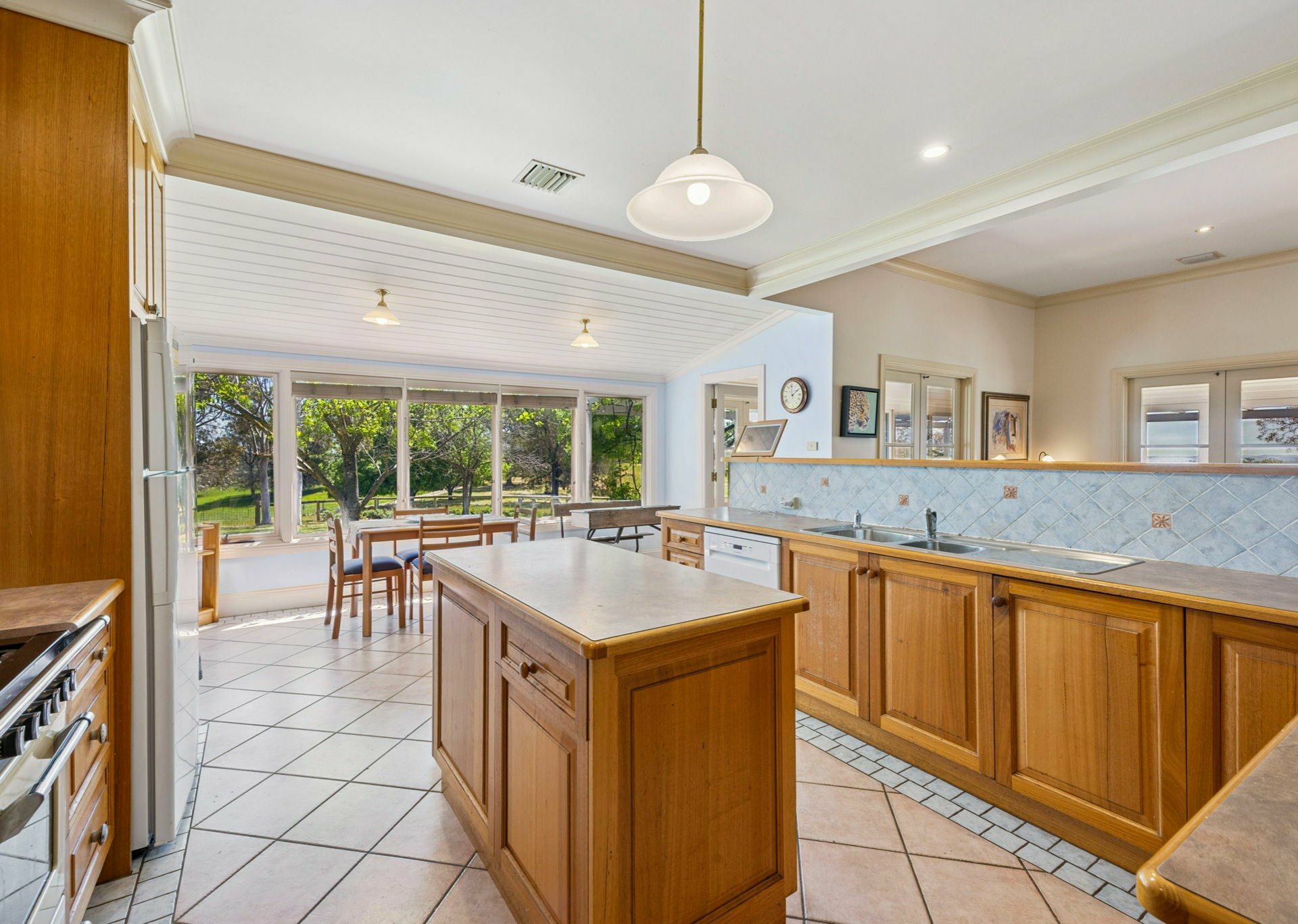 Beautifully equipped custom designed kitchen with oak timber cupboards, a movable center island with storage in drawers and tiled floor. The open plan looks over the carpeted dining and living areas.