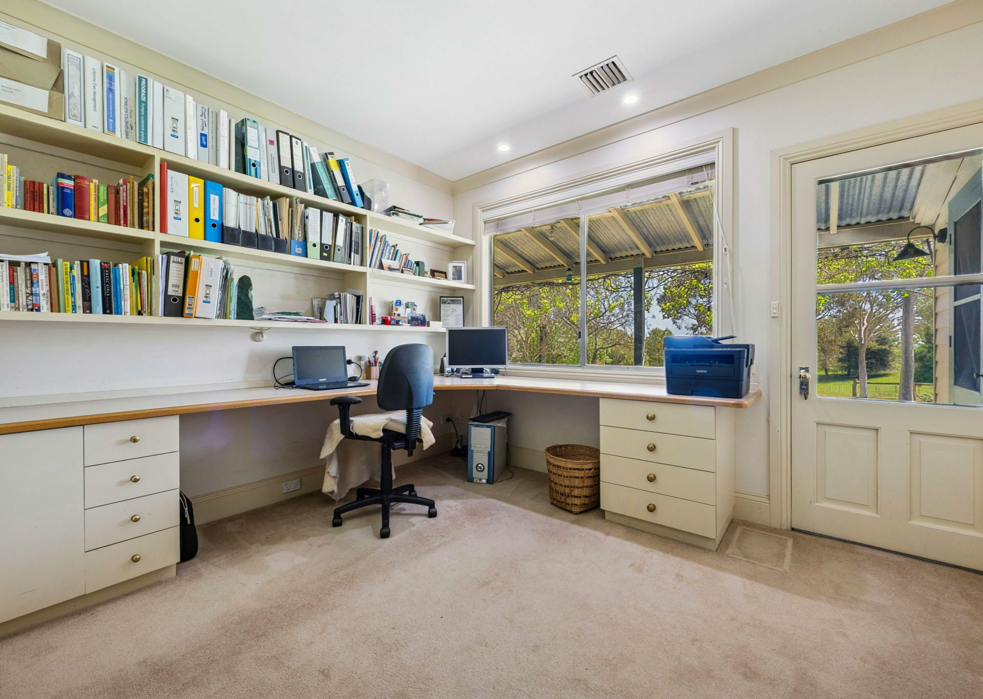 Two offices, one facing east and the other west, both look out to the garden. Each with custom-built shelving and cupboards.